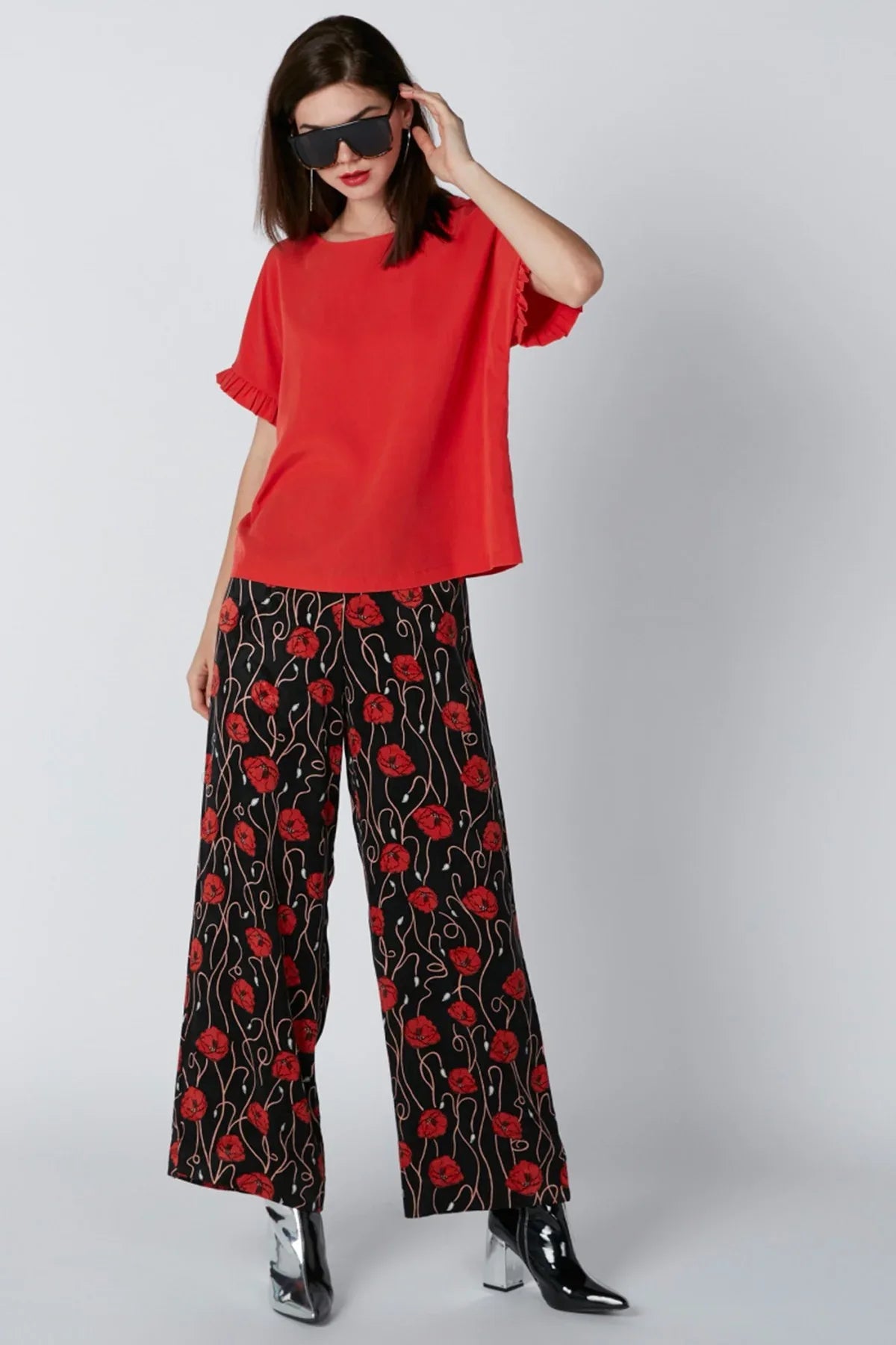 Premium quality Splash Women Boxy Top with Round Neck and Ruffle Detail Sleeves Red color