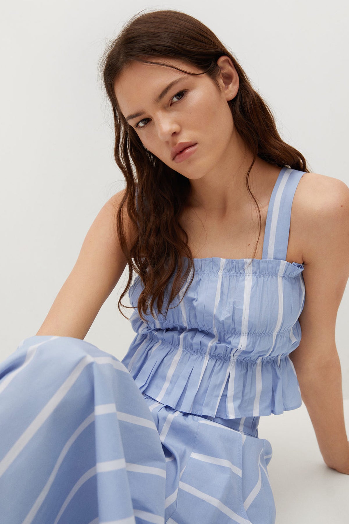 100% Cotton. Striped print. Elastic gathered section. Cropped design. Straight neck. Wide straps.