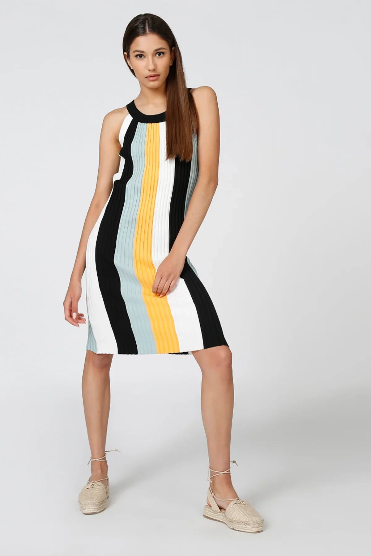 Striped Midi Shift Sleeveless Dress with Round Neck