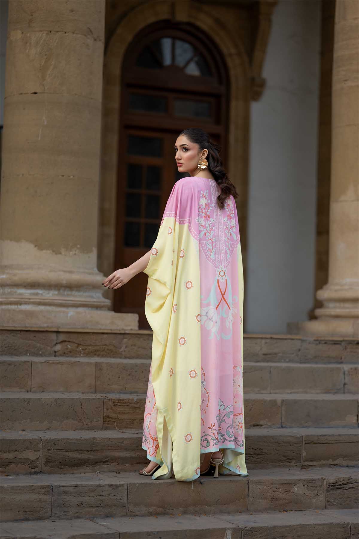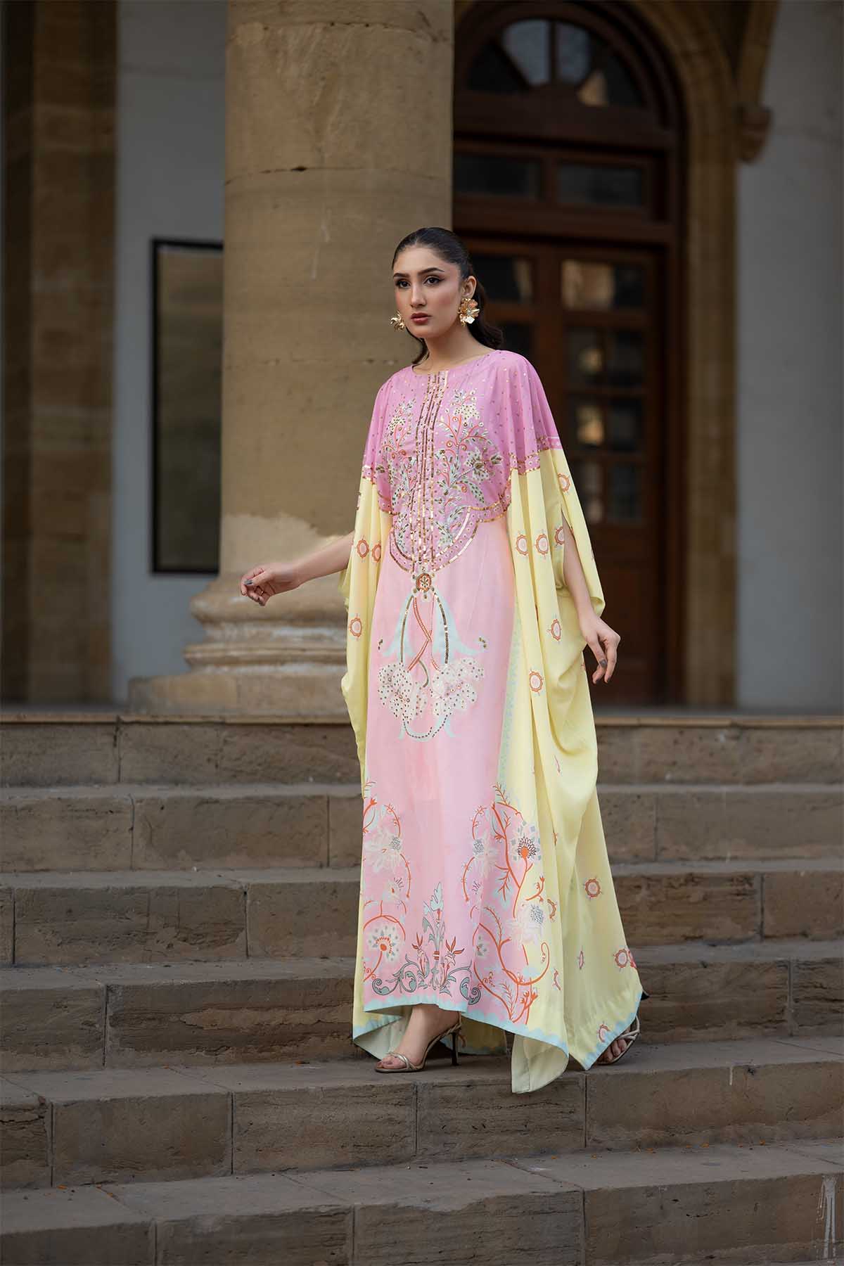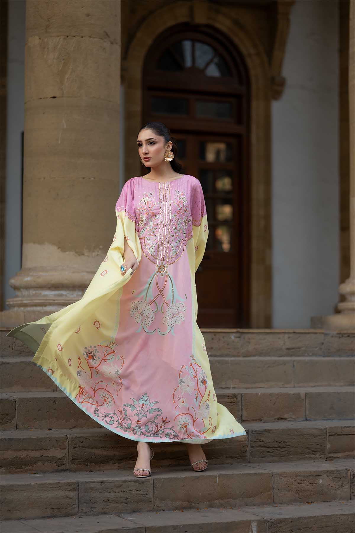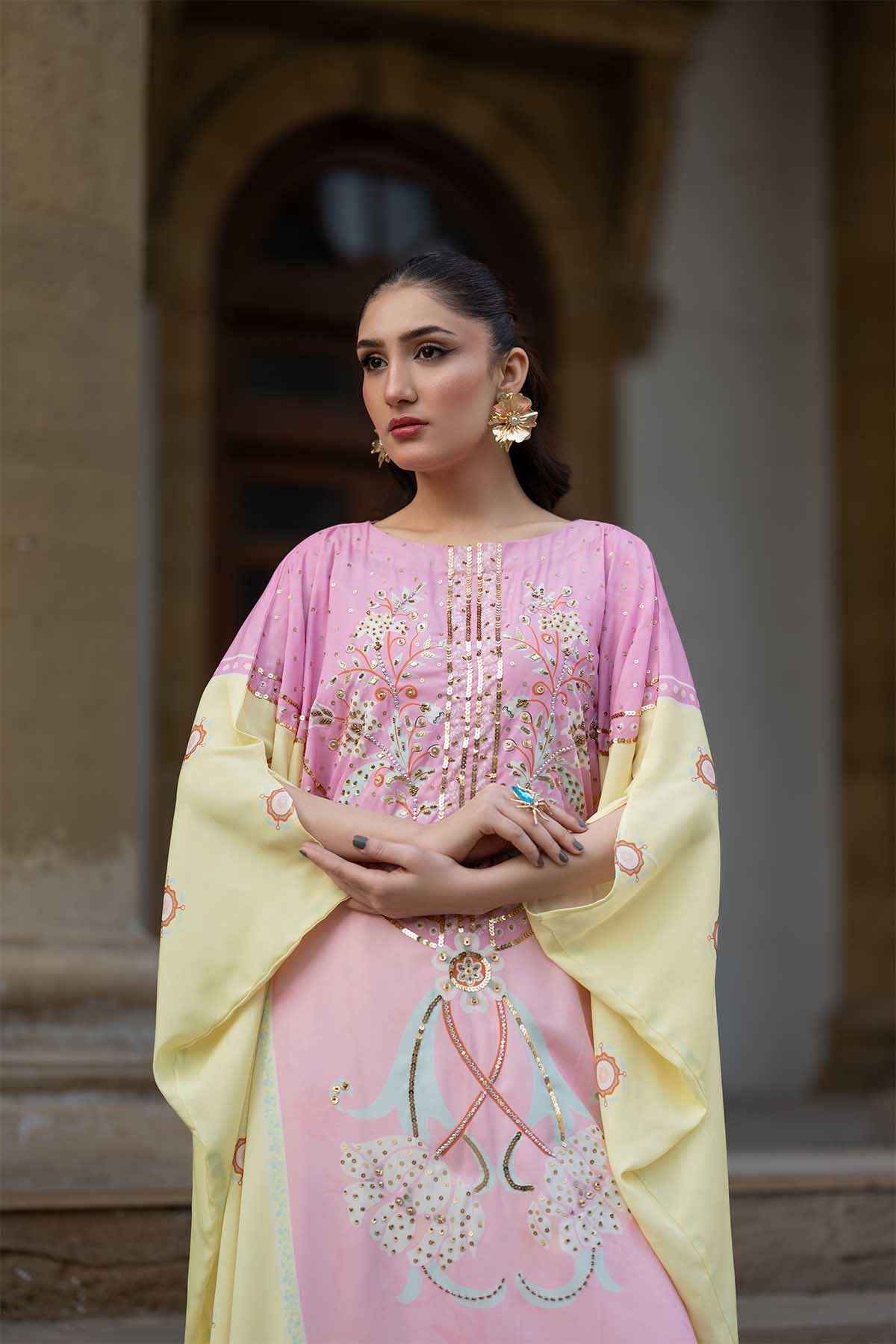Meethi Yaadein -Eid Festive:This Elegant Kaftan-Style Crepe Georgette Dress Blends Soft Femininity With Ornate Craftsmanship. Rendered In A Delicate Blush Pink Base, The Silhouette Flows Effortlessly With A Relaxed, Floor-Length Cut That Drapes Gracefully Over The Body. The Front Is Adorned With Intricate Floral And Vine-Inspired Embroidery, Highlighted With Fine Beadwork And Metallic Accents That Add Subtle Shimmer And Depth.