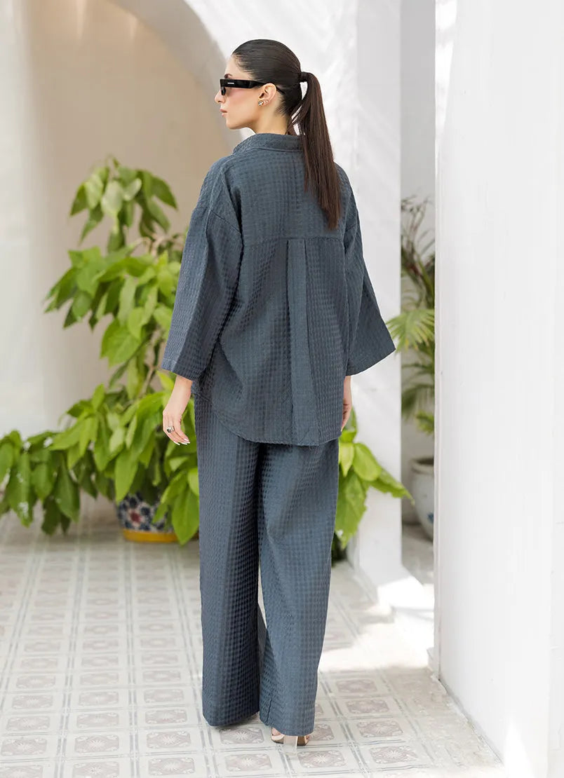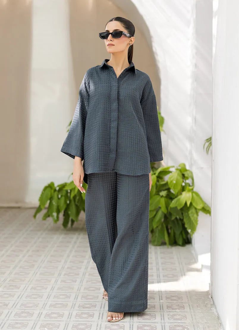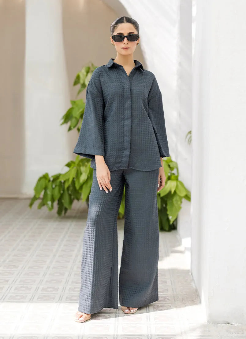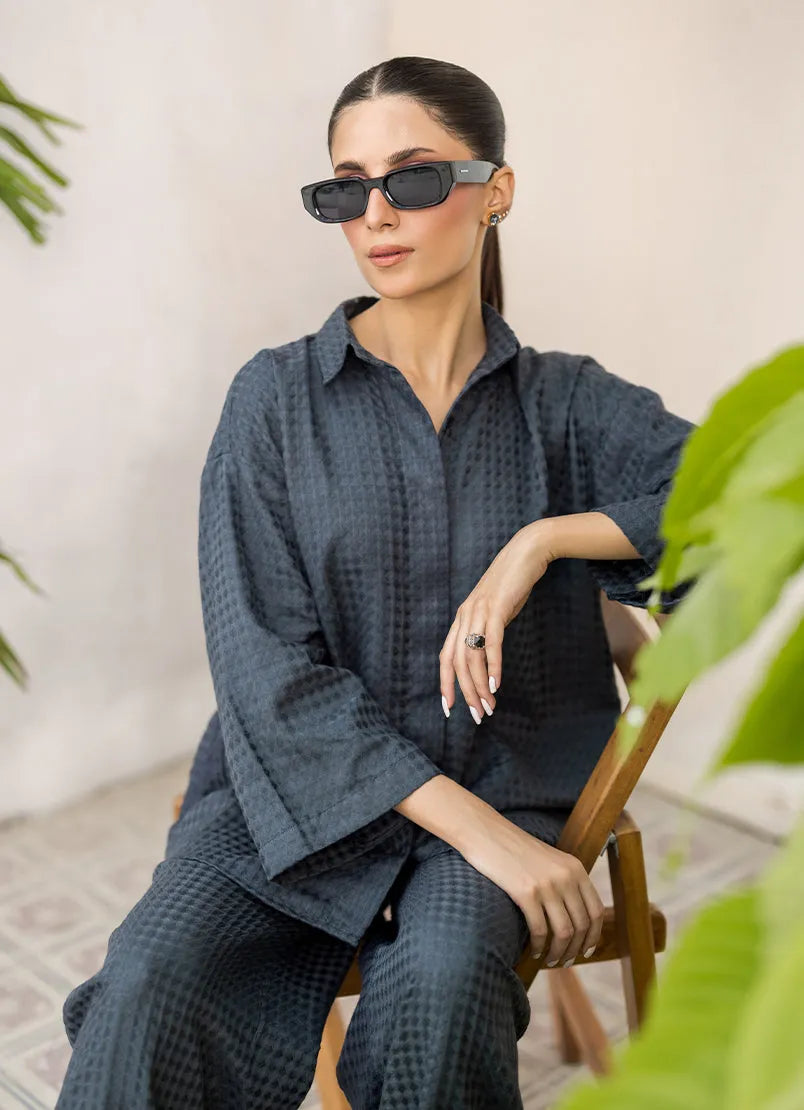 Charcoal Charm Set is a 2-piece ensemble crafted from breathable cotton khaddar in a deep charcoal hue. The outfit features a smart button down fusion top paired with stylish bell bottom pants, offering a modern and effortlessly chic look perfect for everyday wear.