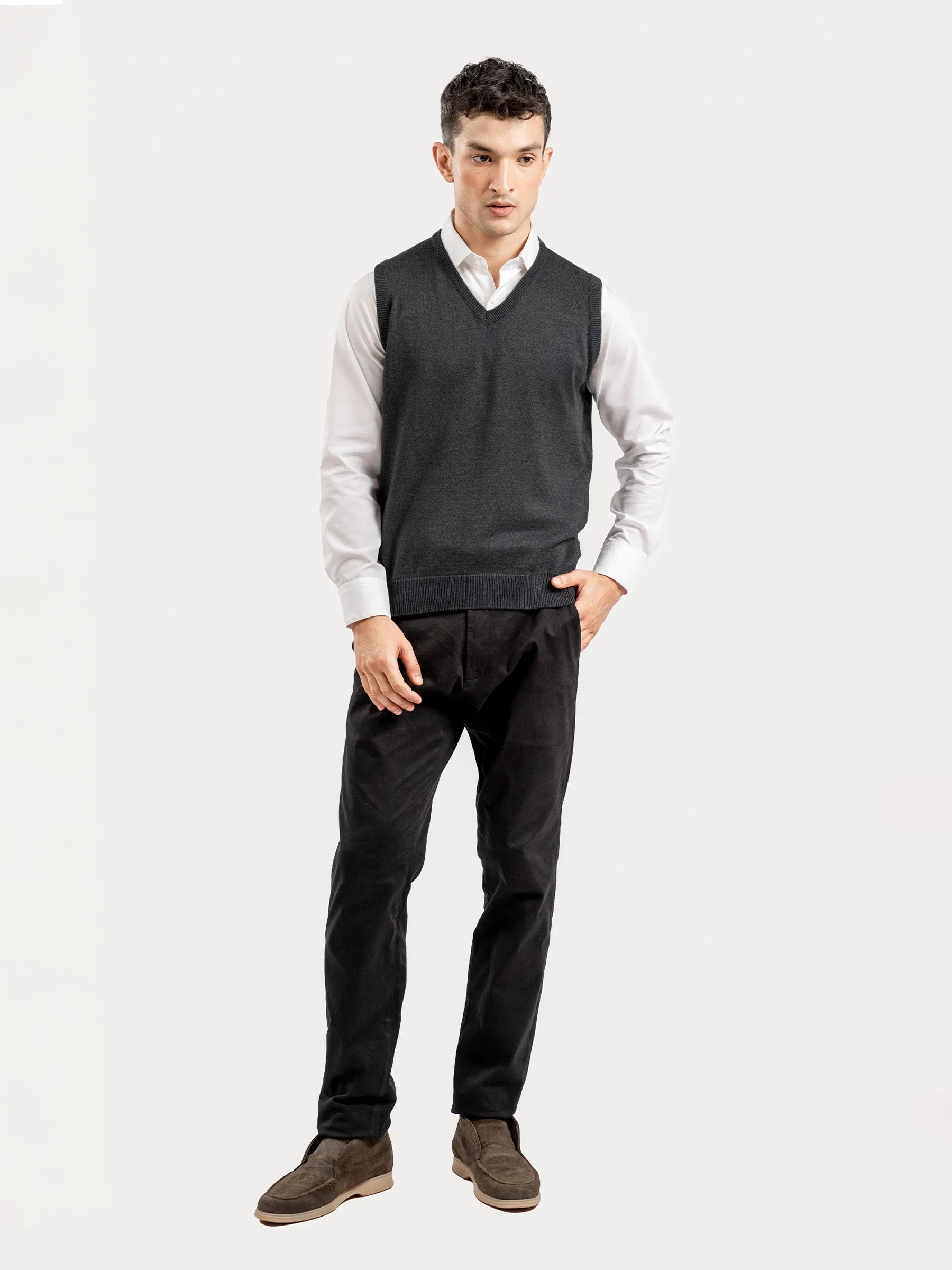 A timeless layering essential, this charcoal sleeveless v-neck sweater offers a sleek and versatile look. Light in weight, its perfect for pairing over shalwar kameez or under blazers, it brings comfort and refined style to both casual and formal outfits.