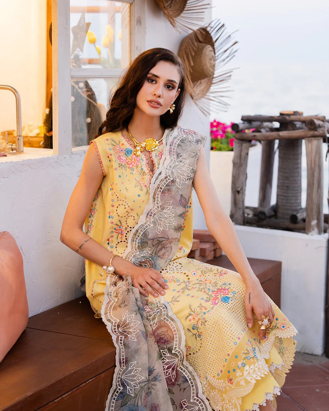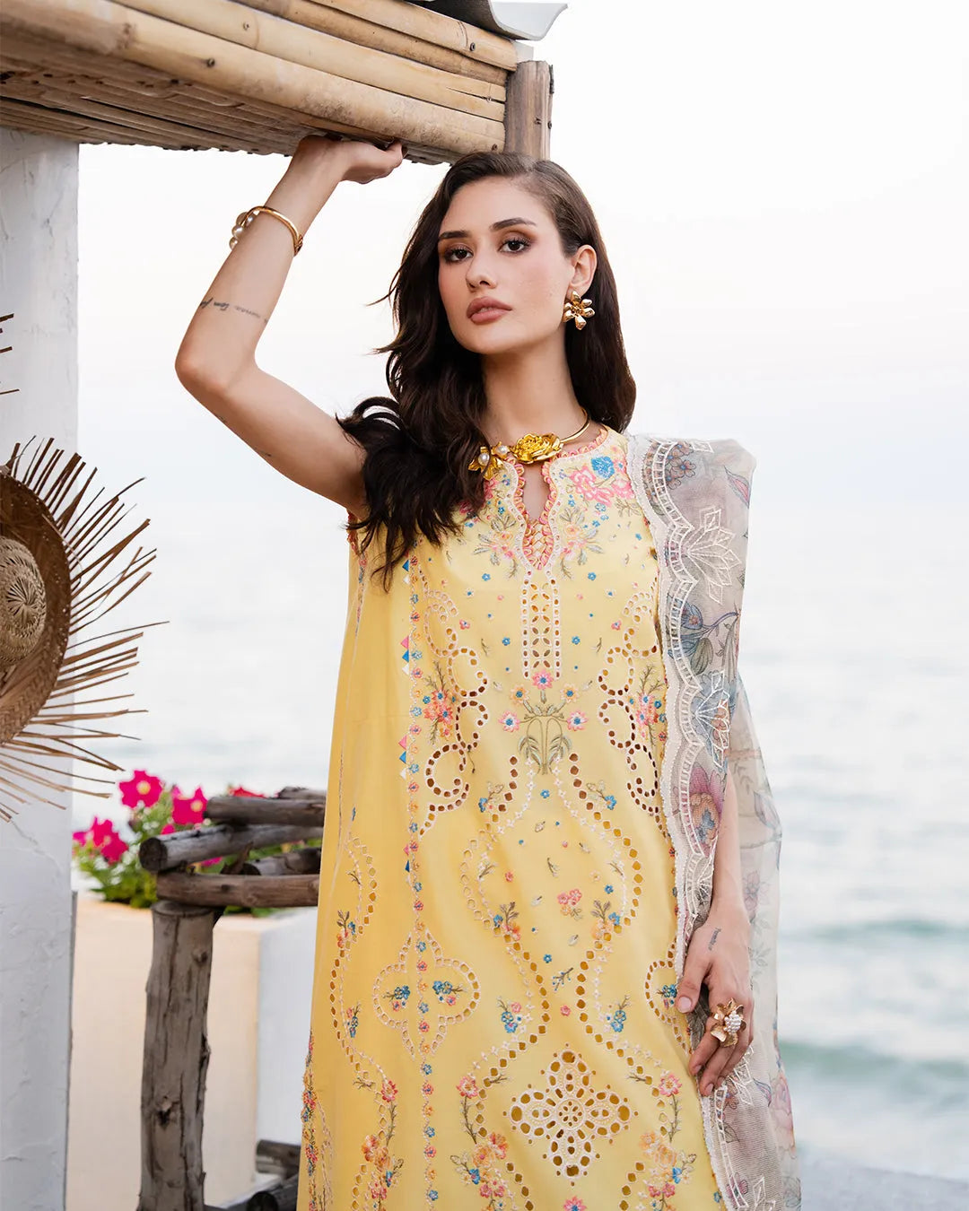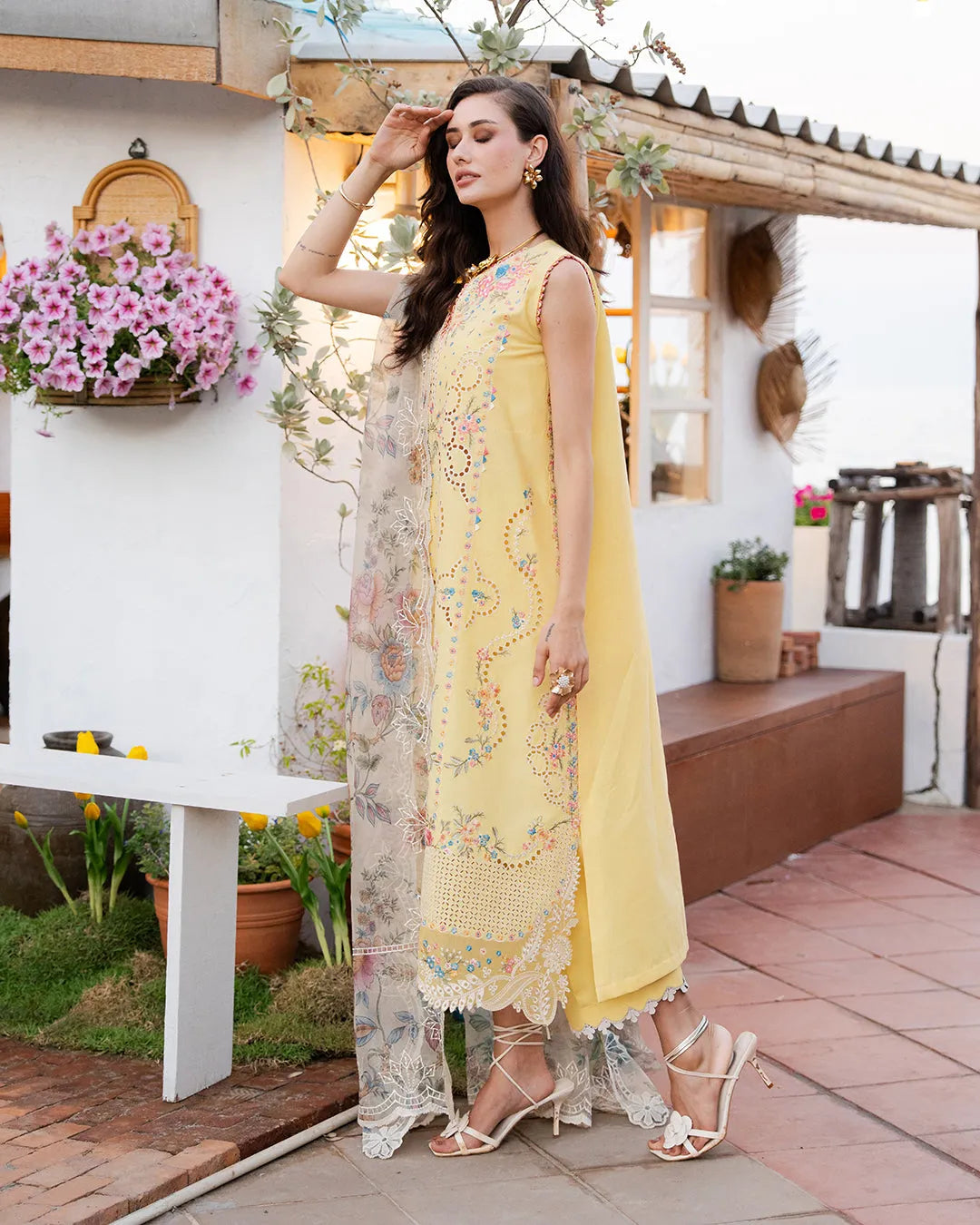 Citrine is a refined Lawn suit in warm butter yellow, designed for those who appreciate understated luxury. Bold embroidered details and an elegant A-line silhouette create a striking impression, while the coordinated dyed cotton trousers and print embroidered net dupatta complete a cohesive, sophisticated ensemble perfect for special occasions.