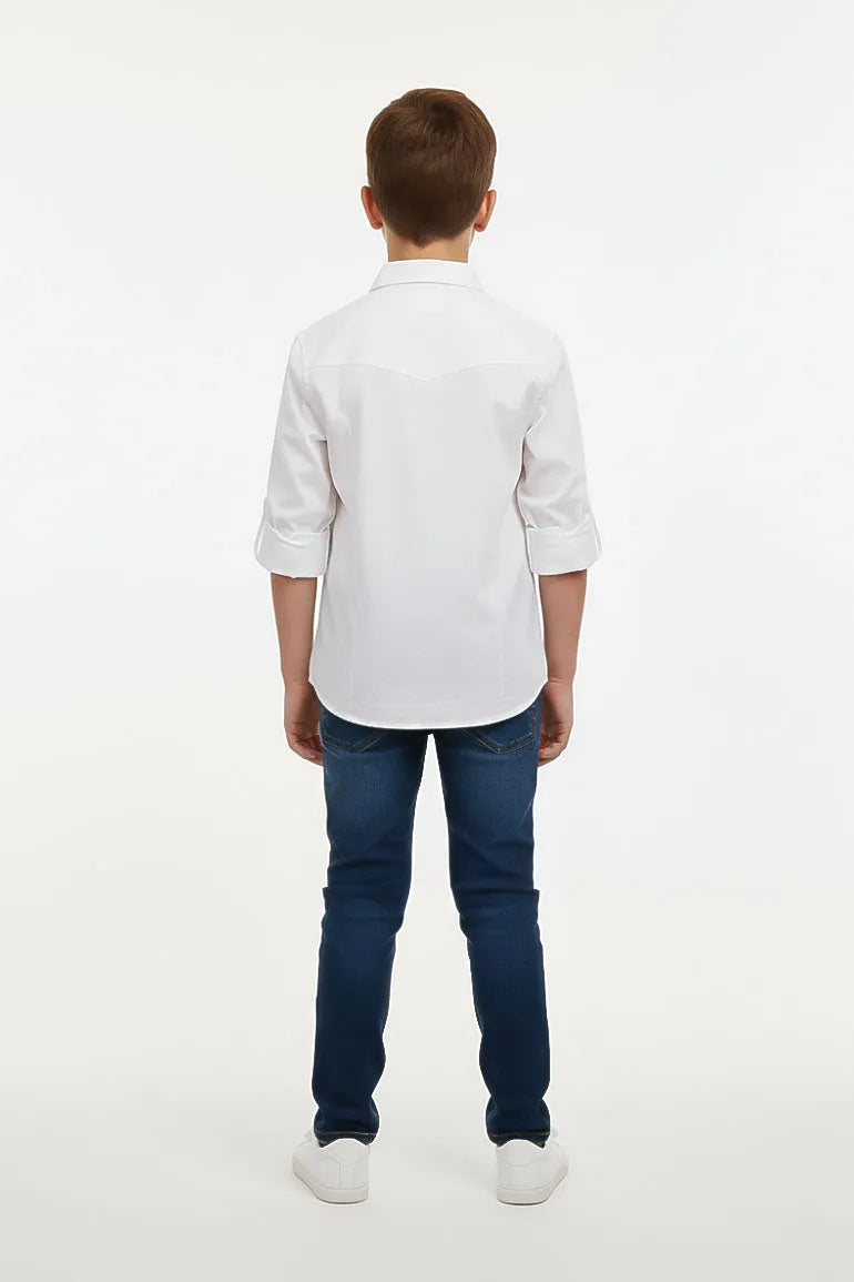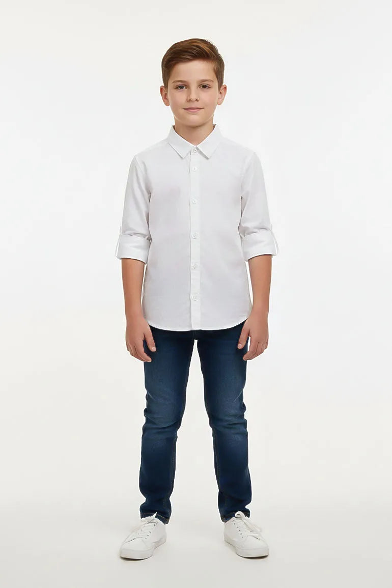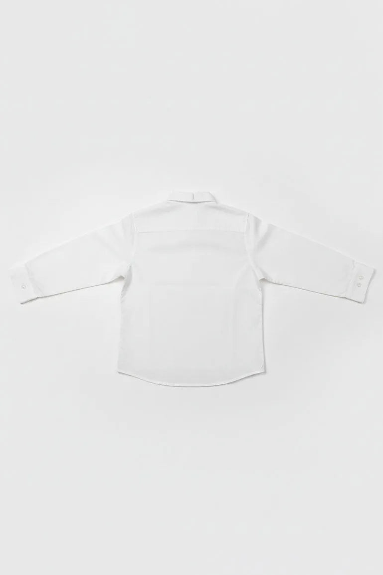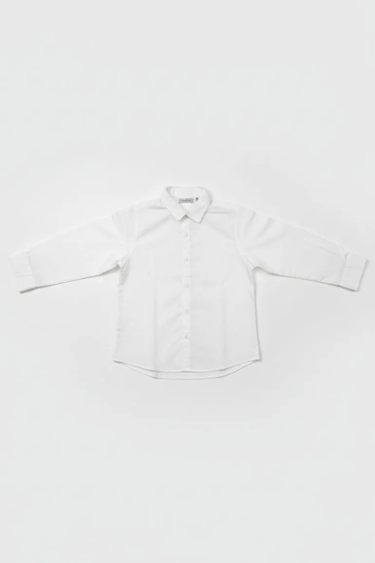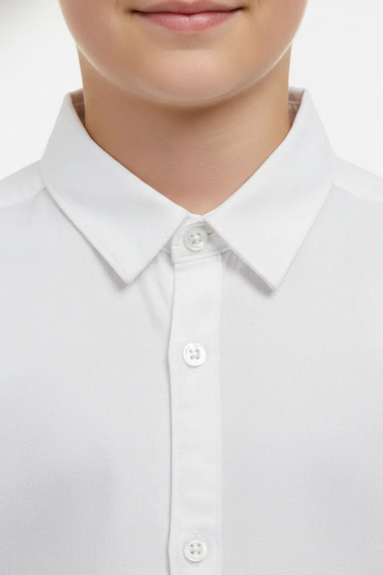 A crisp white button-down shirt crafted in a clean, tailored silhouette. Designed with a pointed collar, full-length sleeves, and a softly curved hem for a polished look. Made from lightweight, breathable fabric, it’s ideal for formal occasions, school events, or smart everyday wear.