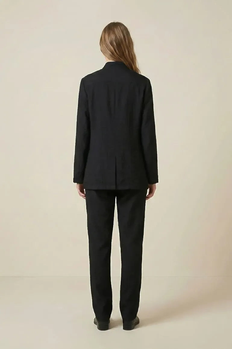 A sleek black co-ord set featuring a textured tailored jacket paired with matching straight-leg trousers. Designed for a refined yet modern look, it offers comfort, structure, and effortless elegance. Perfect for workwear, formal outings, or elevated everyday styling.
