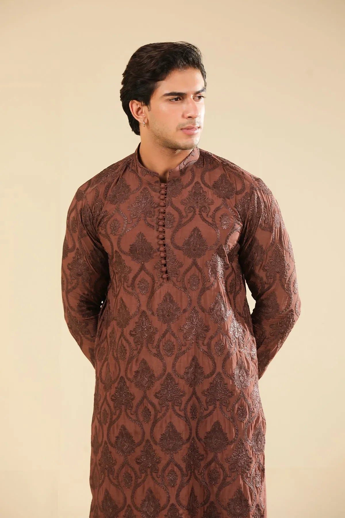 Faris - Cocoa Brown Raw Silk Embroidered Kurta Trouser - Men