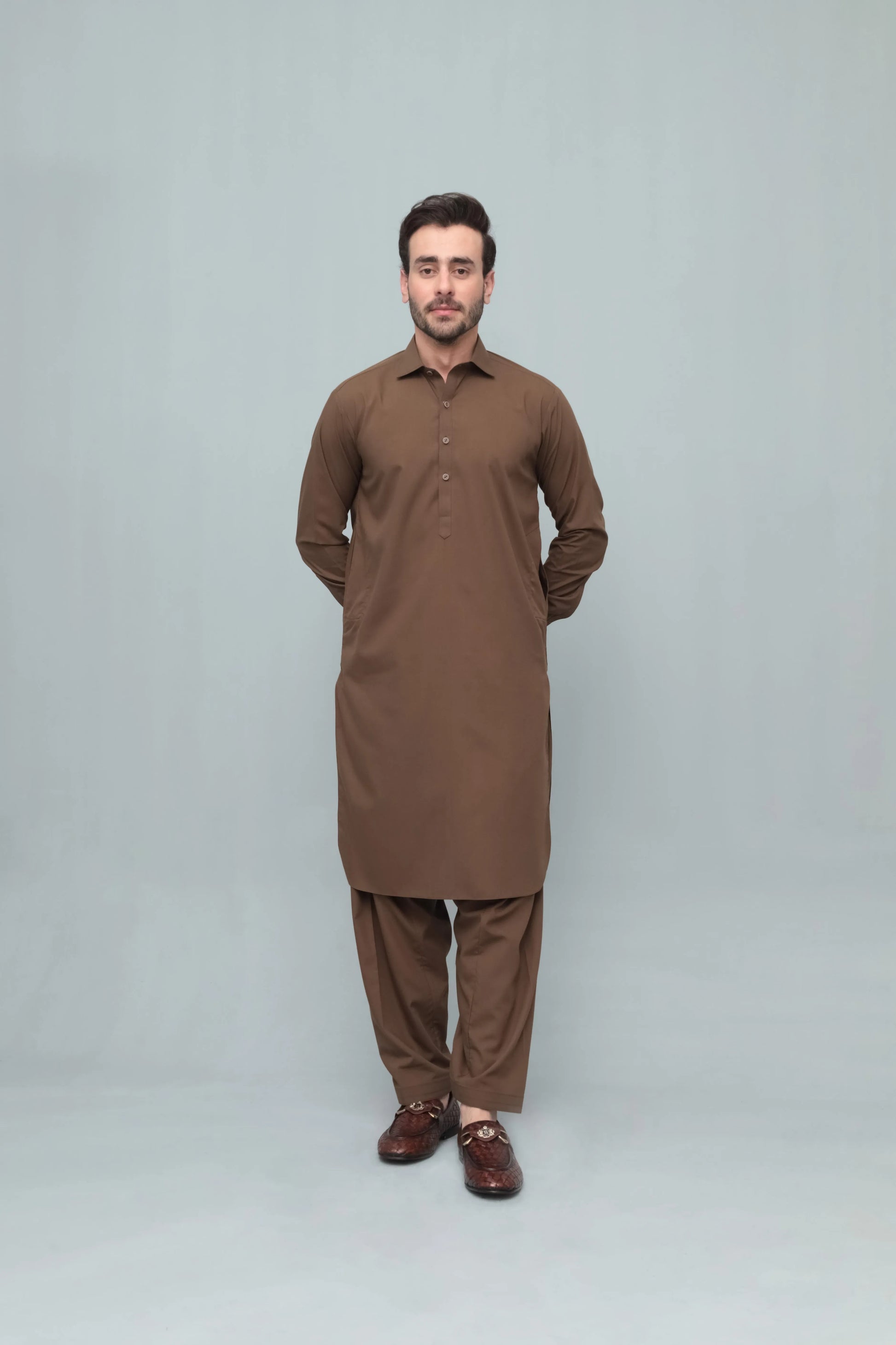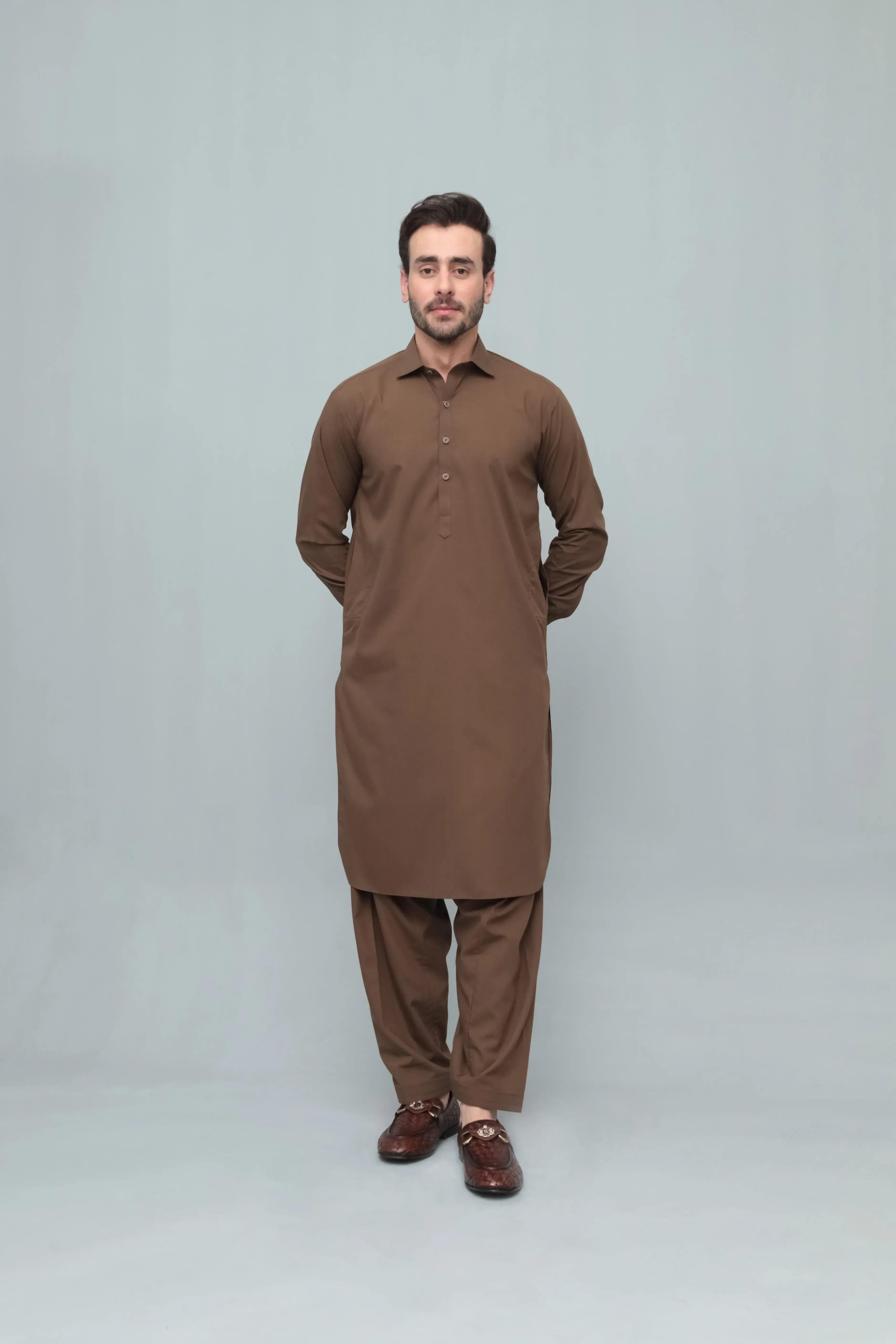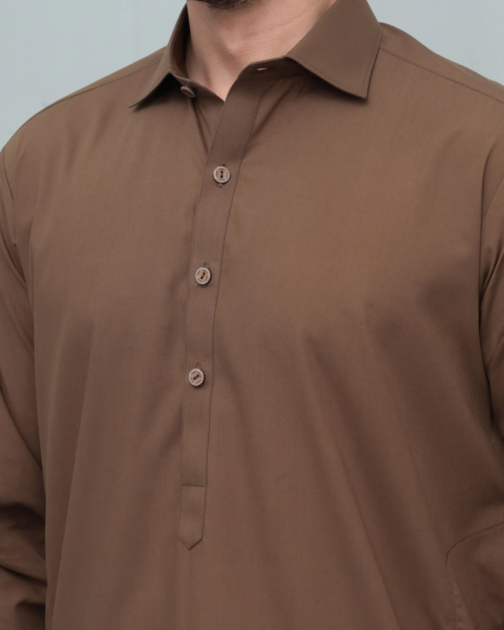Coffee Brown French Collar Shalwar Kameez - Stitched