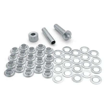 Consisting of replacement silver colored, nickel-plated grommets, this kit is ideal for canvas, plastic, leather, cotton or synthetic fabrics.
