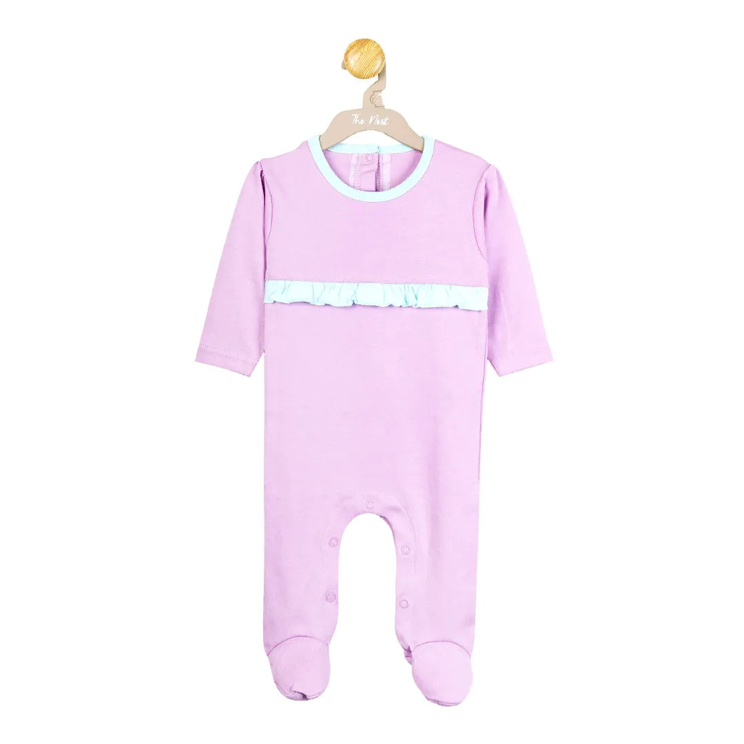 Snuggle up your little one in our Premium Cotton Lilac Footed Onesie with Pale Blue Ruffles! Made with 100% breathable cotton, this onesie is the ultimate in comfort and style. The pale blue ruffles on the waist add a pop of color and cuteness that will make your baby stand out from the crowd.