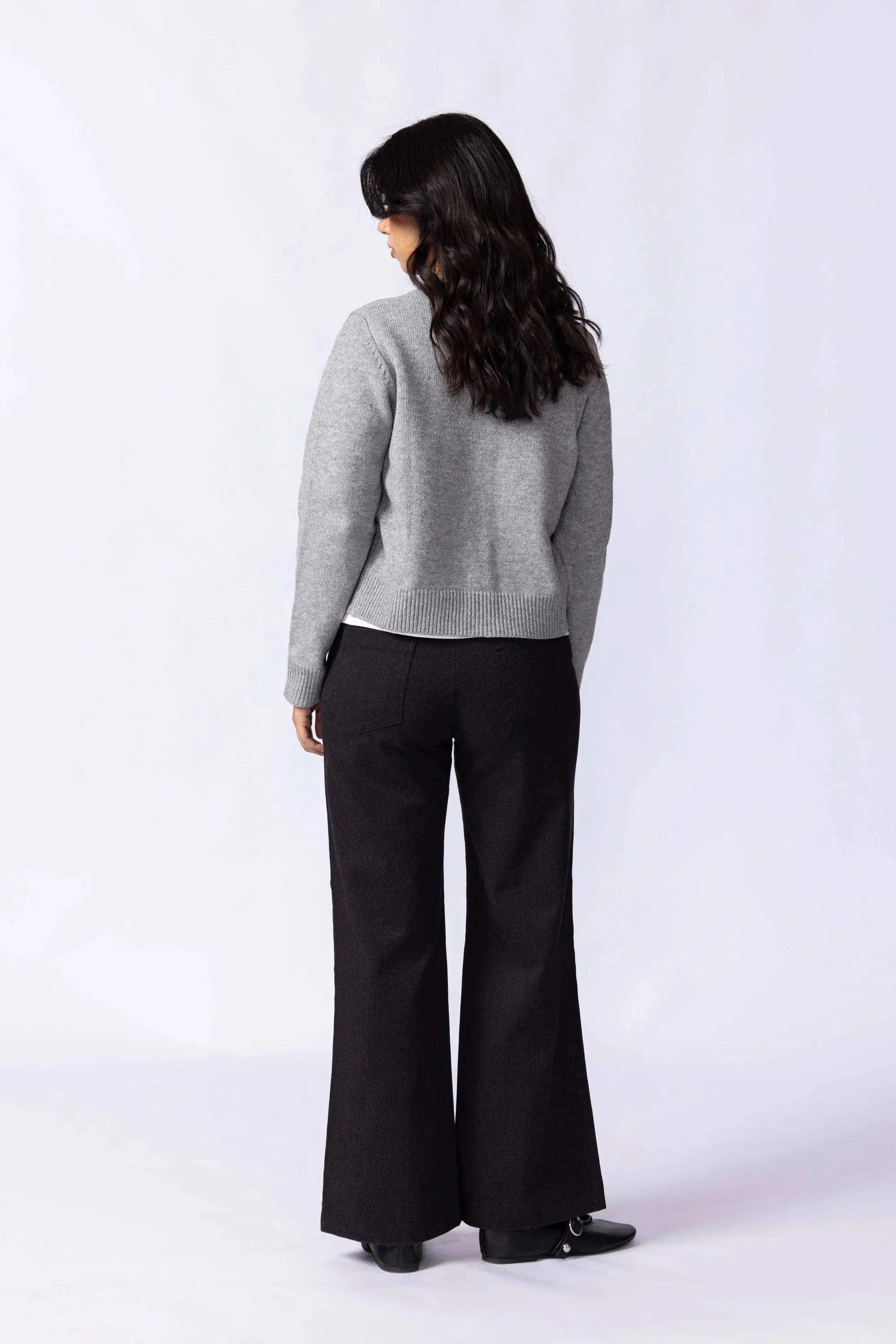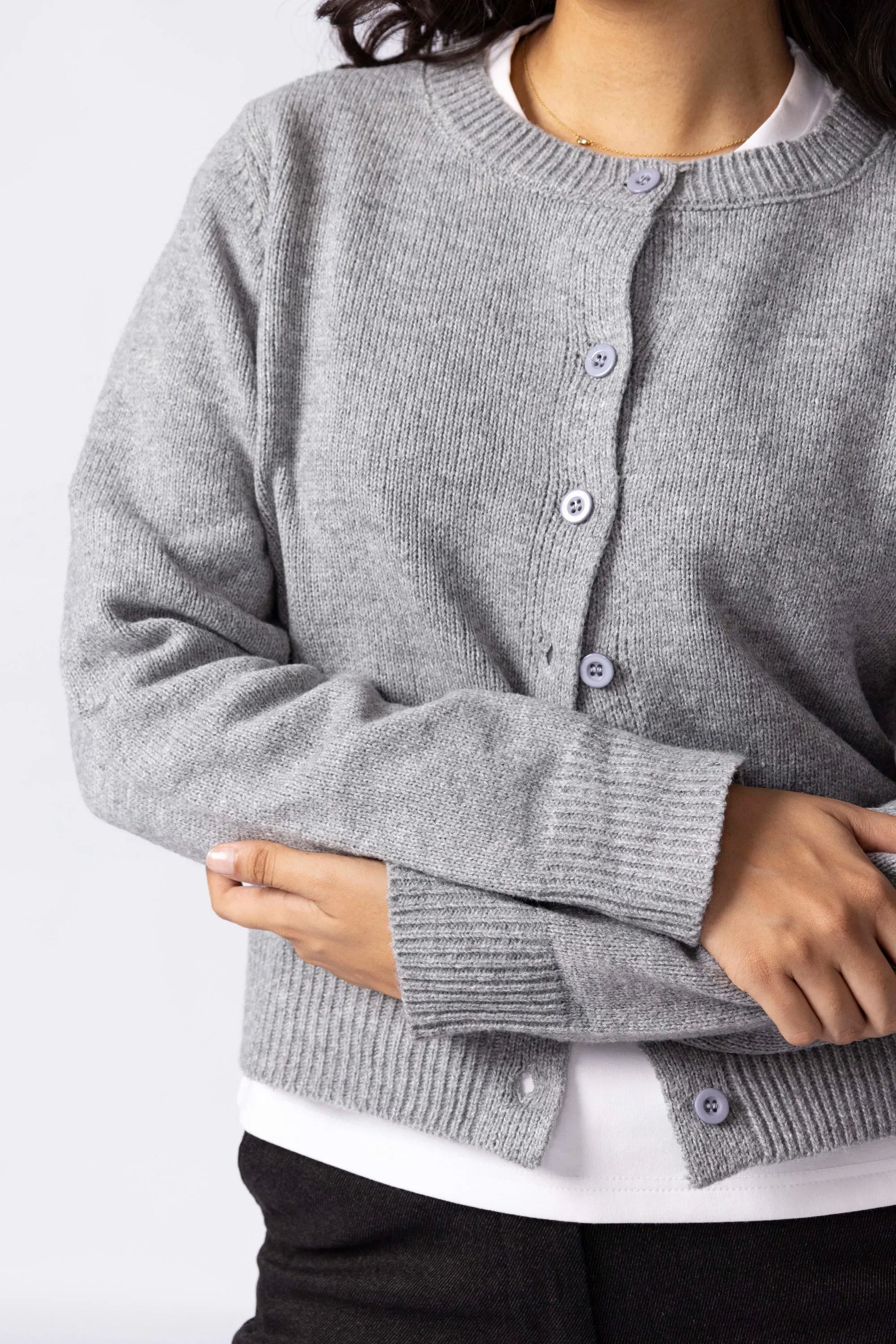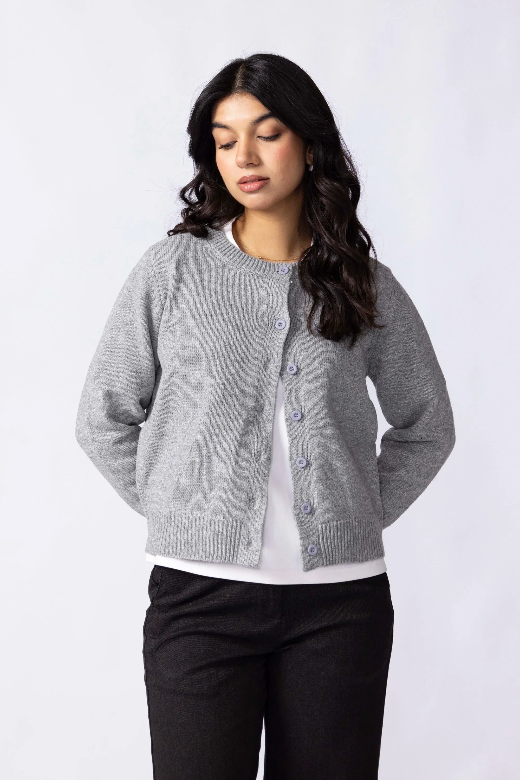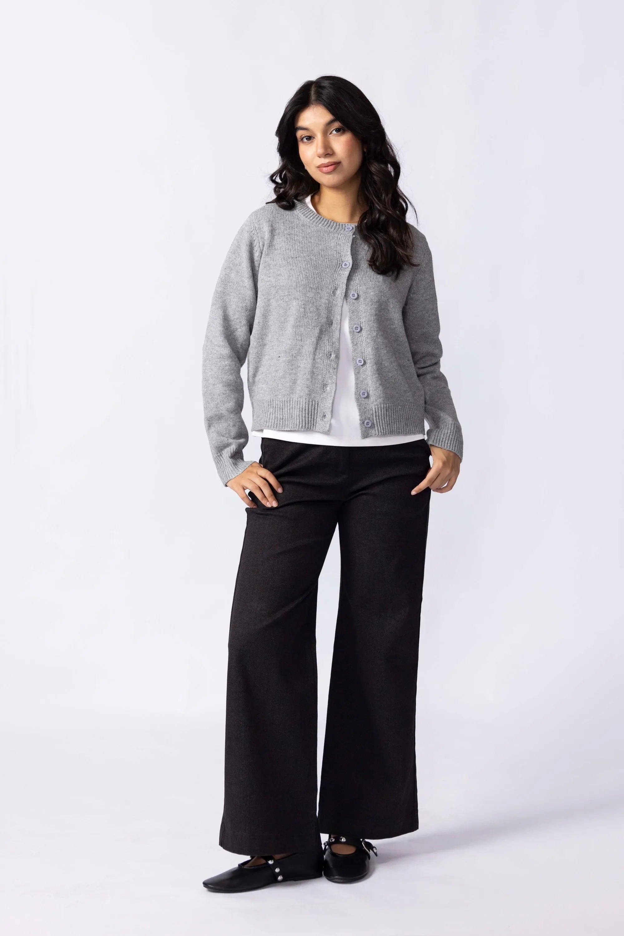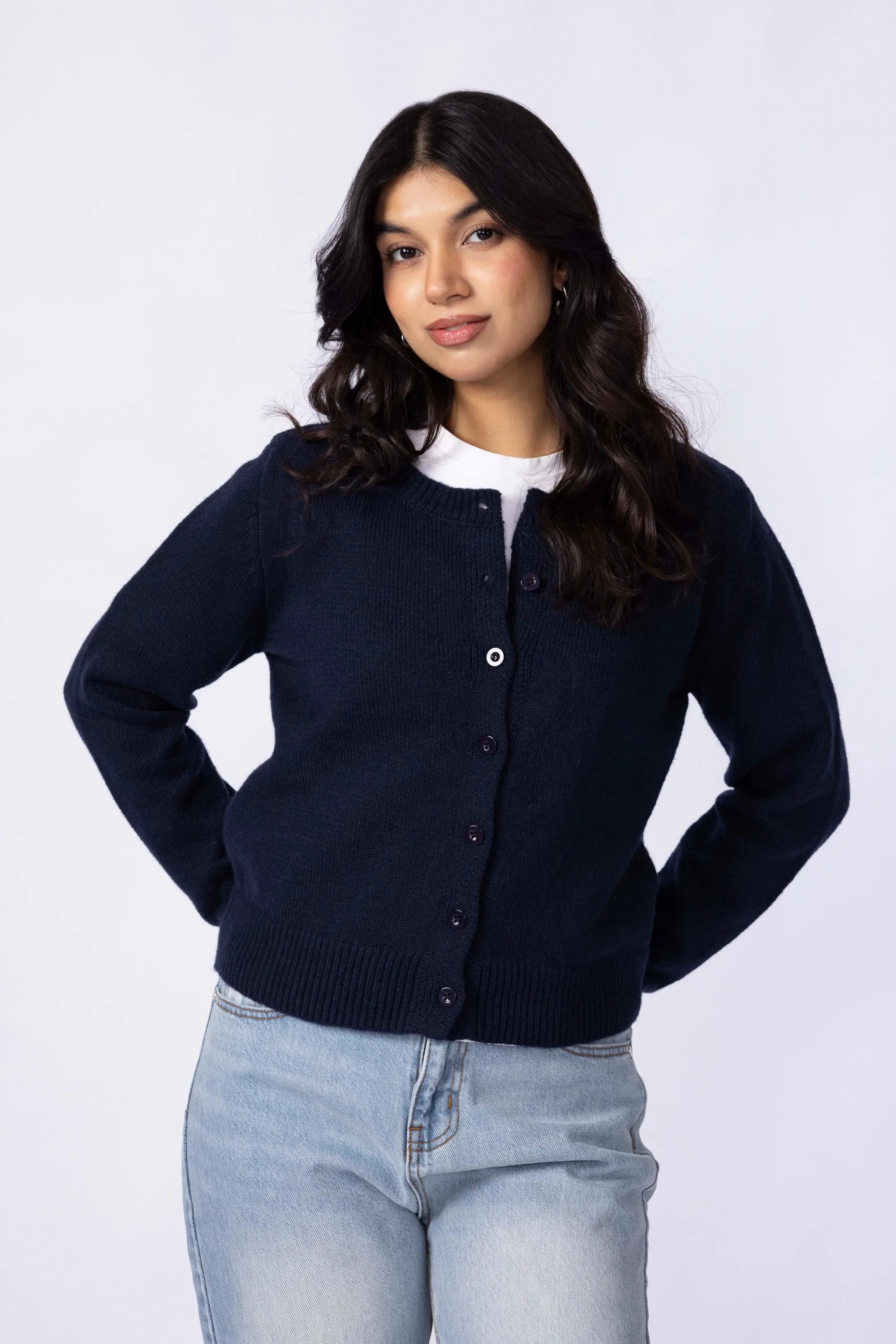 Knitted from a soft, stretch-blend yarn for comfort that moves with you. The cropped silhouette sits neatly at the waist, creating a clean, modern line that pairs effortlessly with high rise trousers or skirts. Designed with a button-down front for styling versatility and long sleeves finished with ribbed cuffs for subtle structured. A minimal piece that transitions easily between casual and refined looks