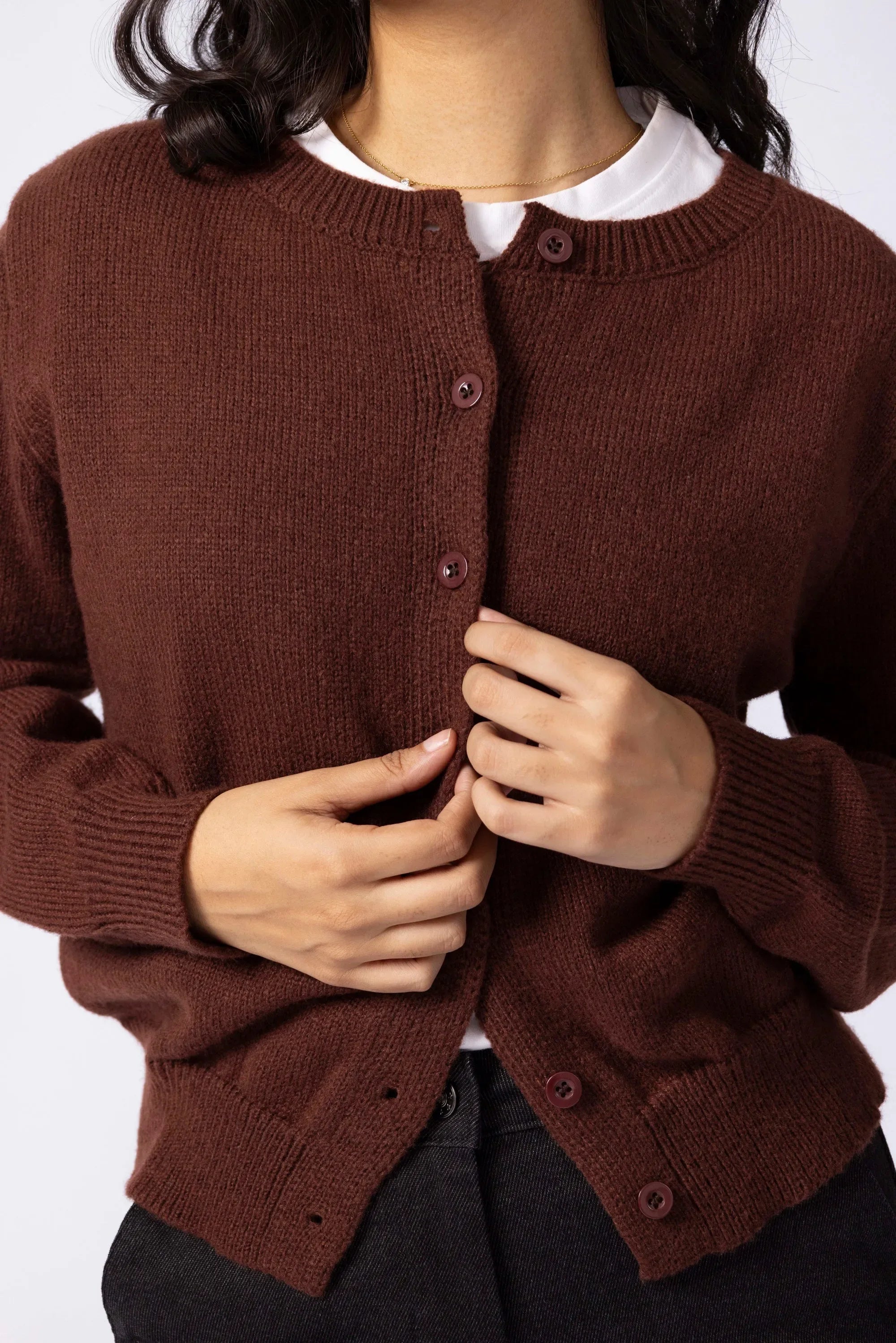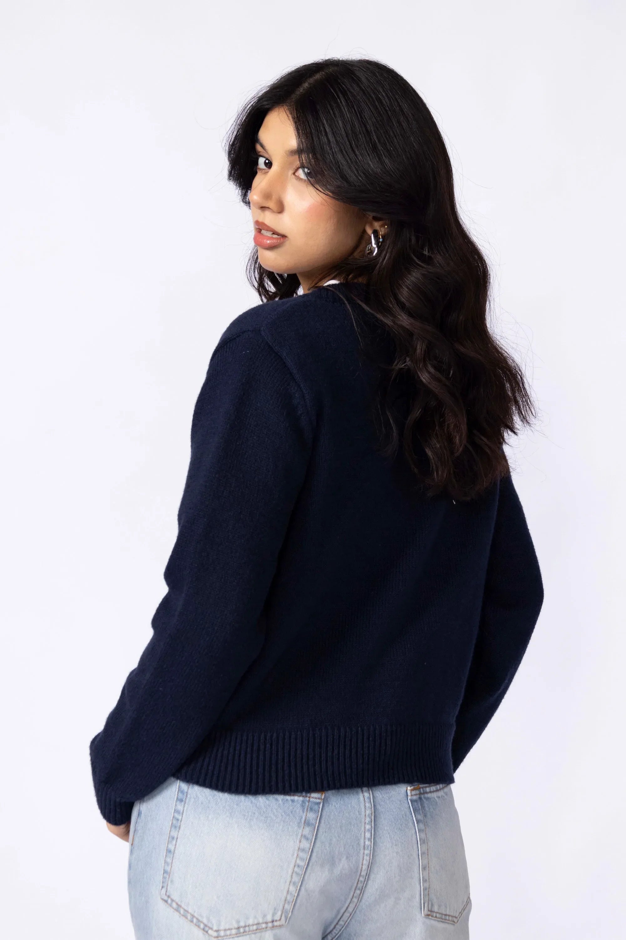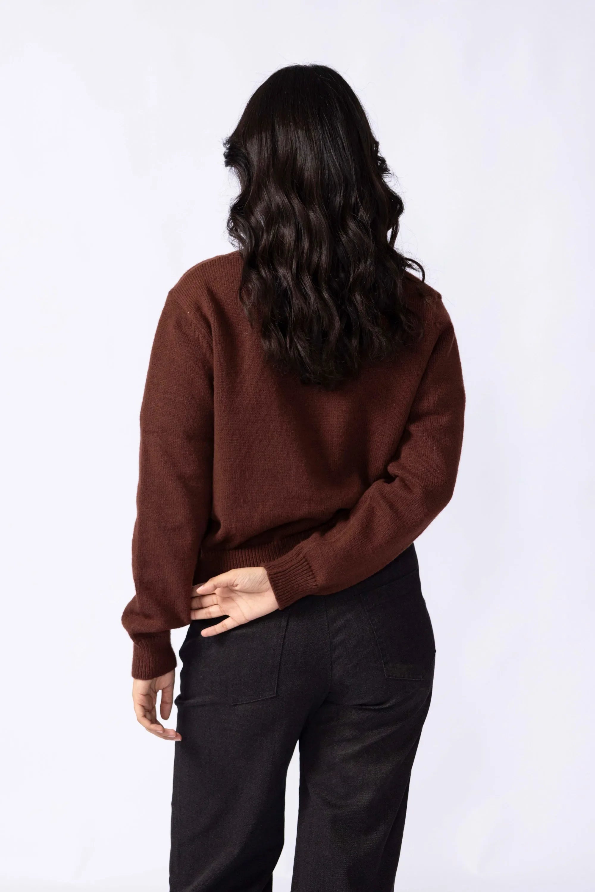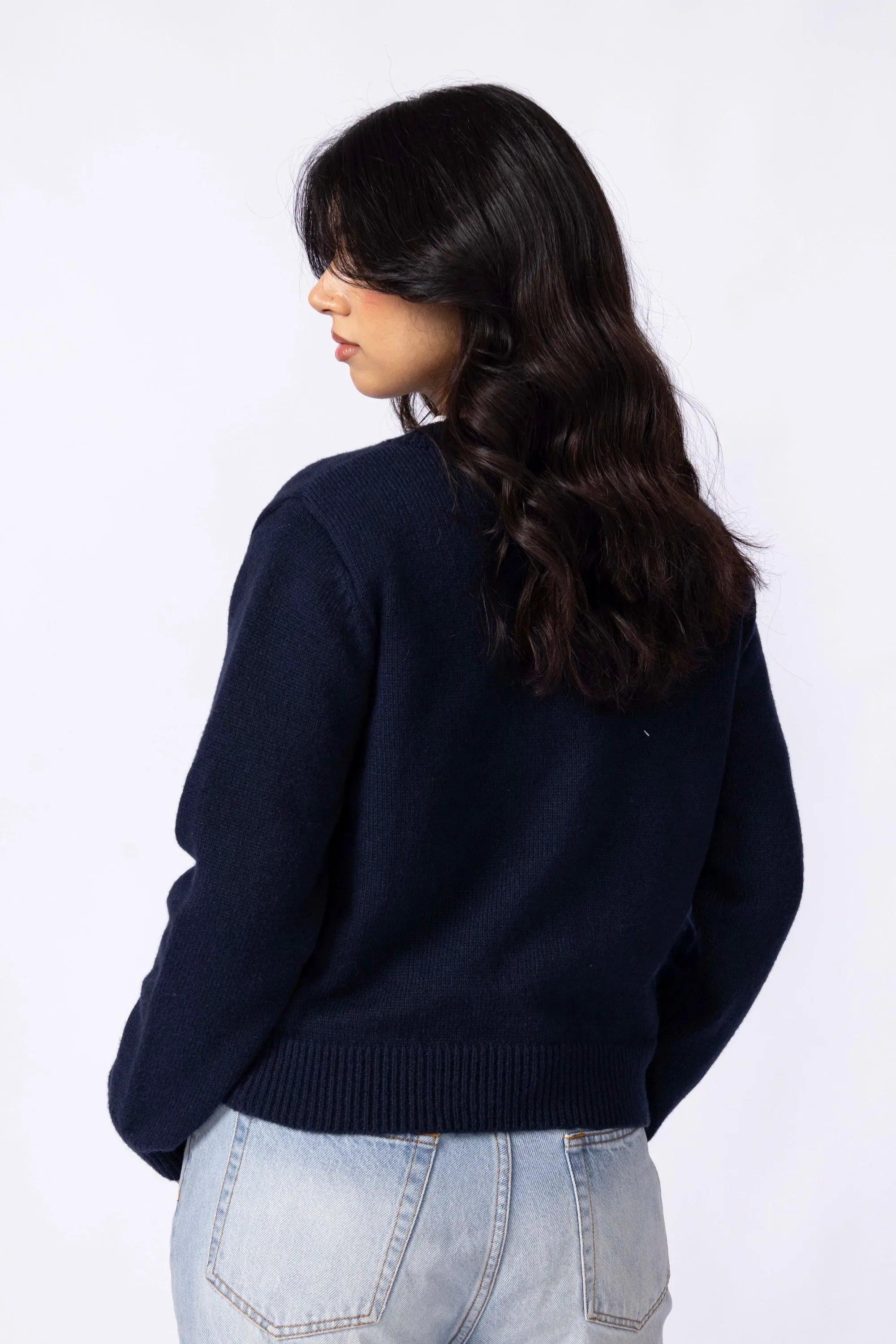 Knitted from a soft, stretch-blend yarn for comfort that moves with you. The cropped silhouette sits neatly at the waist, creating a clean, modern line that pairs effortlessly with high rise trousers or skirts. Designed with a button-down front for styling versatility and long sleeves finished with ribbed cuffs for subtle structured. A minimal piece that transitions easily between casual and refined looks