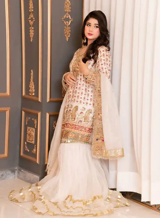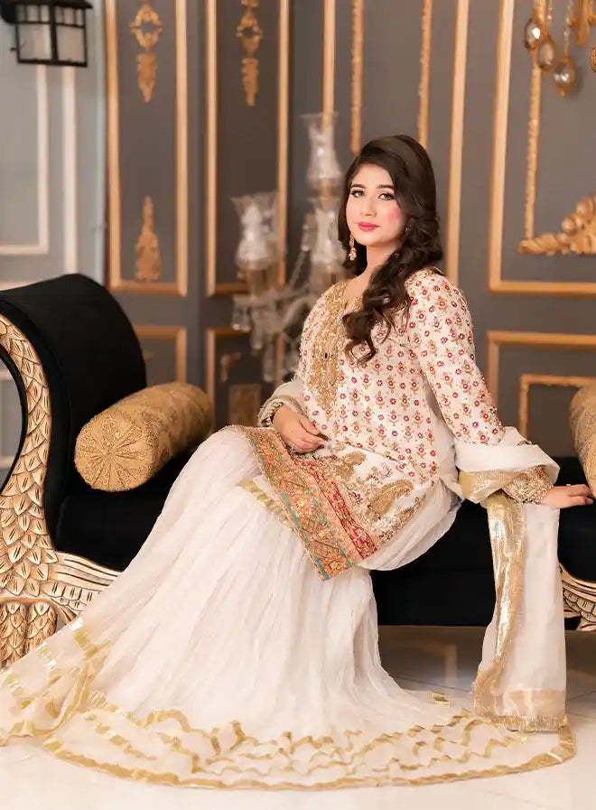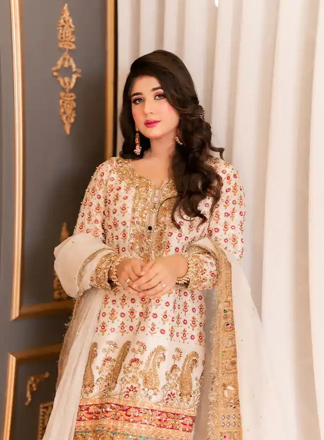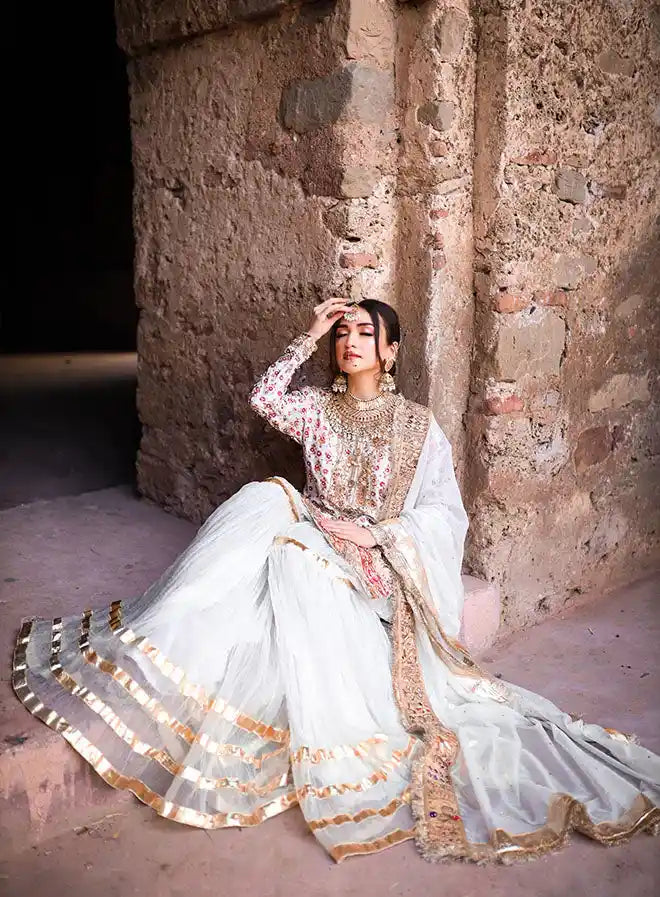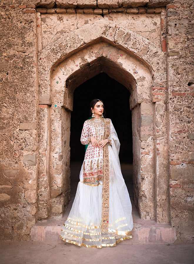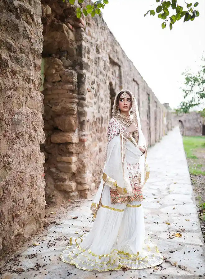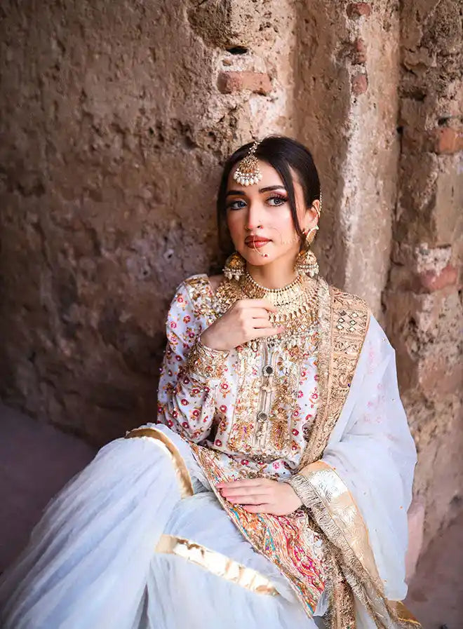 This stunning bridal ensemble includes a luxurious shirt, a fashionable crushed gharara, and an elegant dupatta, complemented by a stylish pouch/potli. The shirt is crafted from pure raw silk, featuring heavy handwork with intricate stamp printing details, enhanced by exquisite qora, dabka, stone, and sequin embellishments. Both the gharara and dupatta are made from elegant organza, adding a beautiful flow to the outfit. Perfect for special occasions, this ensemble combines traditional craftsmanship with modern elegance, ensuring a striking appearance.
