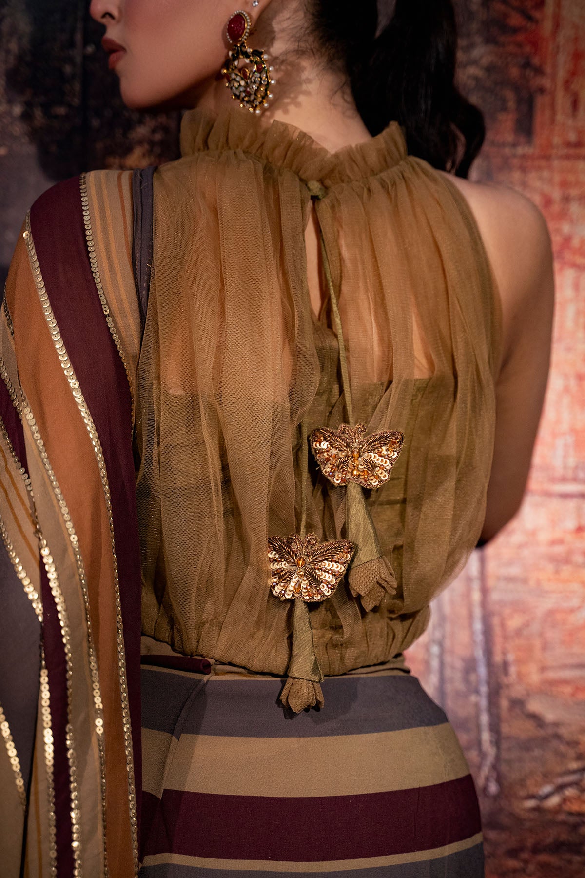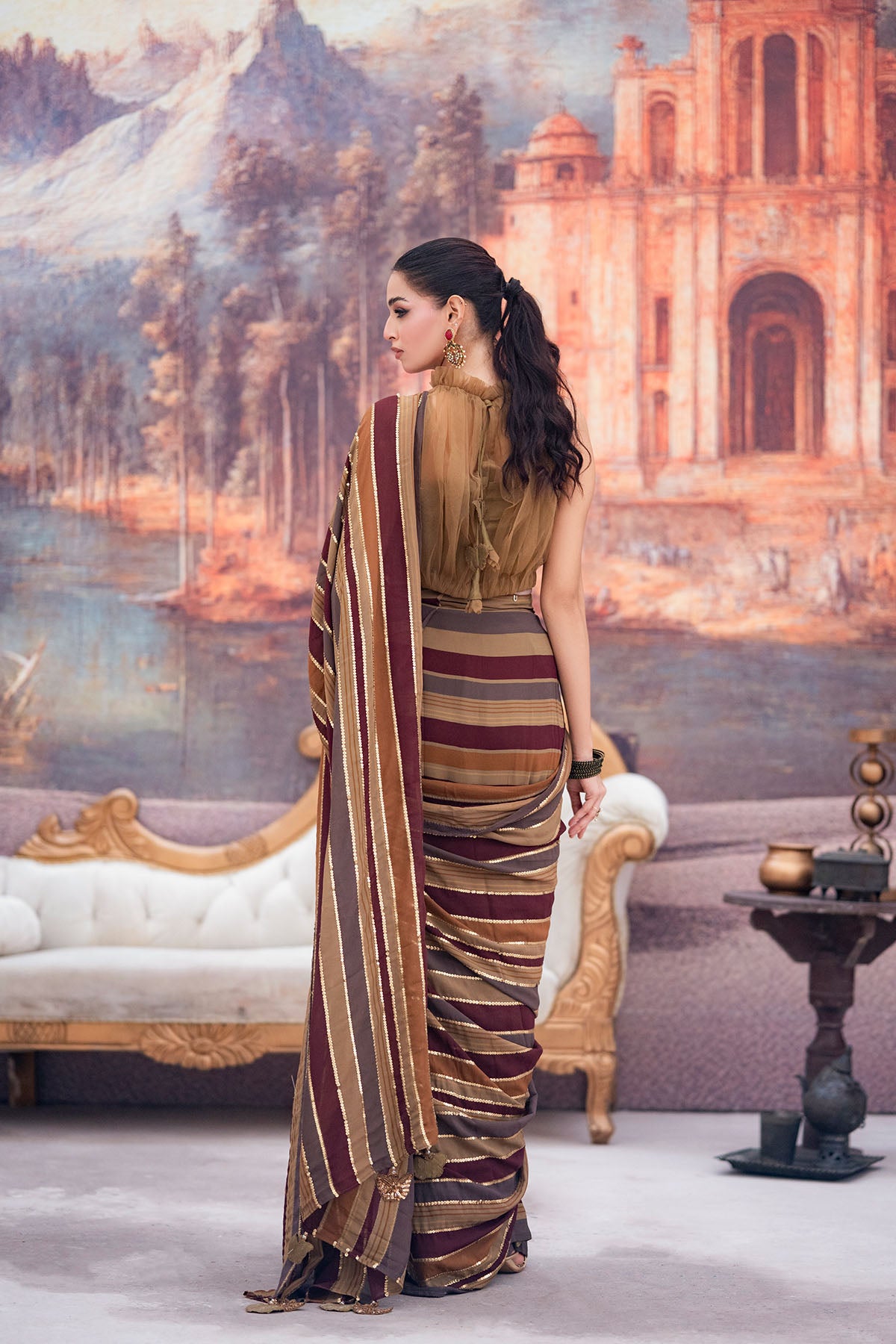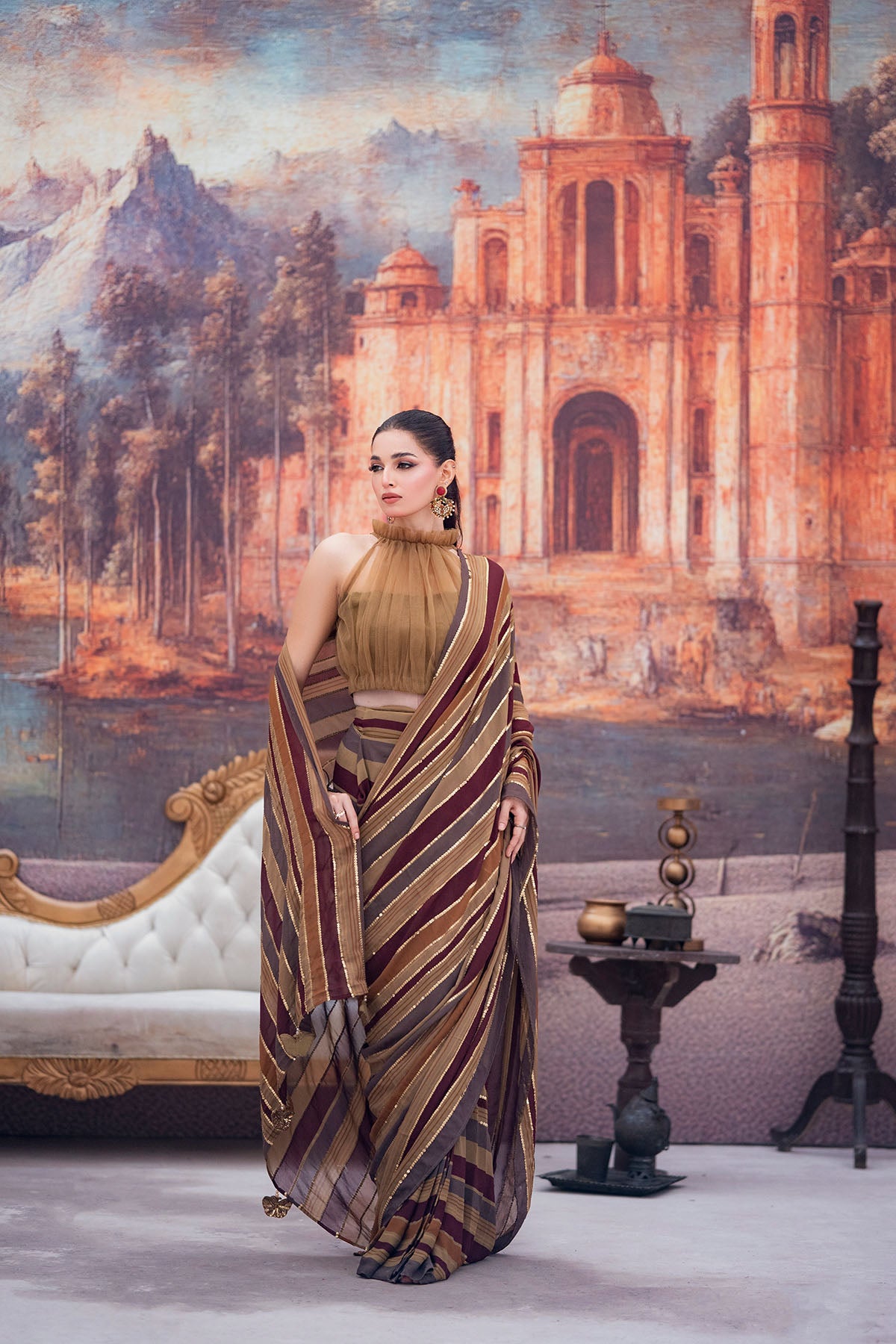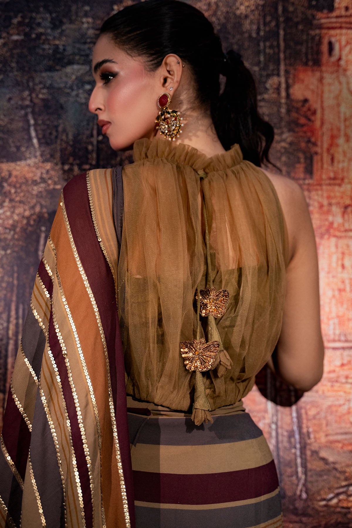 Lia - Festive Formal - Vol 3: A Whisper Of Ethereal Romance, This Sari Is Crafted From Digitally Printed Georgette Chiffon, Washed In The Deep Earthy Hues. The Halterneck Blouse In Net Tailored With Pleats And Frill Neck And 3D Embellished Tassels Cascading Down The Back. Draped In Translucent Printed Stripes Over A Printed Skirt, The Sari Is Finished With Zardoze Handwork Butterfly Tassels And Delicate Sequins Hand Embroidery Along The Pallu. The Silhouette Moves With Modern Grace While Holding A Timeless Soul.