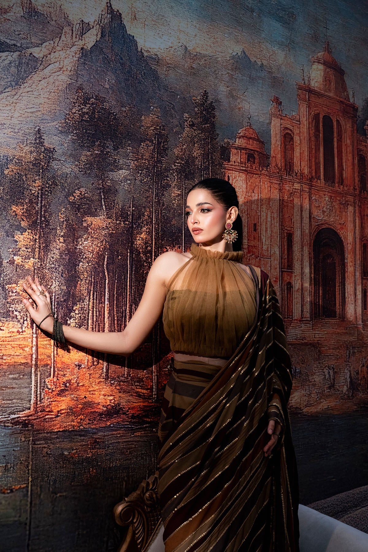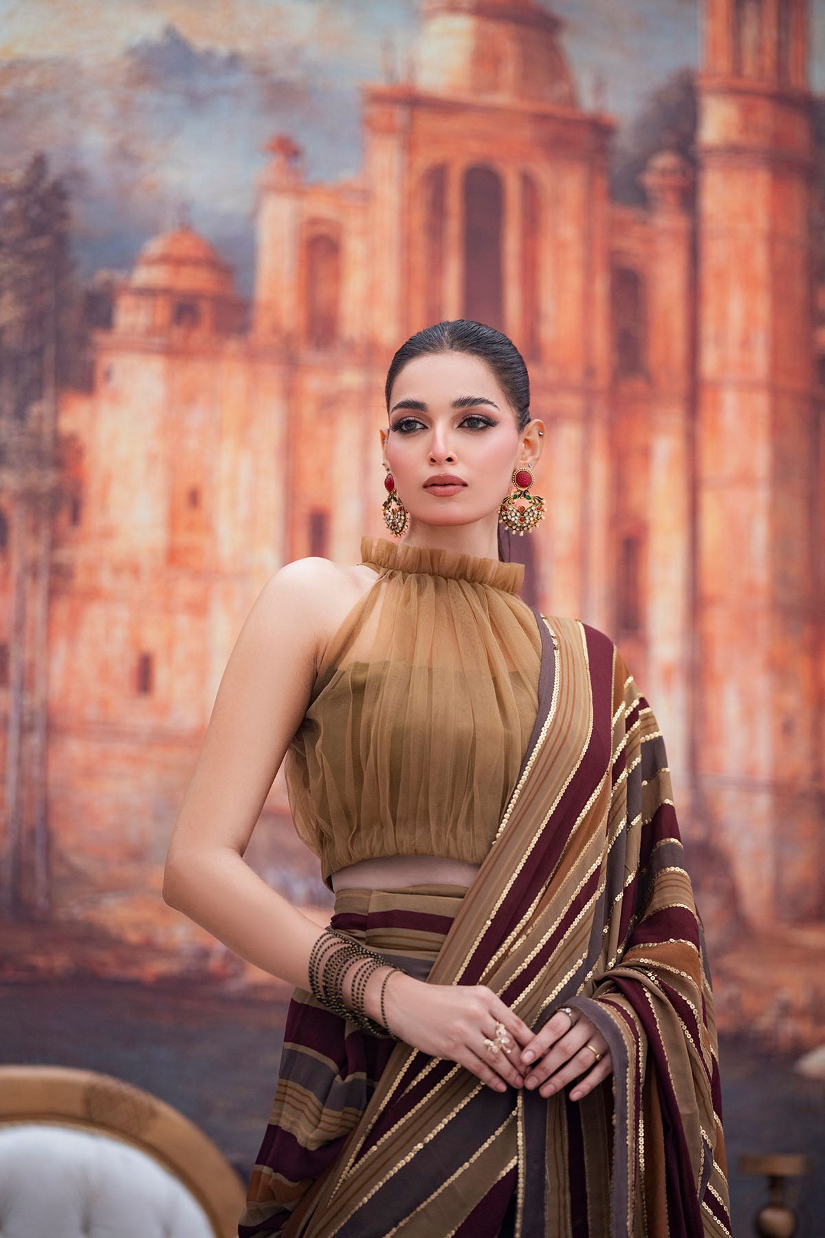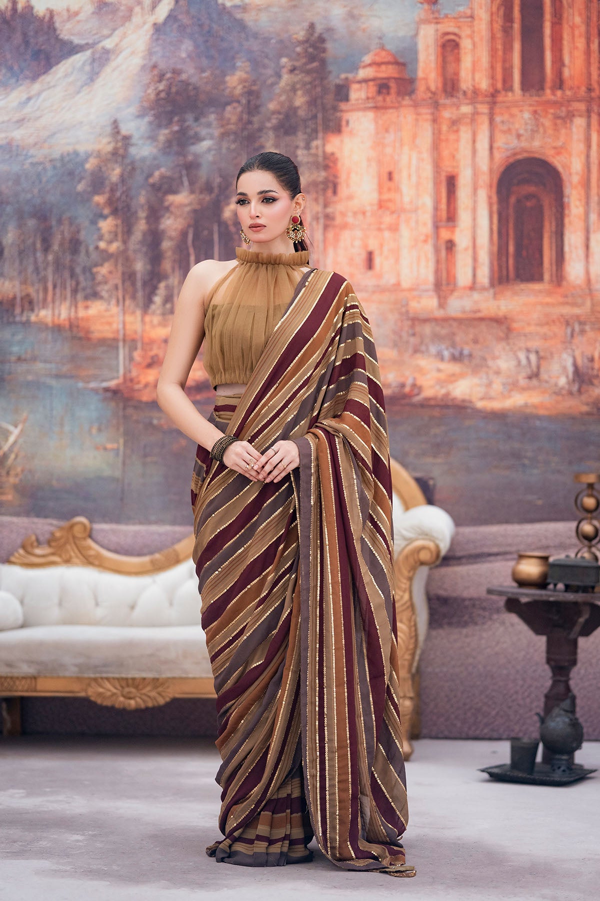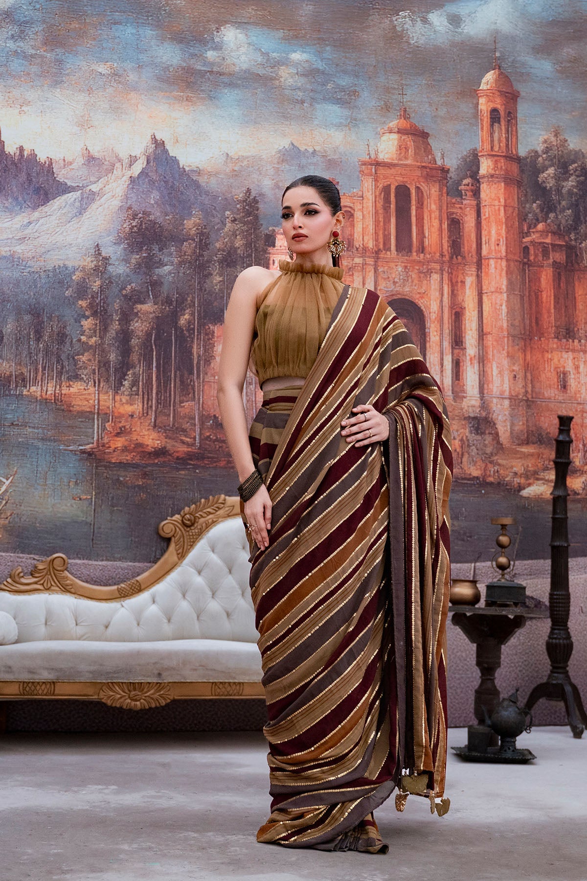 Lia - Festive Formal - Vol 3: A Whisper Of Ethereal Romance, This Sari Is Crafted From Digitally Printed Georgette Chiffon, Washed In The Deep Earthy Hues. The Halterneck Blouse In Net Tailored With Pleats And Frill Neck And 3D Embellished Tassels Cascading Down The Back. Draped In Translucent Printed Stripes Over A Printed Skirt, The Sari Is Finished With Zardoze Handwork Butterfly Tassels And Delicate Sequins Hand Embroidery Along The Pallu. The Silhouette Moves With Modern Grace While Holding A Timeless Soul.