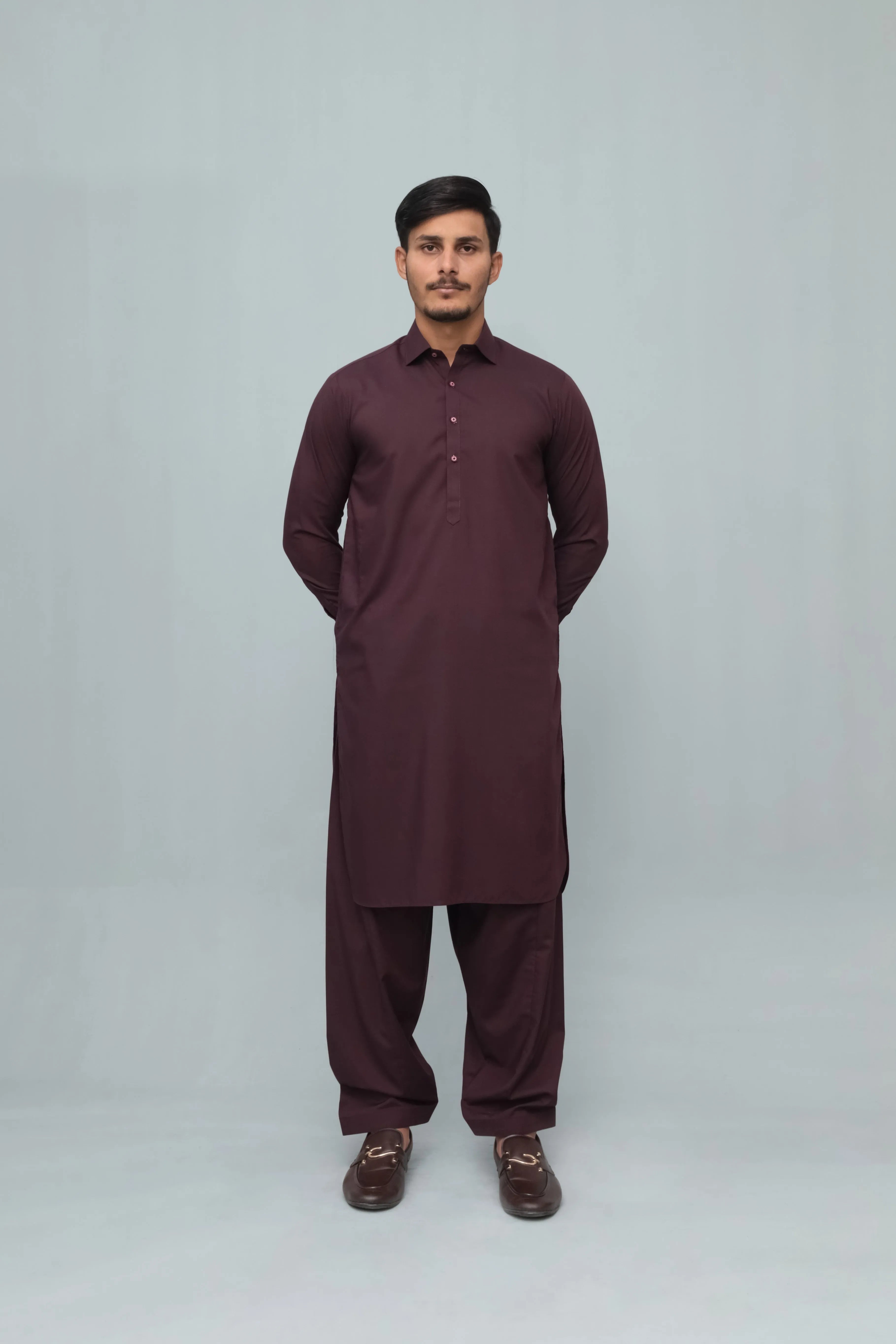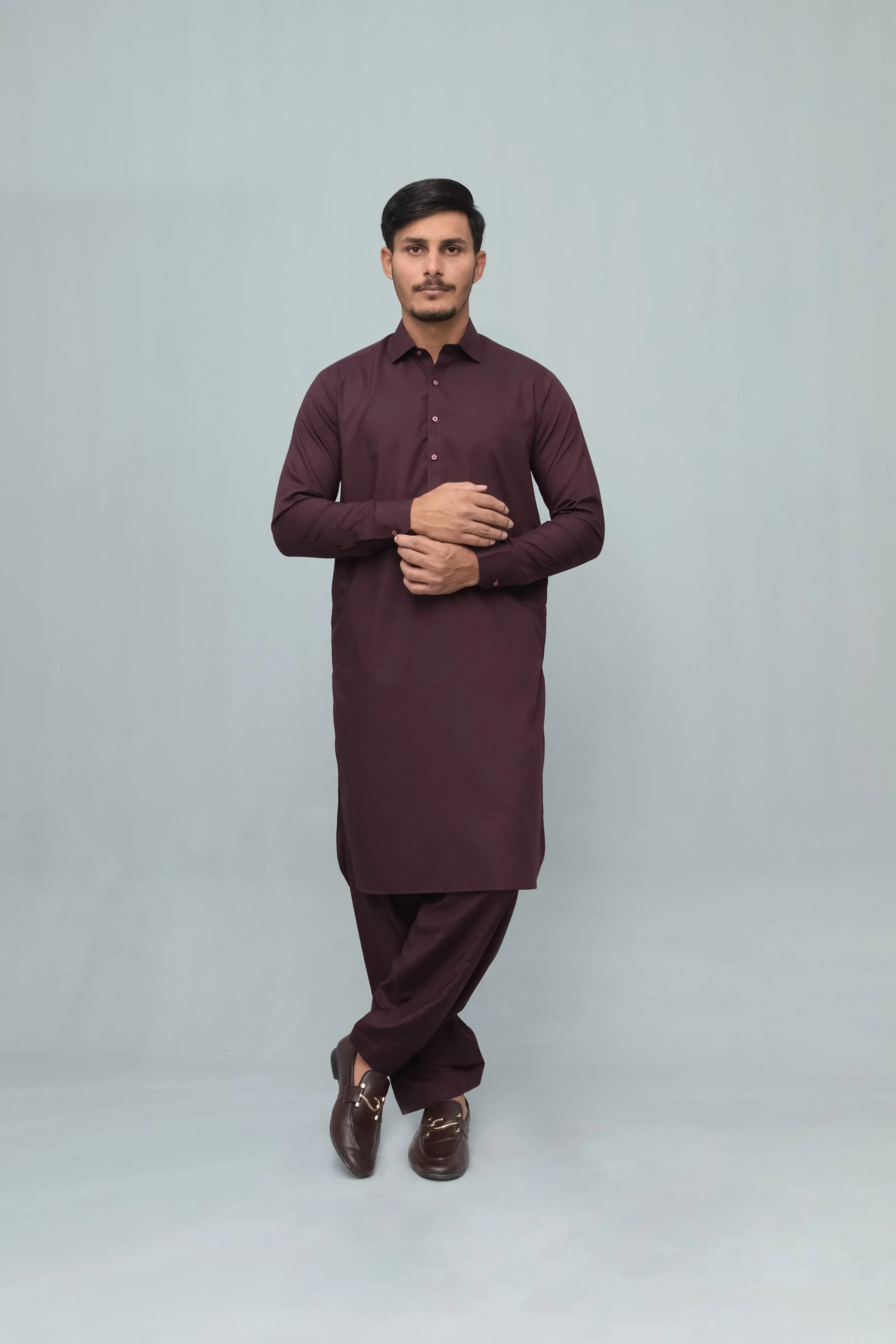 Dark Marron French Collar Shalwar Kameez - Stitched