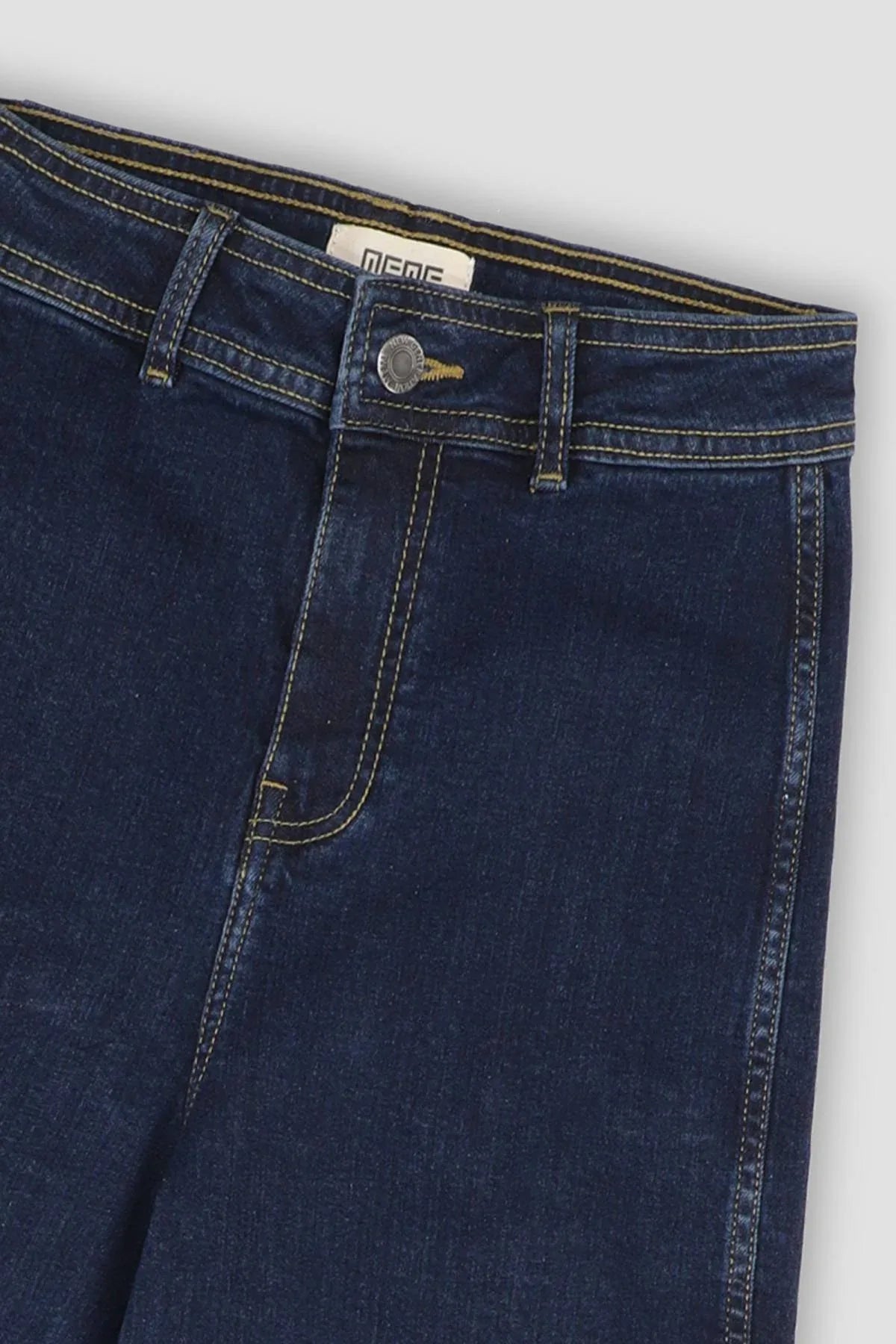 98% Cotton &Amp; 2% Elastane. Classical Dark Wash Denim Jeans With Regular Waistband Featuring Button And Loops. Rear Patch Pockets. Contrast Seam Details. Wide Hem