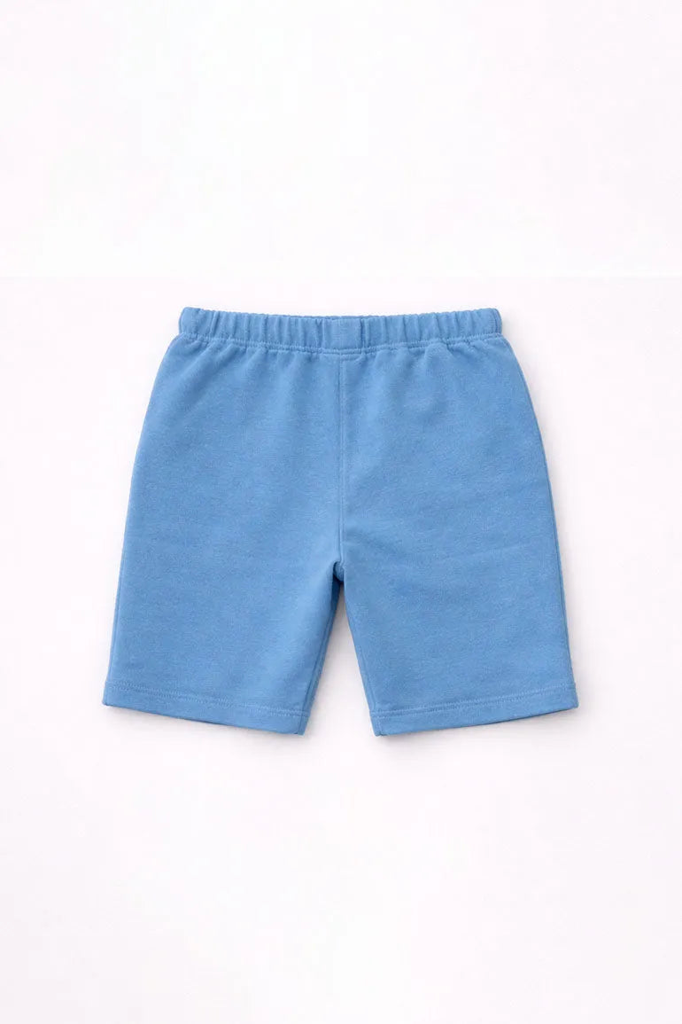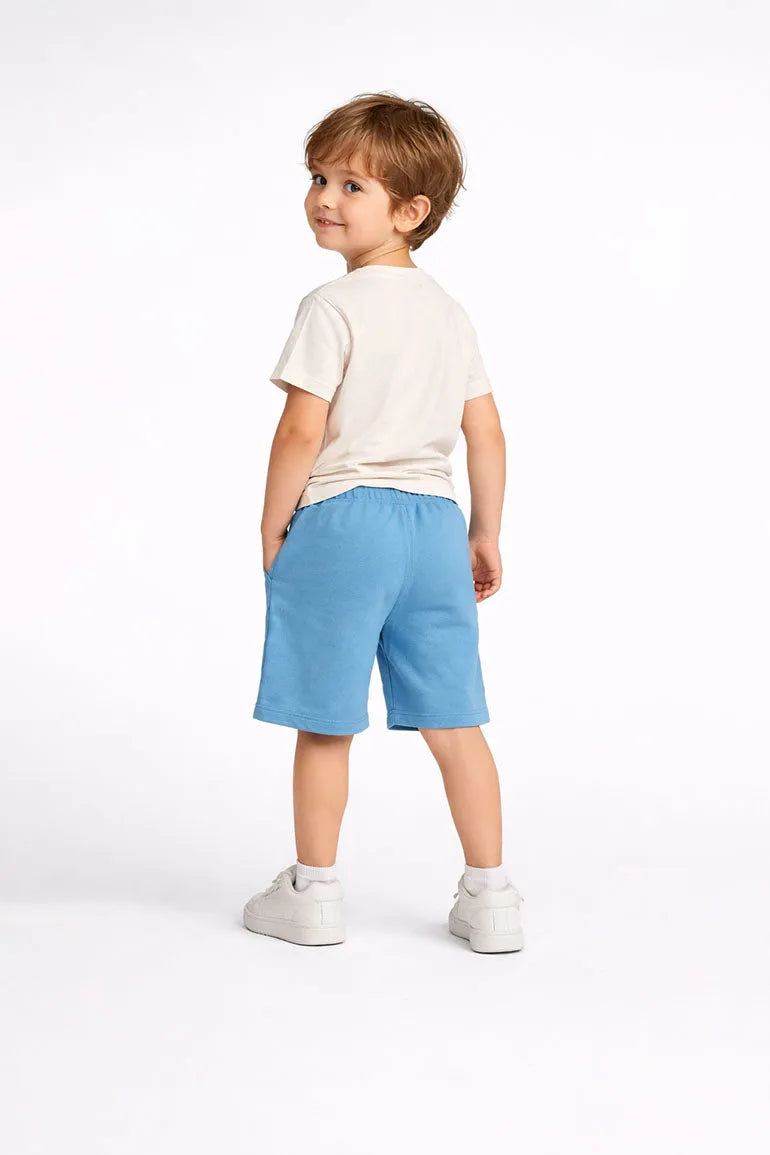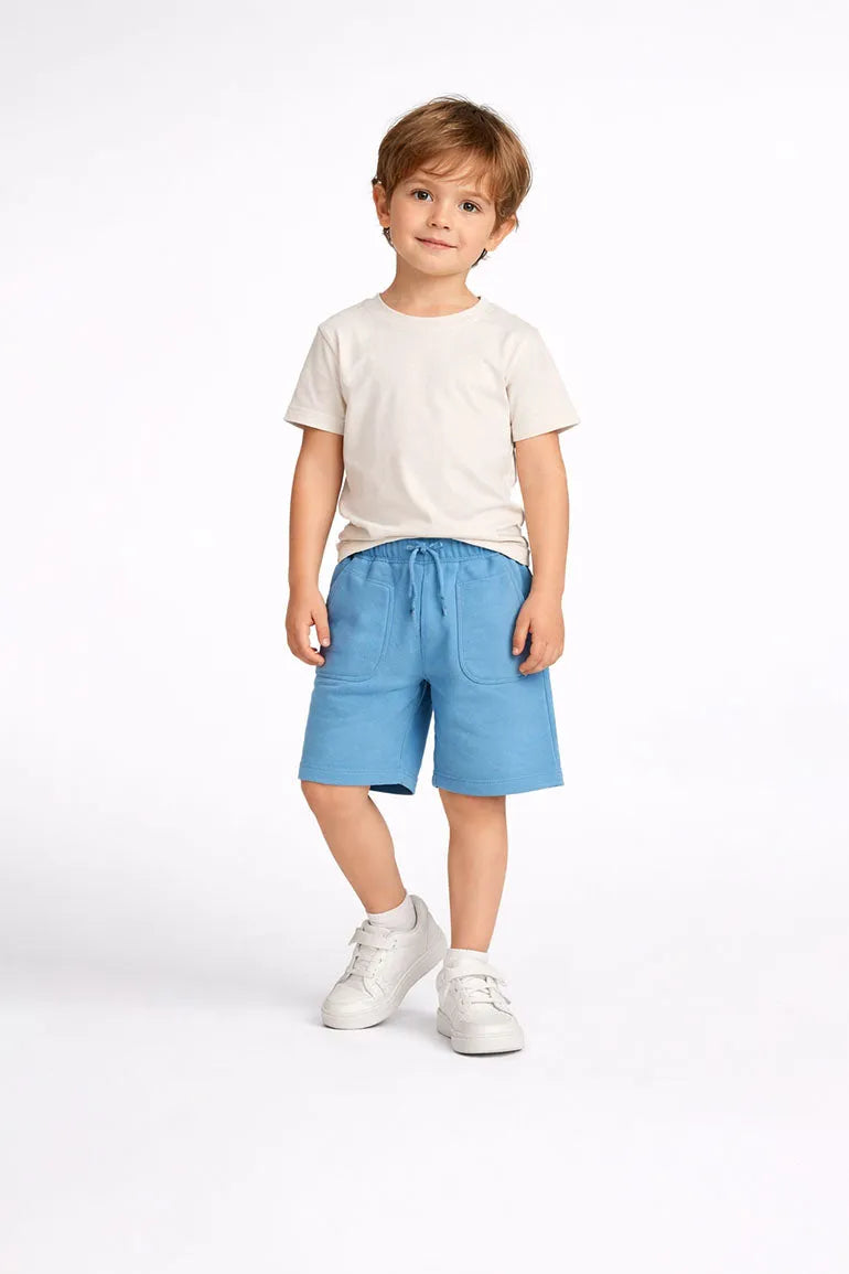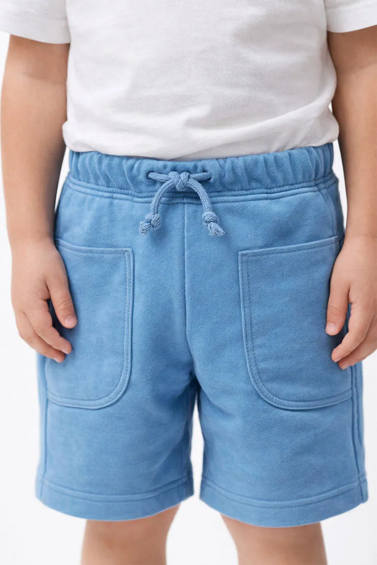 Soft comfortable shorts with an elastic waistband and adjustable drawstring for easy wear. Large front patch pockets add a practical everyday touch. Perfect for playtime outings and warm weather comfort