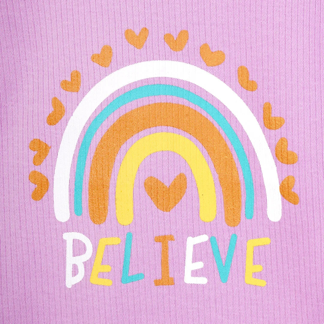 Add a pop of color to your little one's wardrobe with our lovely lilac short sleeved bodysuit. Featuring a lap shoulder design for easy dressing and rainbow print with the word "believe," this bodysuit is perfect for any occasion. Made from 100% soft and breathable cotton, it ensures maximum comfort for your baby's delicate skin. With convenient snap closures for quick and easy diaper changes, this bodysuit is a must-have for any parent.