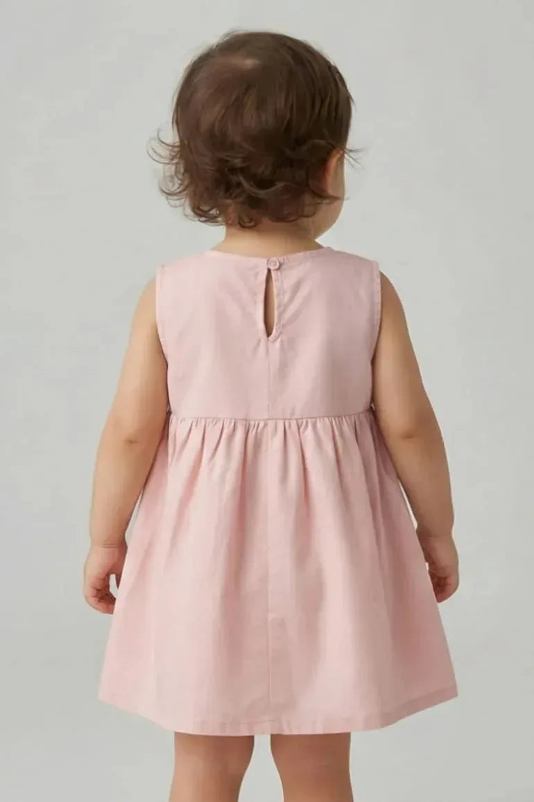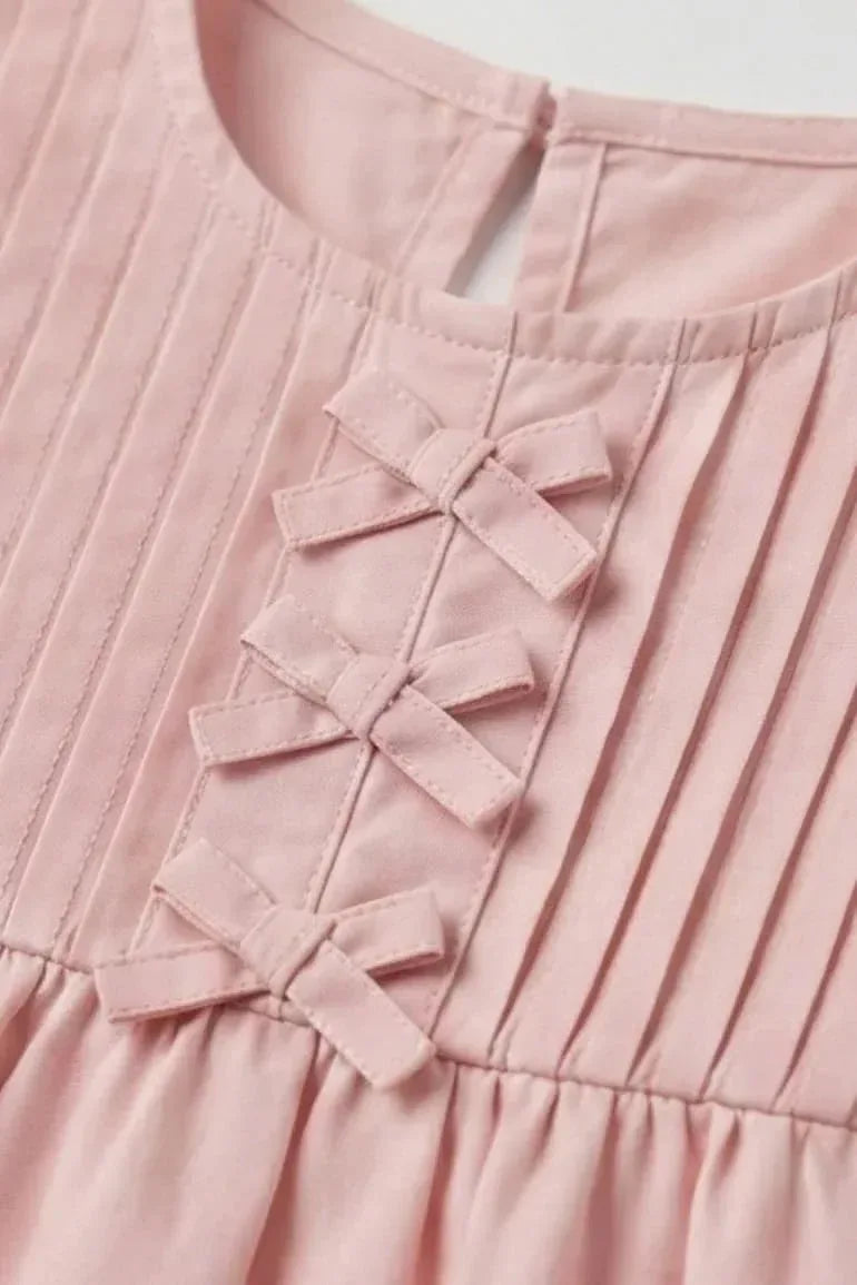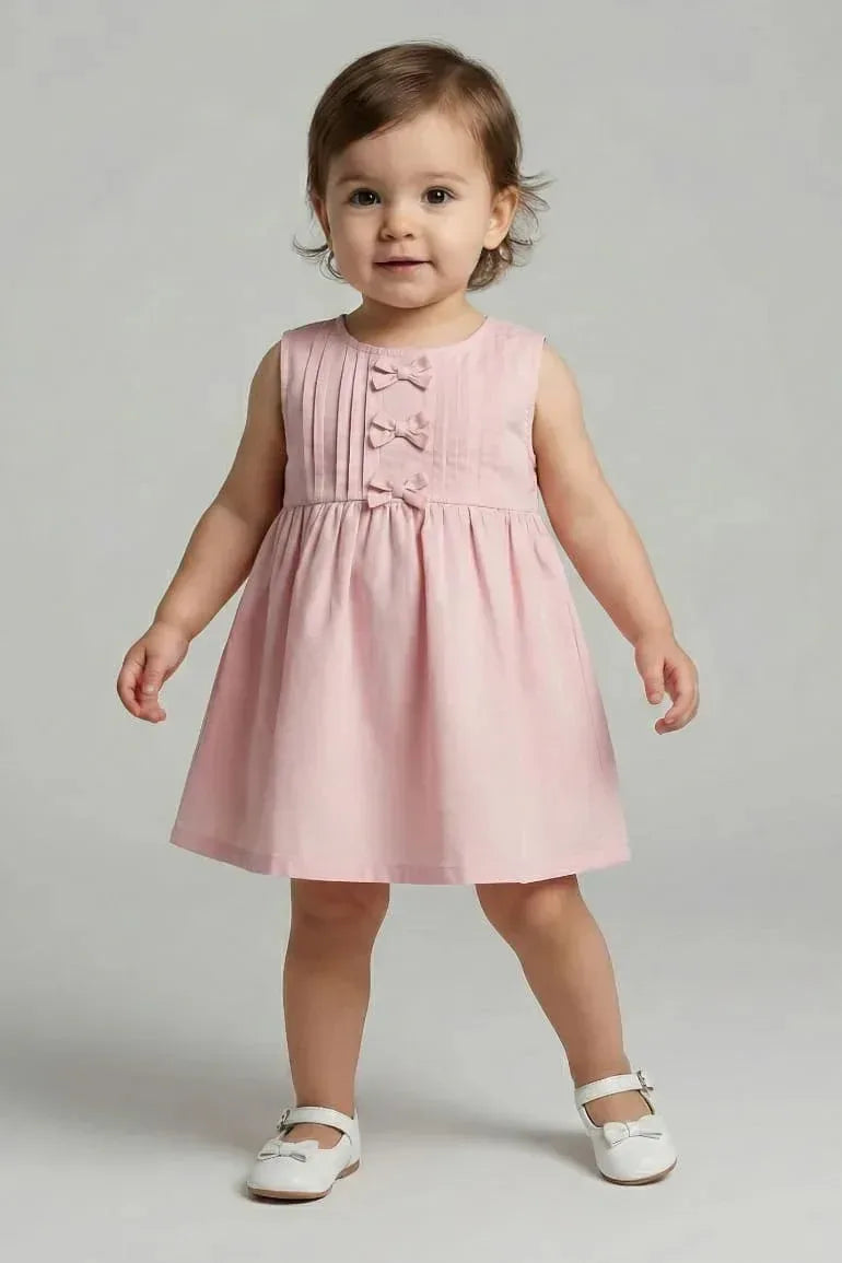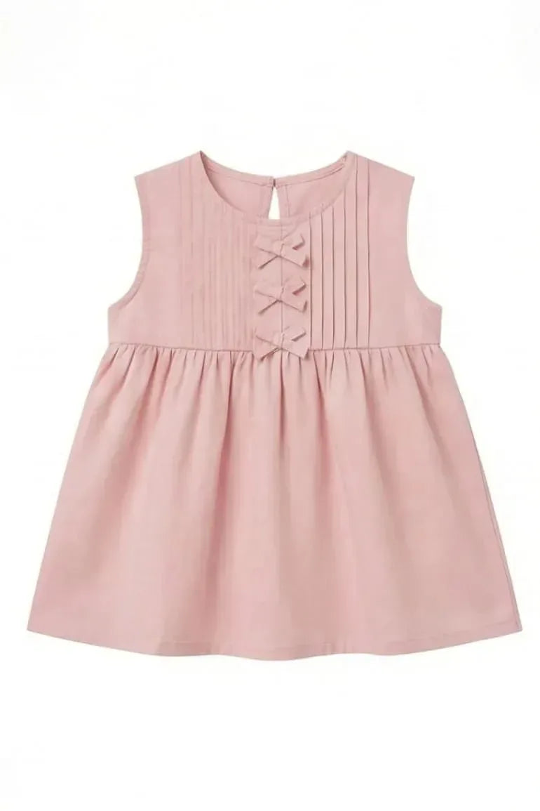 A timeless sleeveless dress featuring delicate front pleats and criss-cross ribbon detailing. Made from soft, breathable fabric with a gently flared skirt for all-day comfort. Perfect for parties, photoshoots, and special occasions.