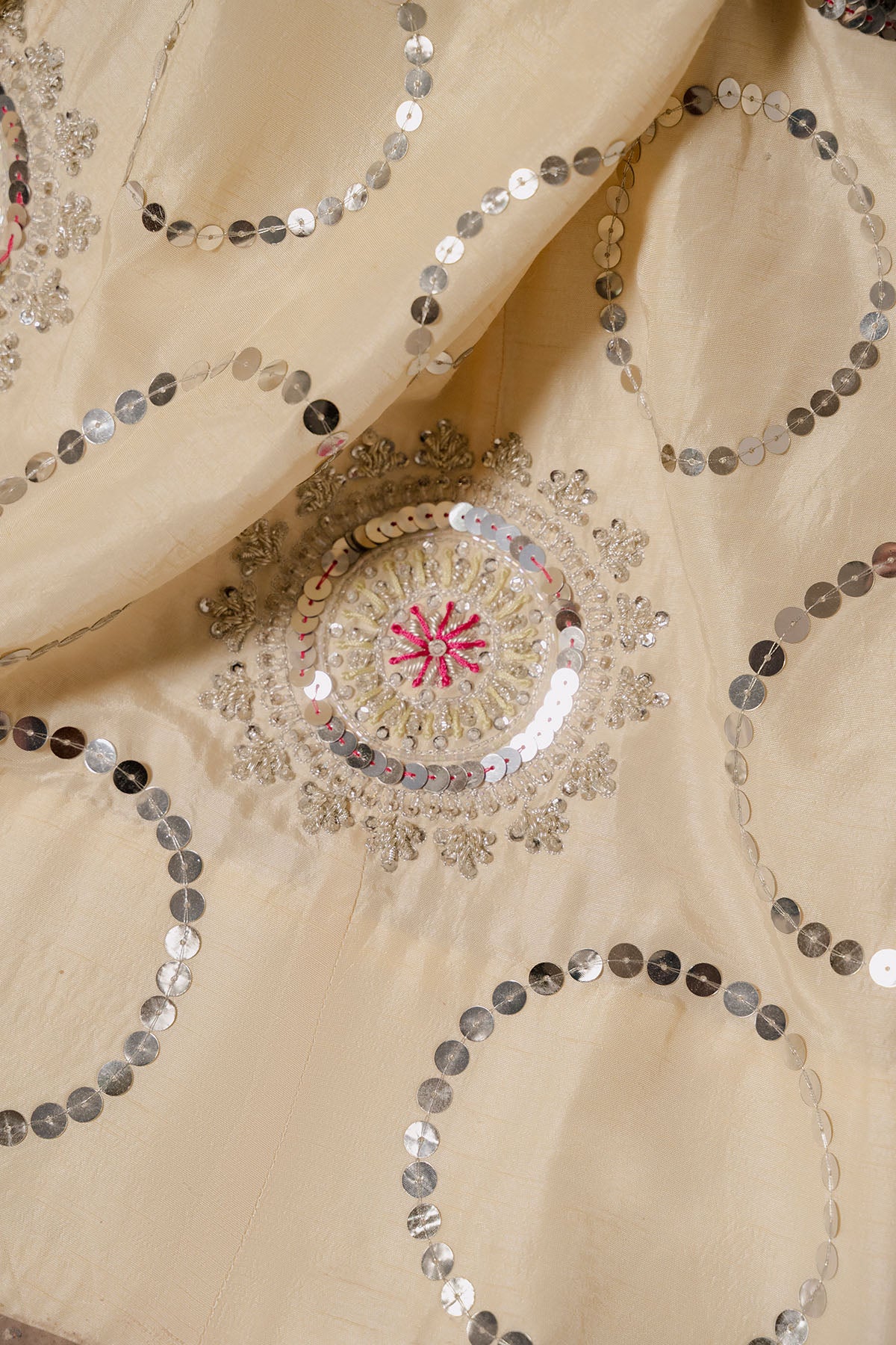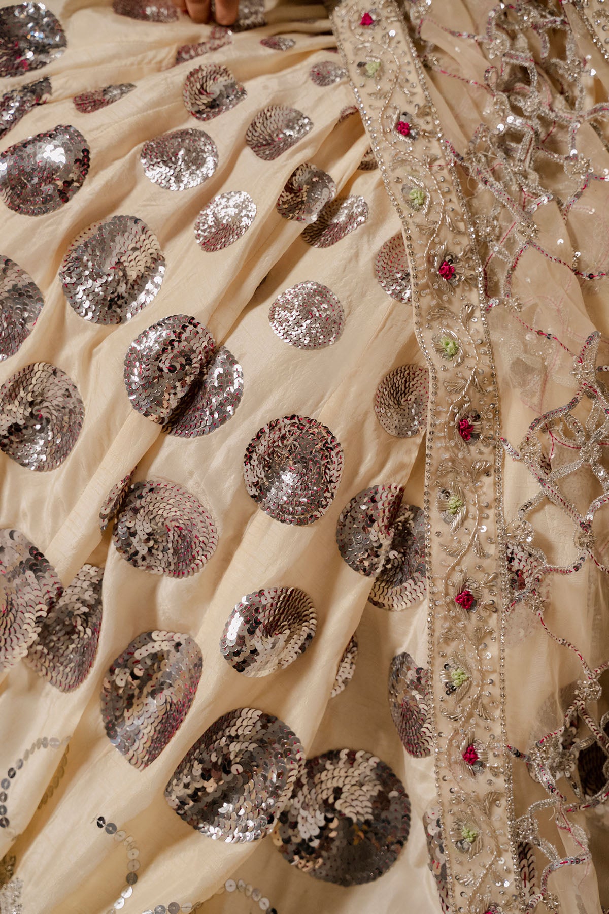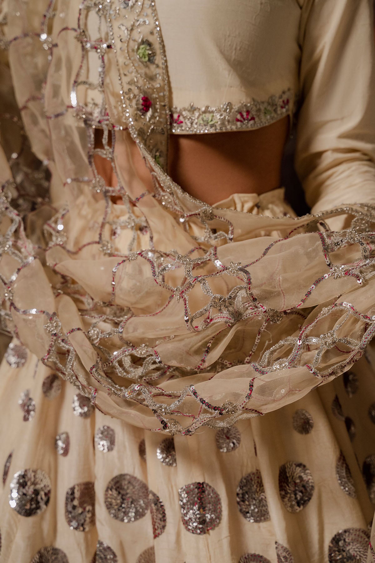 Lia - Festive Formal - Vol 3: A Glamorous Pale Butter Yellow Hued Korean Rawsilk Choli With Open Back Is Elevated With A Organza Cutwork And Hand Embroidered Dupatta, Resplendent In A Floral Border Embroidered With Zardoze And Accent Resham Details. The Korean Rawsilk Matching Voluminous Lehenga, Fully Hand Embroidered Sequin Circles And Zardoze Motifs. The Choli Is Adorned With Delicate Embroidery Creating A Floral Border Of Zardoze, Resham, And Glistening Sequins On The Choli; Evoking A Timeless Charm.