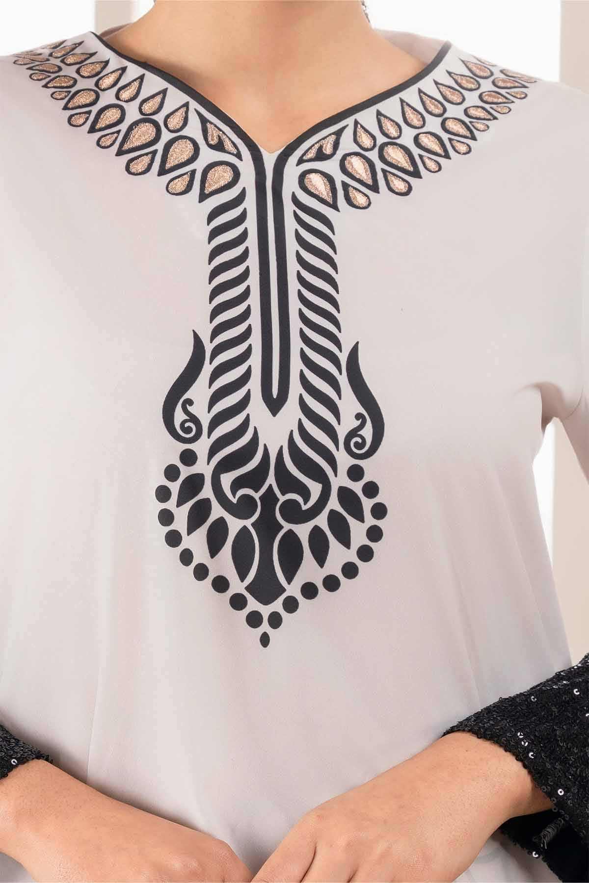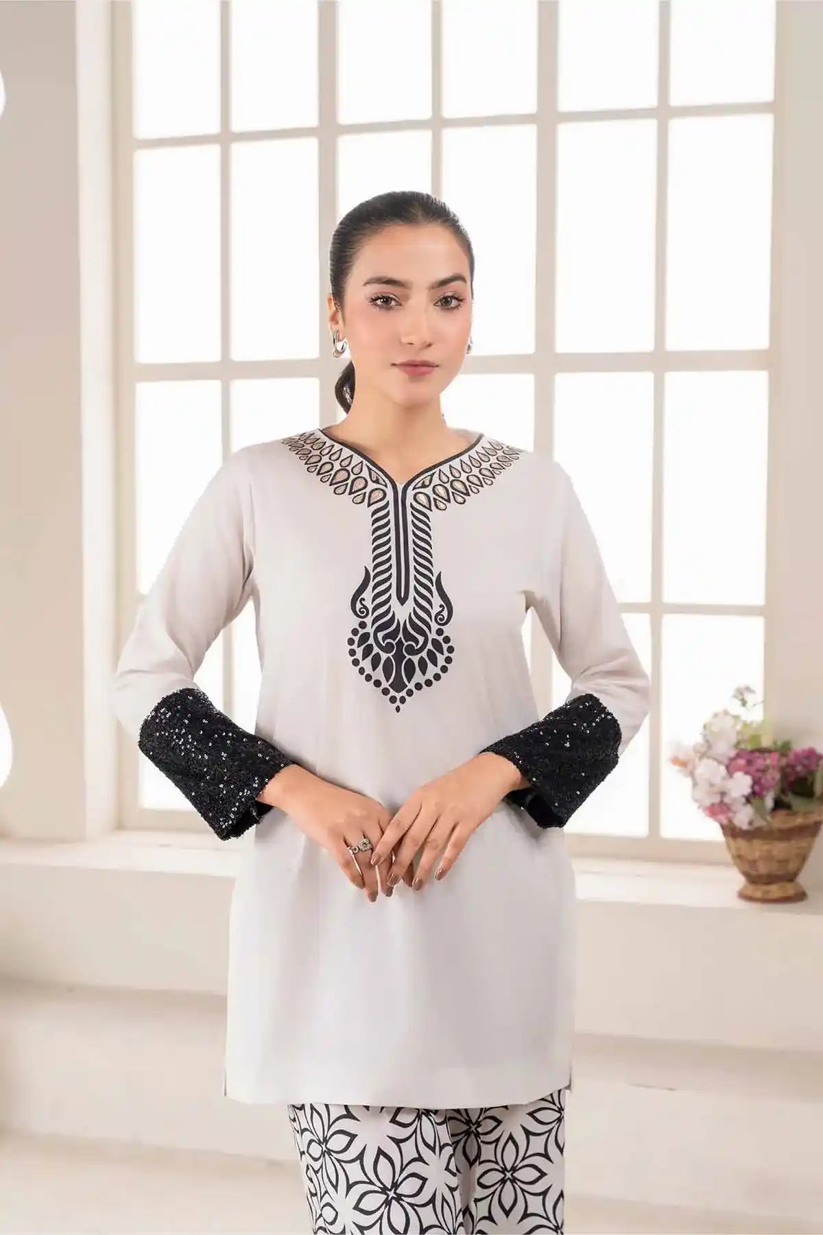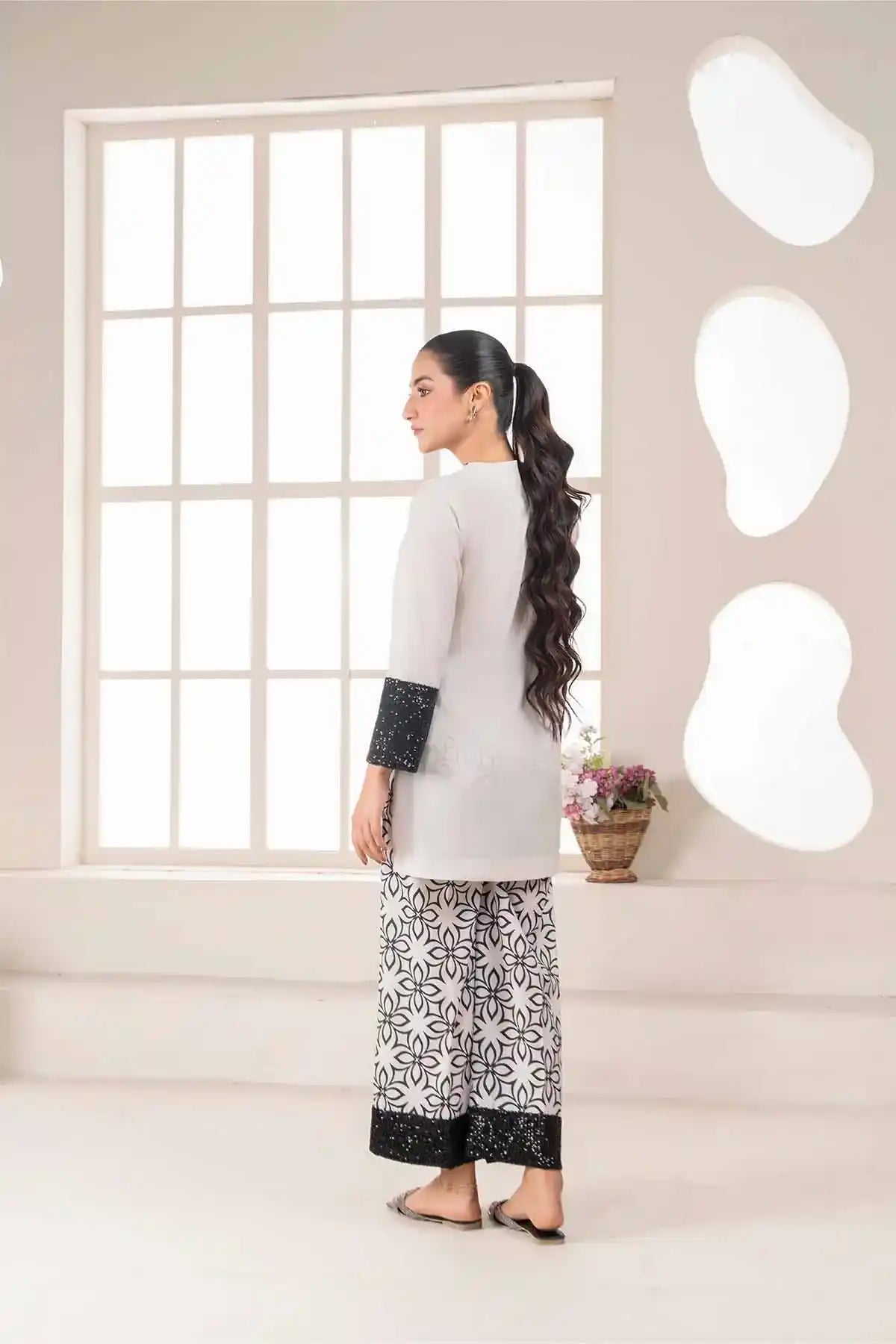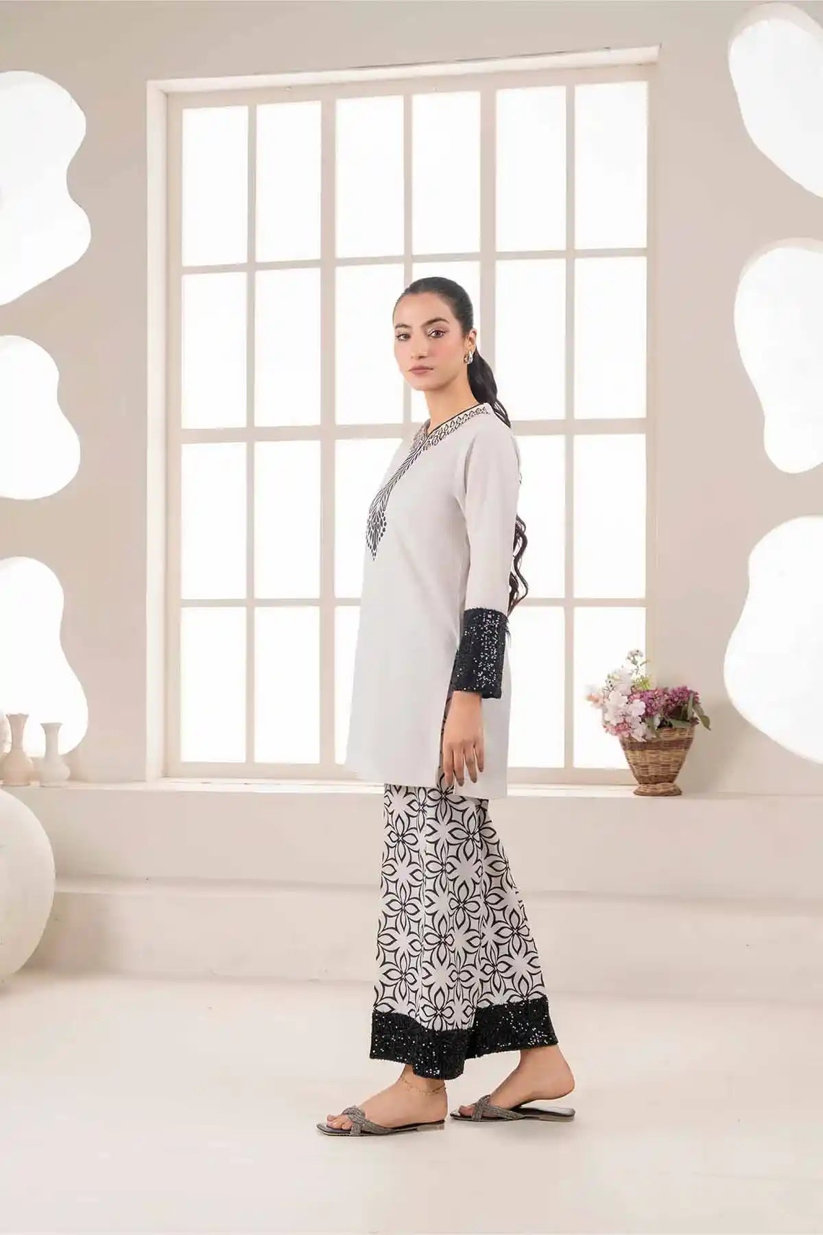 The shirt features an elegant ivory color with a printed neckline,adding a touch of intricate design.The neck area is adorned with delicate embroidery work,enhancing the overall appeal.The sleeves Black sequins fabric,adding a touch of sparkle and sophistication.The trousers feature a beautiful floral print,which brings a touch of color and vibrancy to the design.The floral pattern is complemented by the use of black sequins fabric at the bottom,creating an elegant contrast.The addition of the sequins adds a hint of sparkle and sophistication,making the trousers stand out with a refined,glamorous finish.