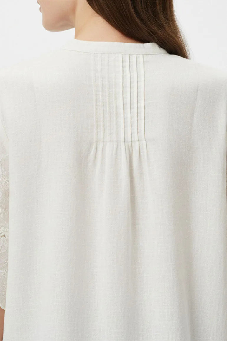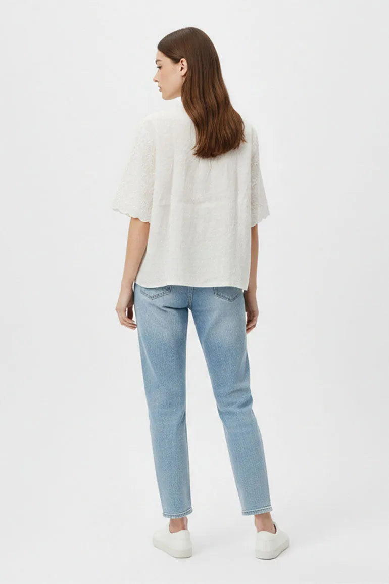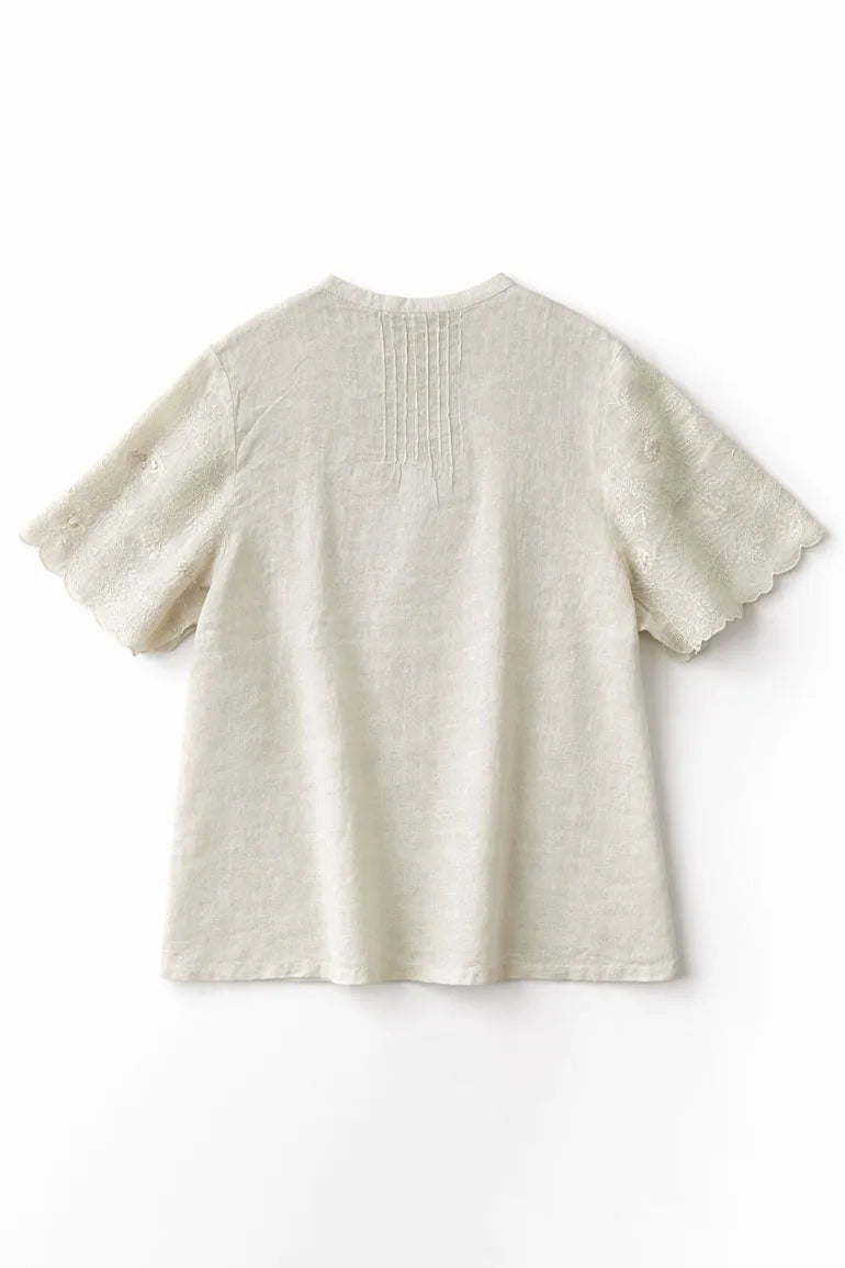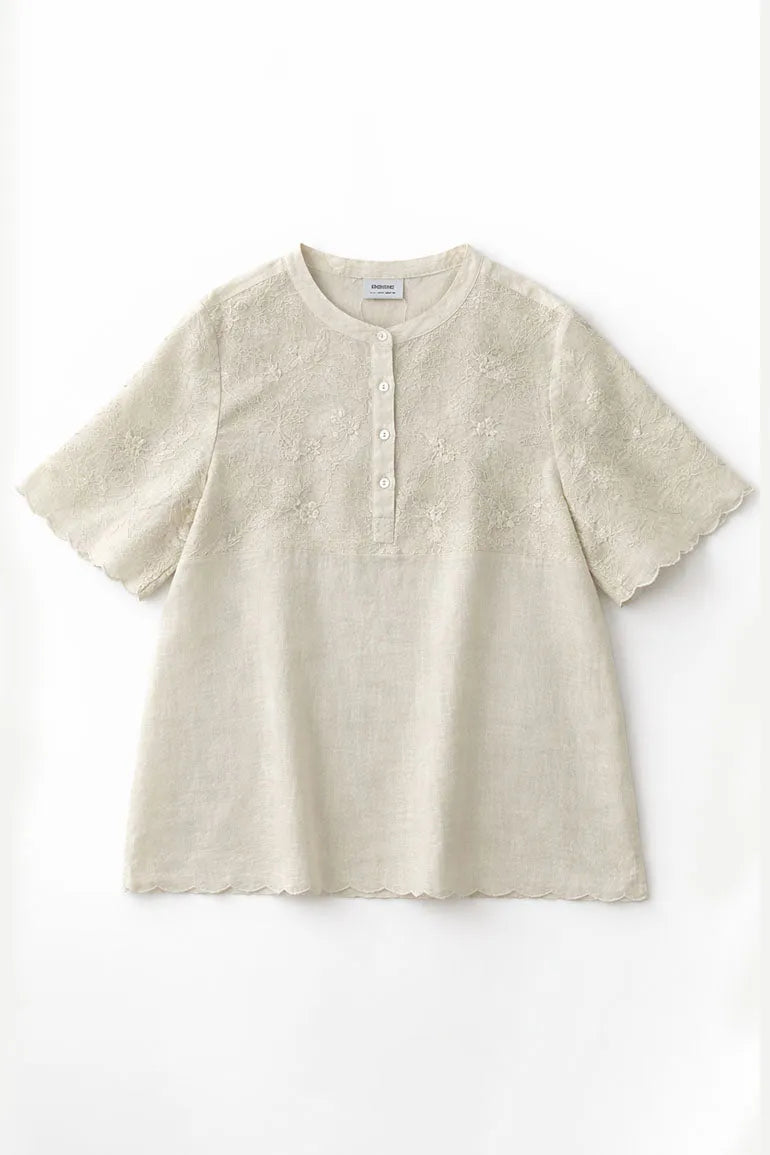 An elegant off-white top featuring delicate floral embroidery and flowy cape-style sleeves for a graceful silhouette. Crafted in a lightweight fabric with scalloped hem detailing, perfect for chic daytime outings or semi-formal occasions.