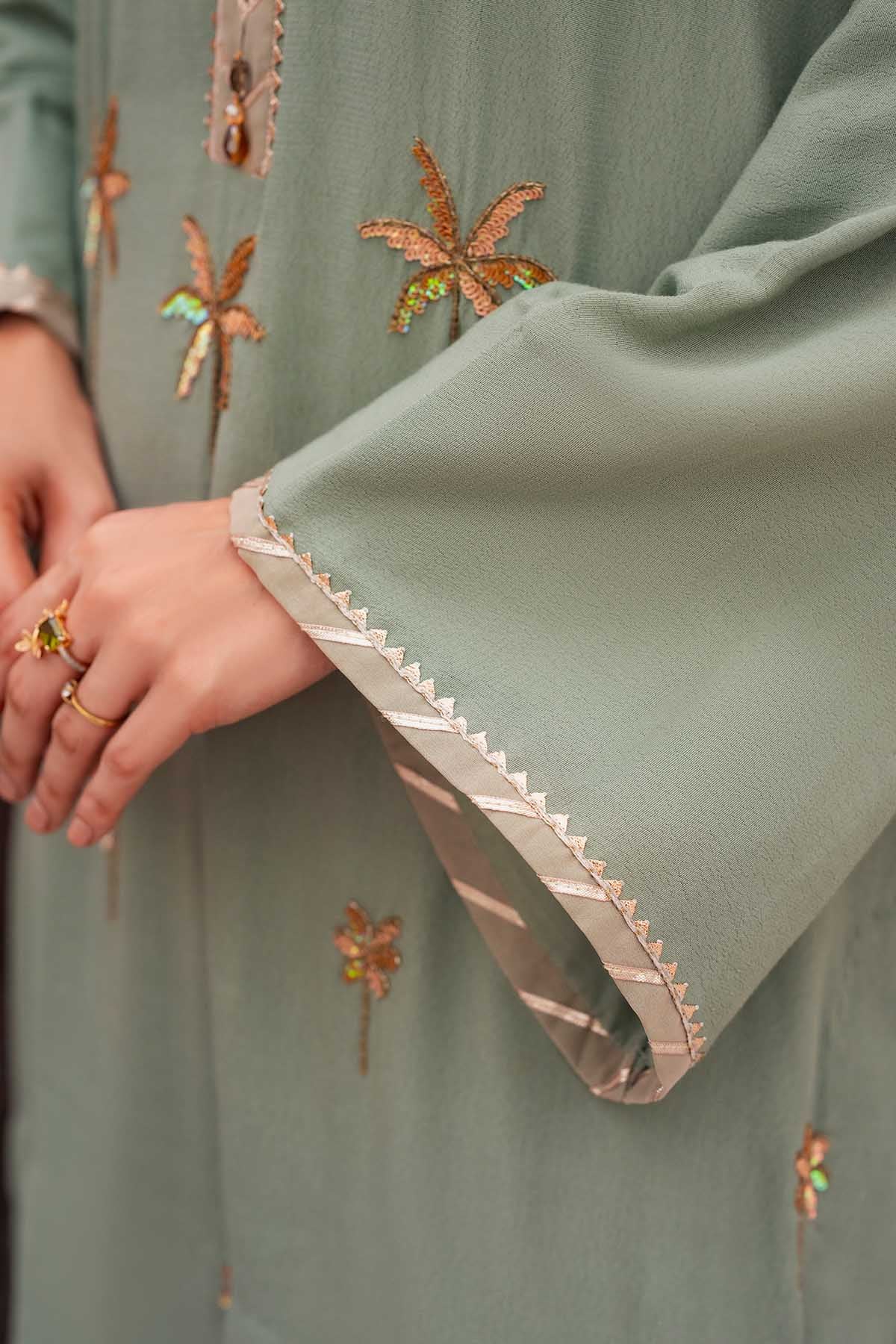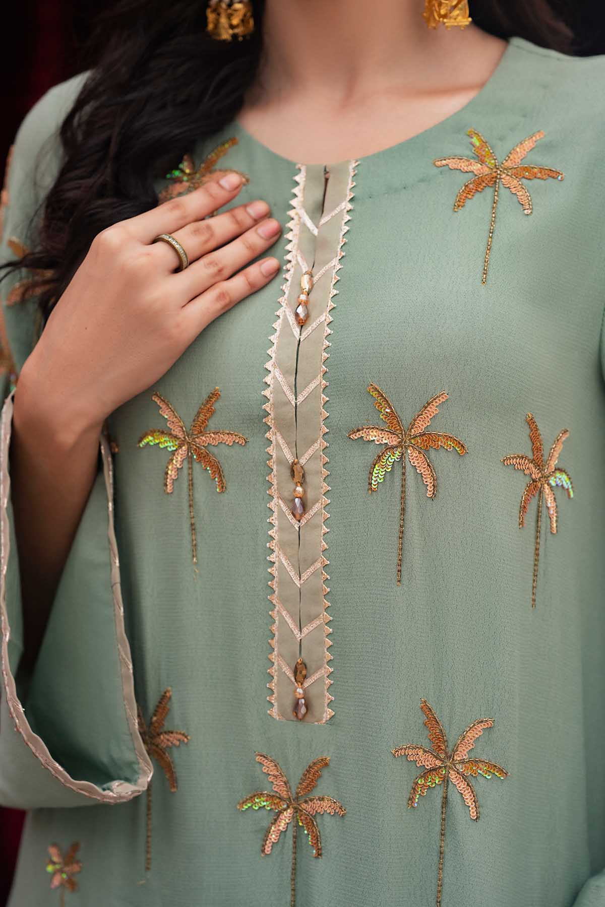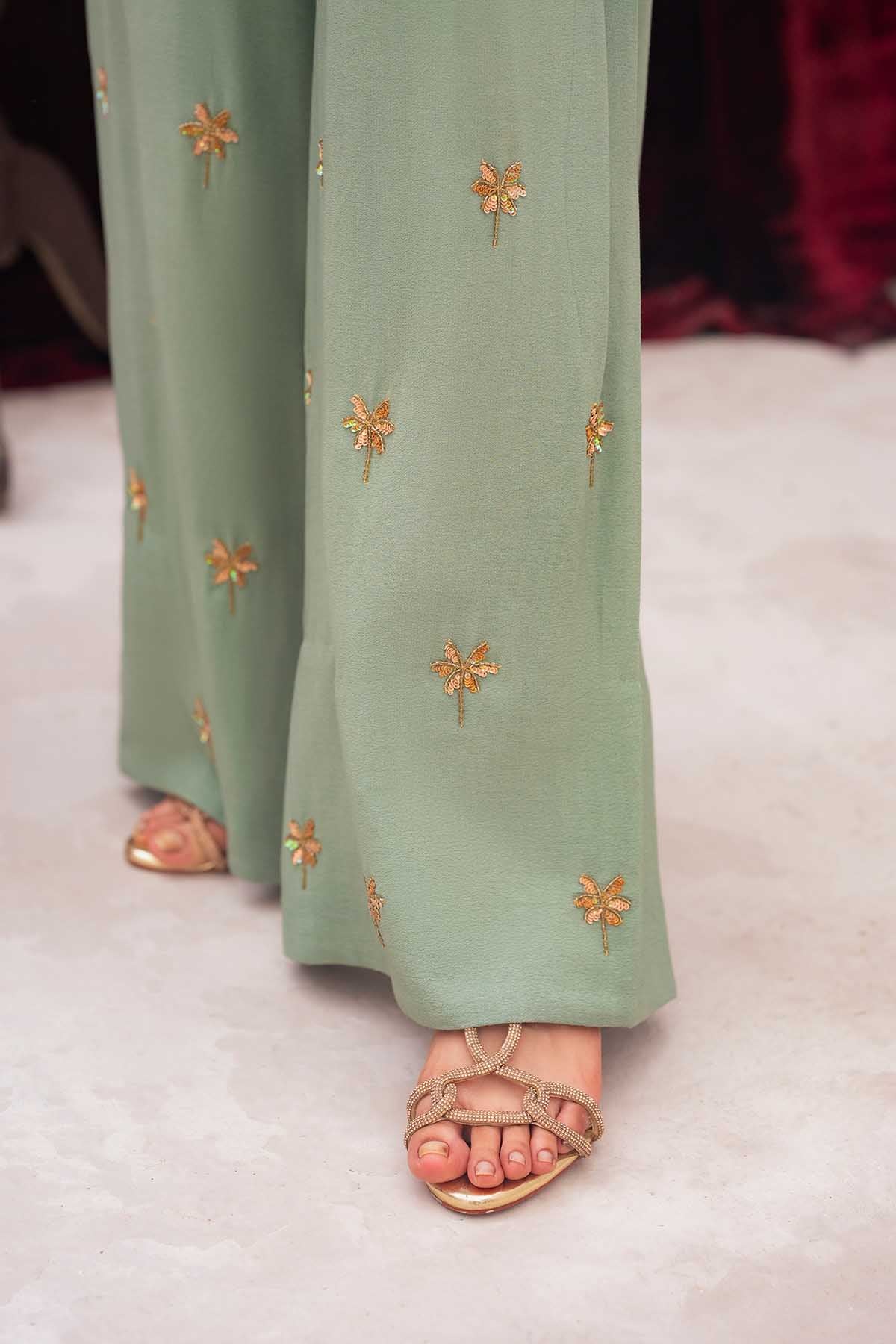Lia - Festive Formal - Vol 2: A Sage Green Ensemble Shimmering With Artisanal Finesse. A Crepe Georgette Short Shirt, Cut In A Timeless Straight A-Line Silhouette, Is Lavishly Embroidered With Cutdana In Palm Trees Motifs, Finished With Gota And Organza On Sleeves Hem And Neck. Paired With Tailored Crepe Georgette Culottes Featuring Intricate Palm Tree Motifs In Cutdana Embroidery. The Peach Airy Organza Dupatta, Adorned With Contrasting Thread And Gold Sequins Embroidery, Gota Lace Finishing And Delicate Scalloped Edging, Drapes Like A Whisper Of Regality.