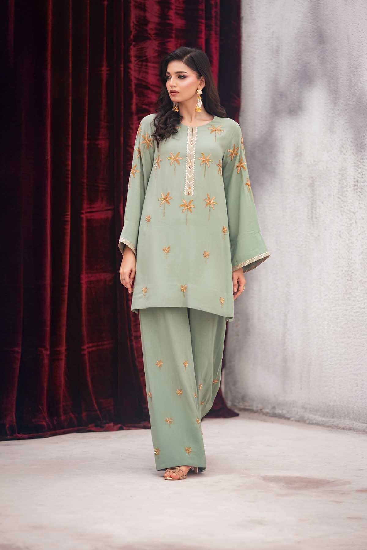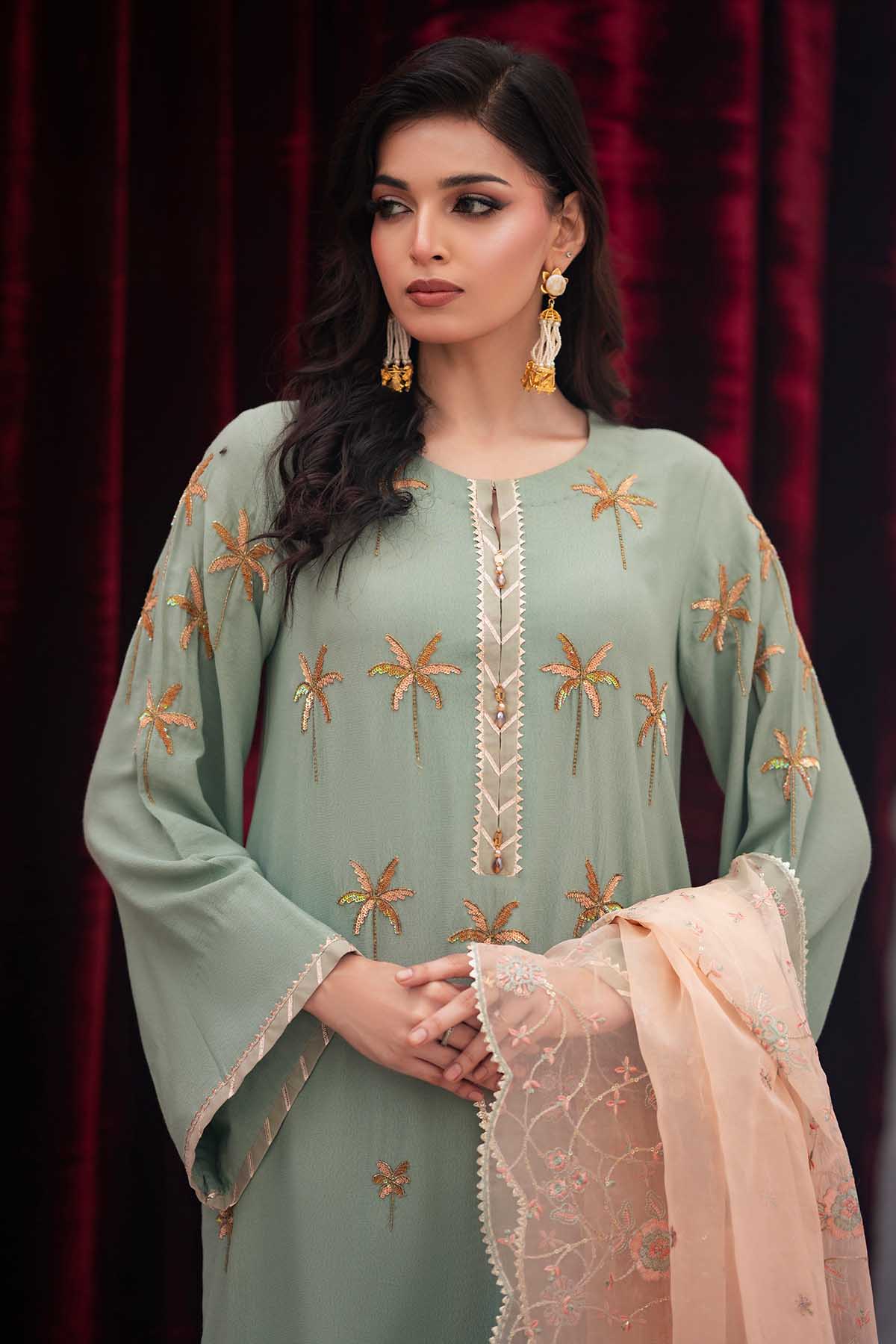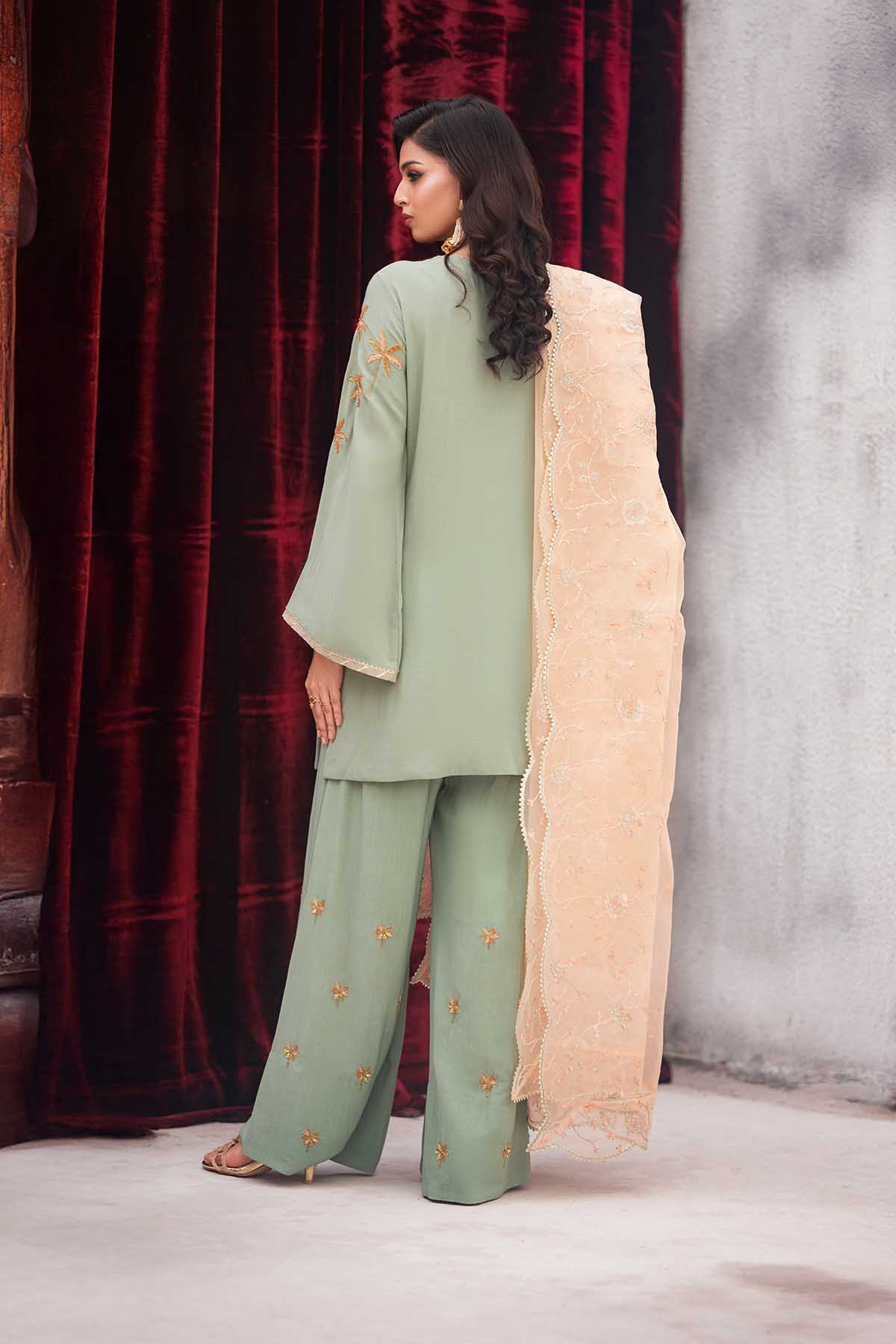 Lia - Festive Formal - Vol 2: A Sage Green Ensemble Shimmering With Artisanal Finesse. A Crepe Georgette Short Shirt, Cut In A Timeless Straight A-Line Silhouette, Is Lavishly Embroidered With Cutdana In Palm Trees Motifs, Finished With Gota And Organza On Sleeves Hem And Neck. Paired With Tailored Crepe Georgette Culottes Featuring Intricate Palm Tree Motifs In Cutdana Embroidery. The Peach Airy Organza Dupatta, Adorned With Contrasting Thread And Gold Sequins Embroidery, Gota Lace Finishing And Delicate Scalloped Edging, Drapes Like A Whisper Of Regality.