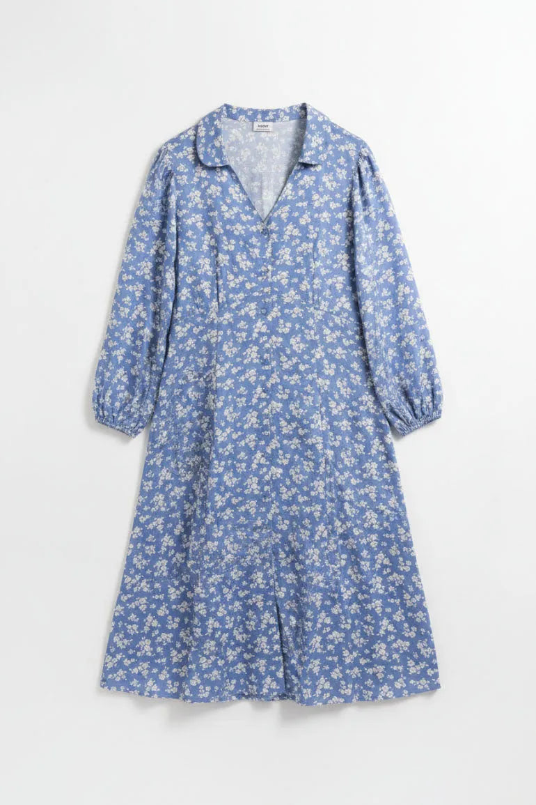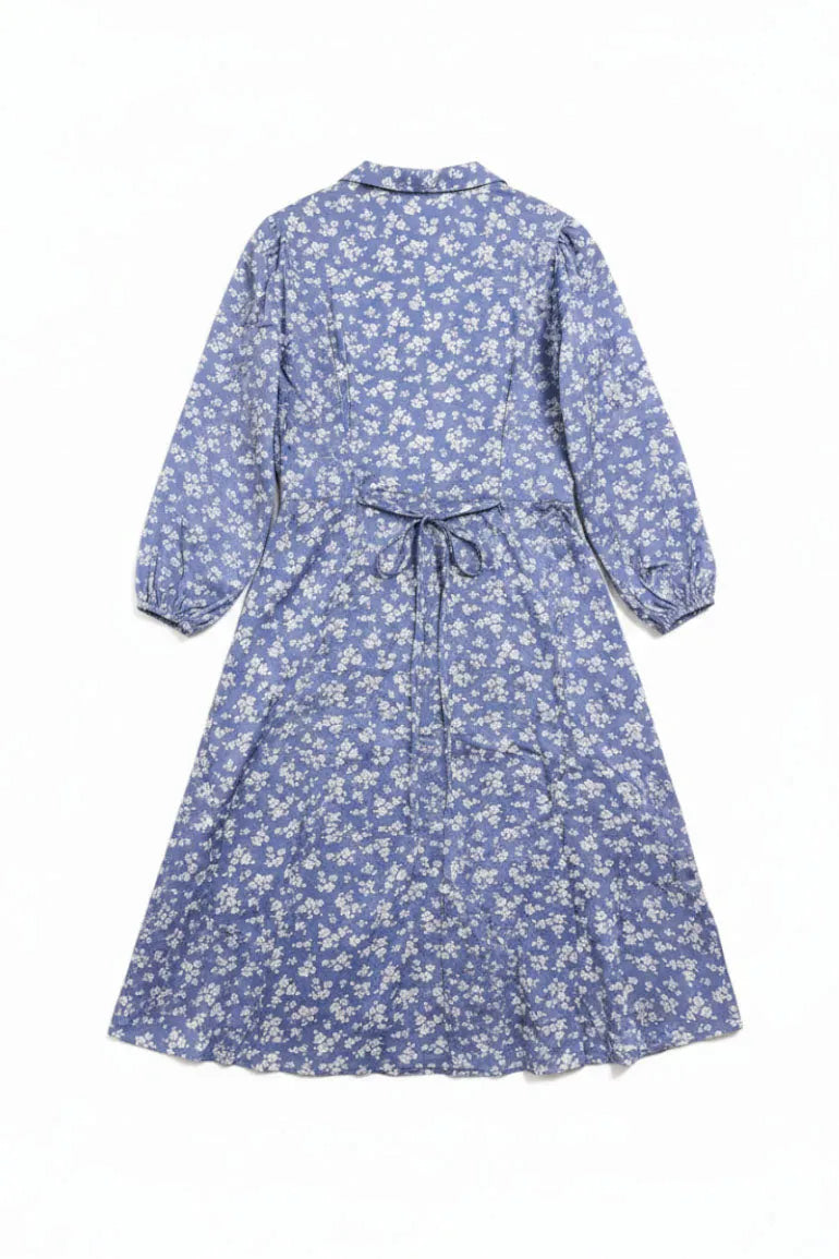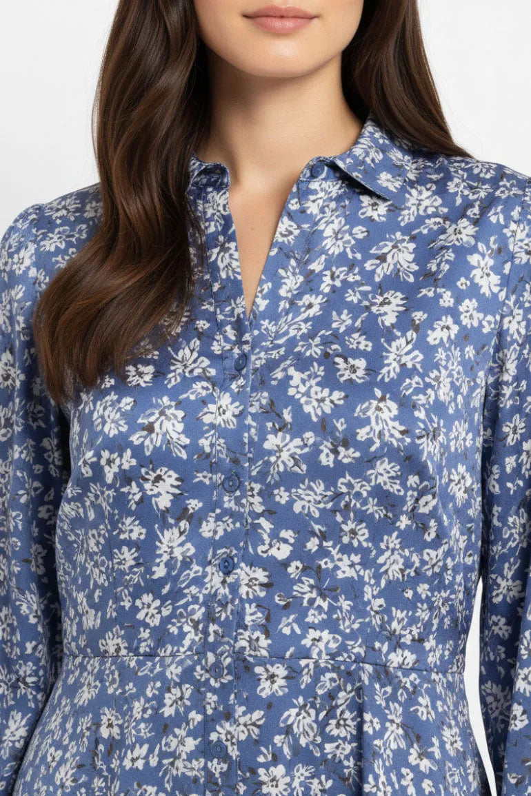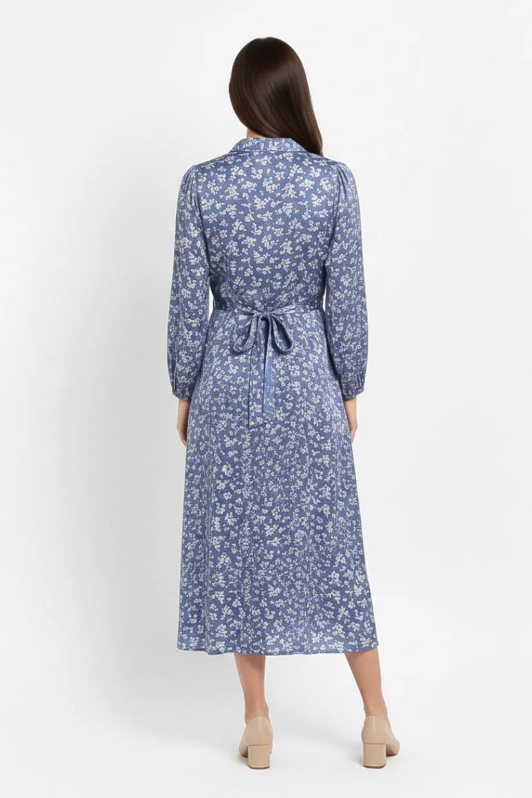 Graceful serenity blue dress for women featuring an all-over delicate floral print with a soft, flowy silhouette. Designed with a V-neckline and long sleeves for a timeless, feminine look. Perfect for everyday wear, casual outings, and effortless styling.