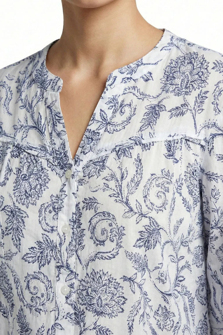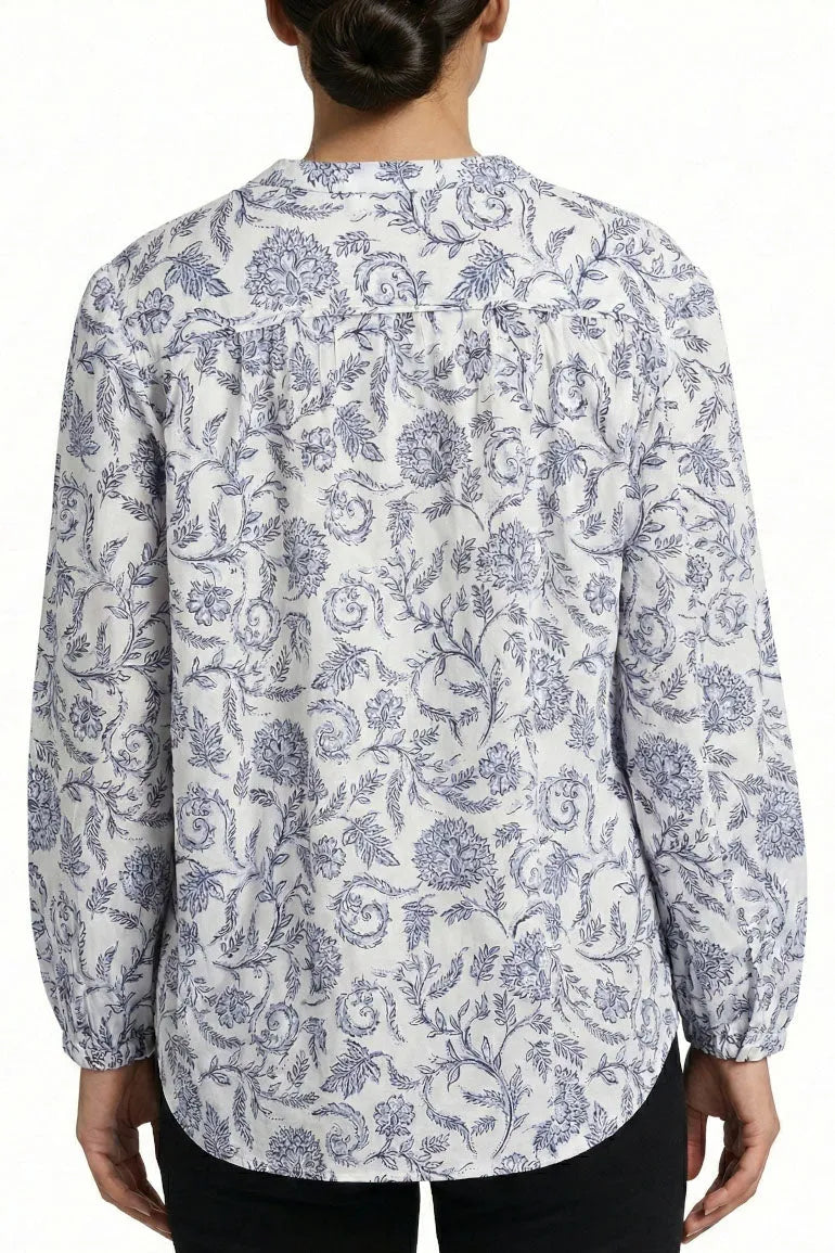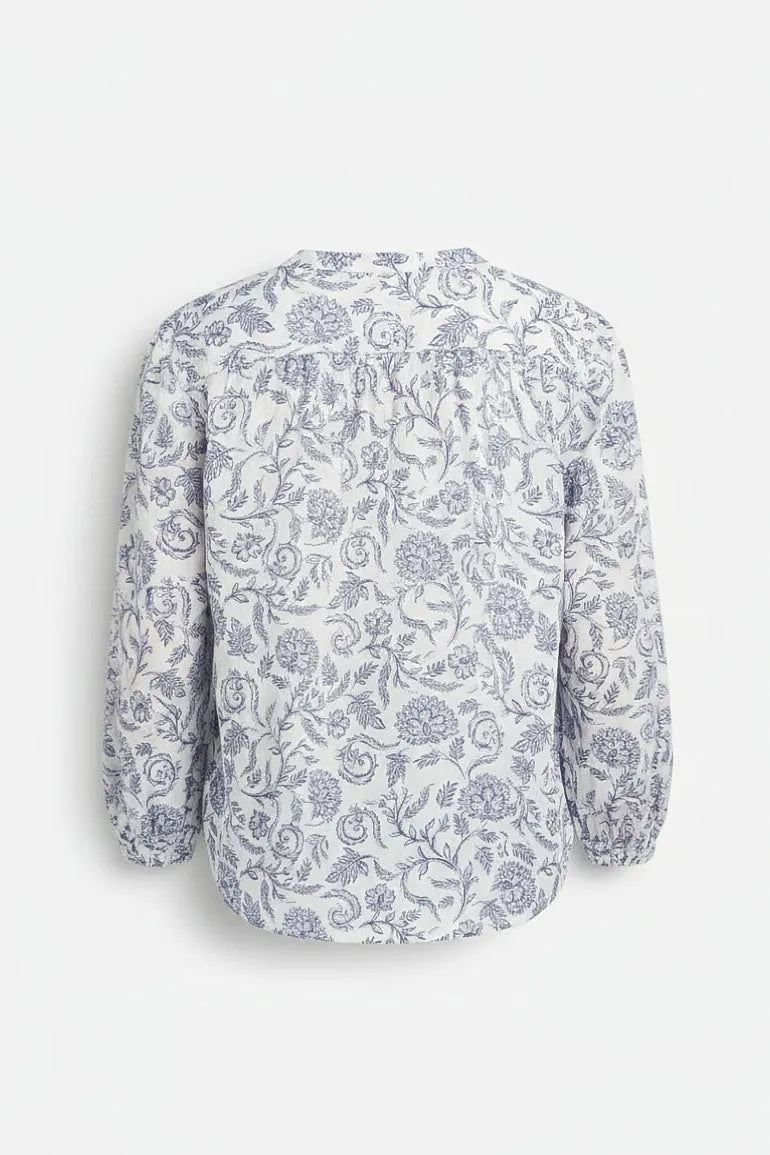 A lightweight women’s blouse featuring an elegant blue floral print on a soft base. Designed with a relaxed fit, subtle gathers, and full sleeves for effortless everyday styling. Perfect for both casual and semi-formal looks.