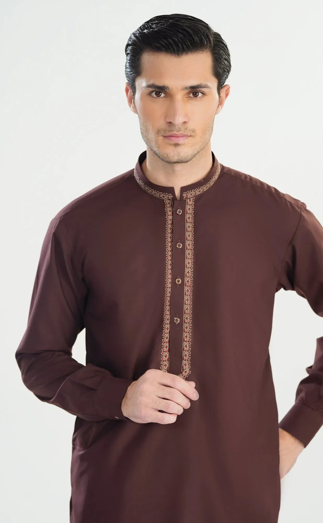 Formal Mahogany Kurta Shalwar Featuring Collar Neck And Intricate Embroidery. Crafted From Premium Fabric, Comfortable Fit, Ideal For Weddings, Eid, And Special Formal Events.