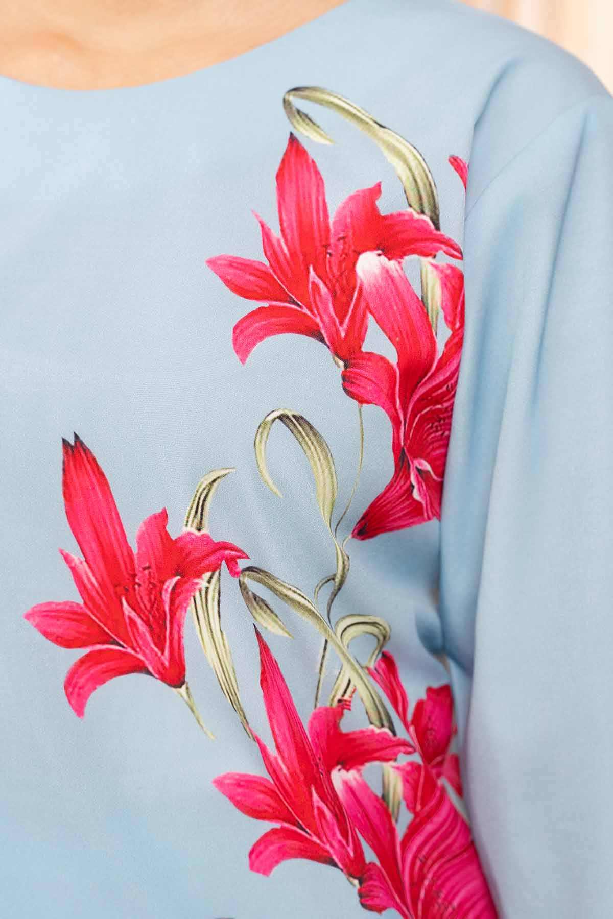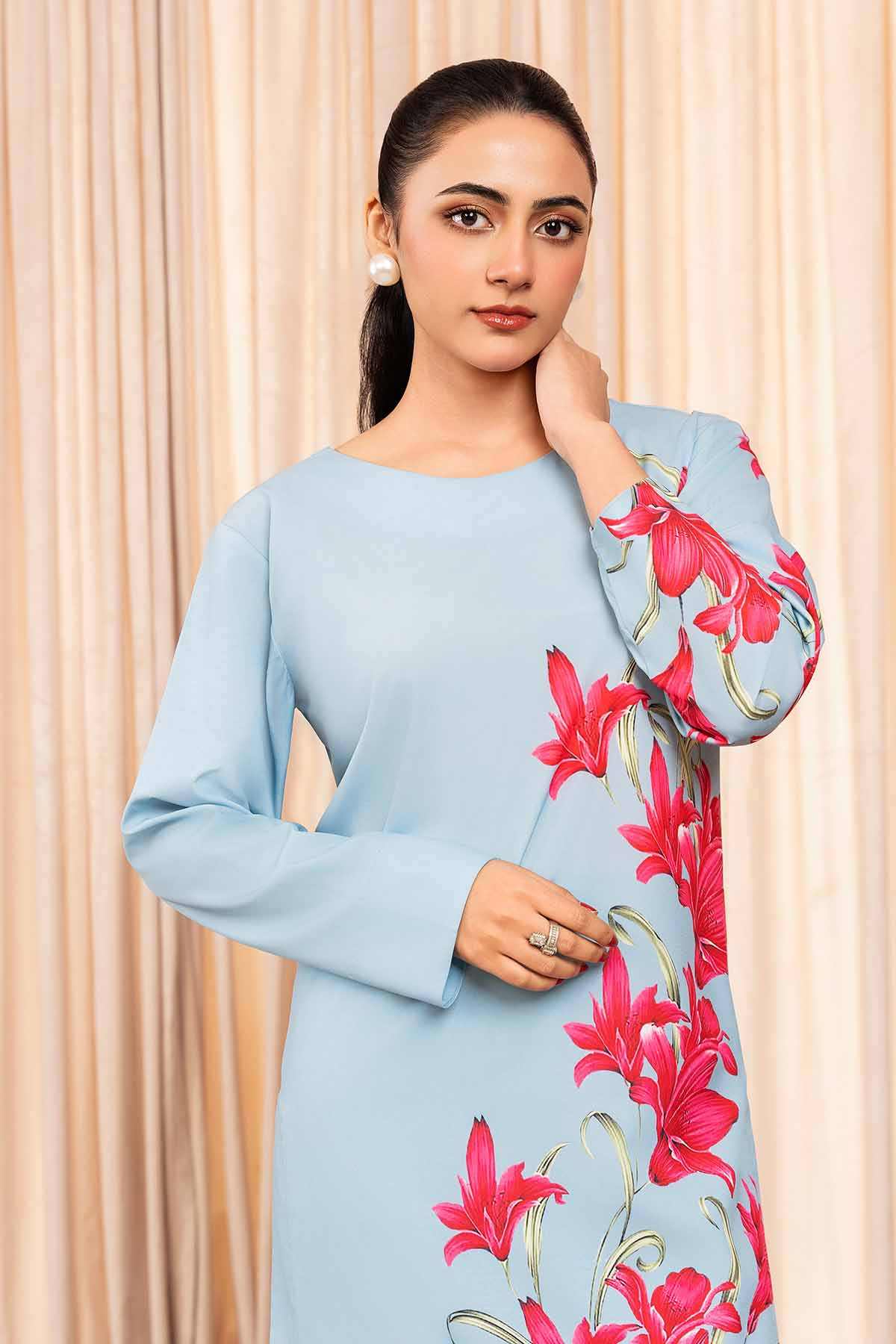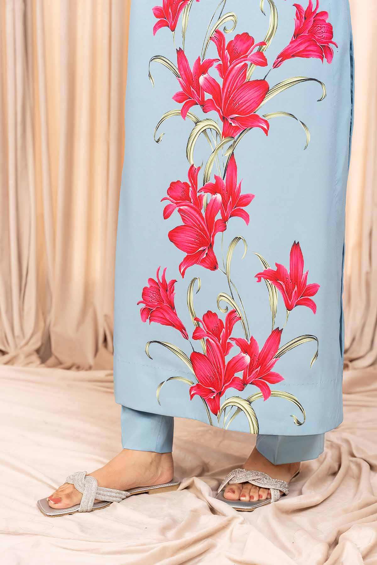 The Frosted Blue dress made with breathable crepe fabric with excellent drape in pink flowers is a delightful combination that exudes a sense of freshness and charm.This design is perfect for spring and summer collections,evoking feelings of joy and renewal.The combination creates a harmonious and visually appealing contrast.