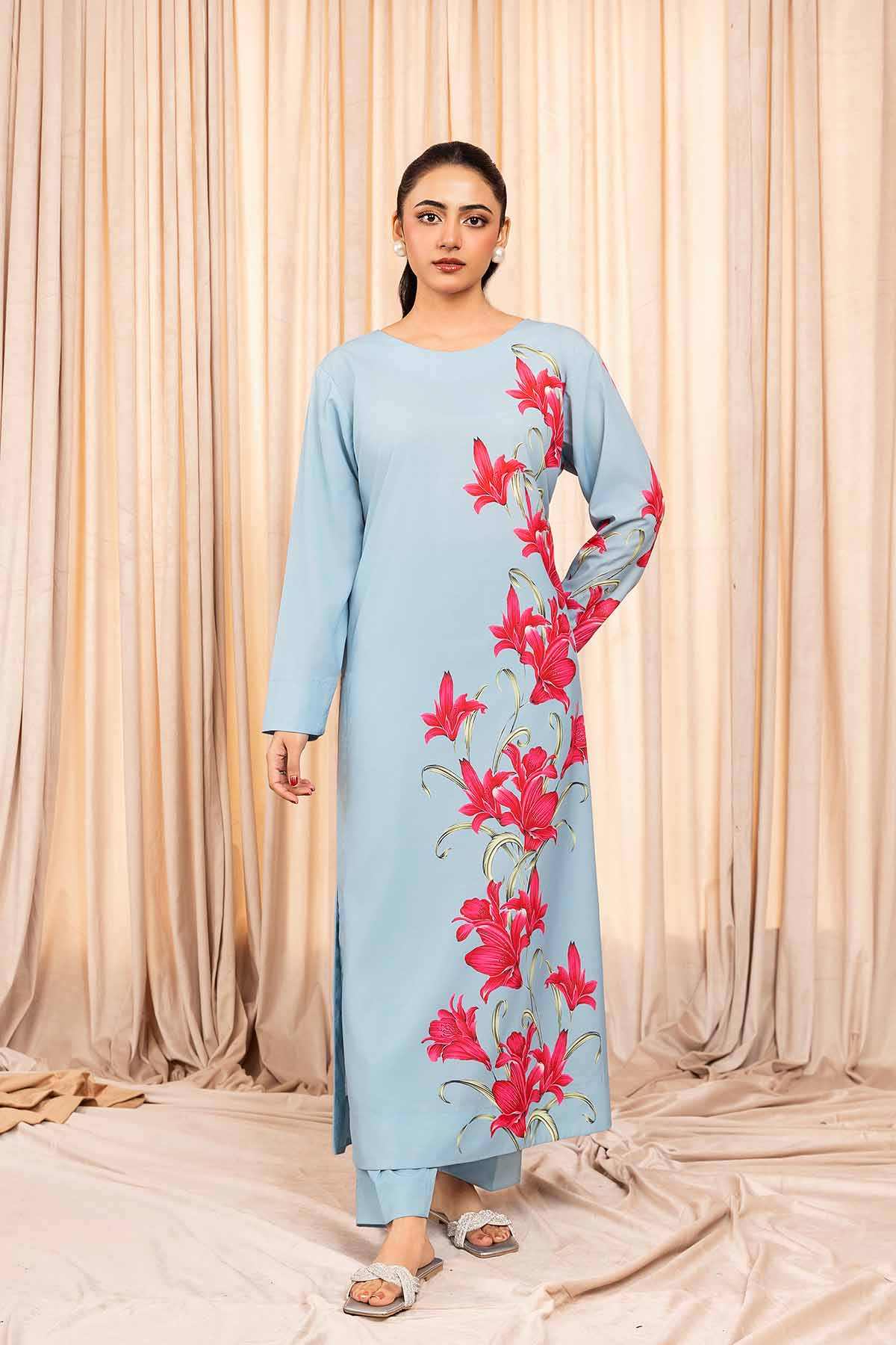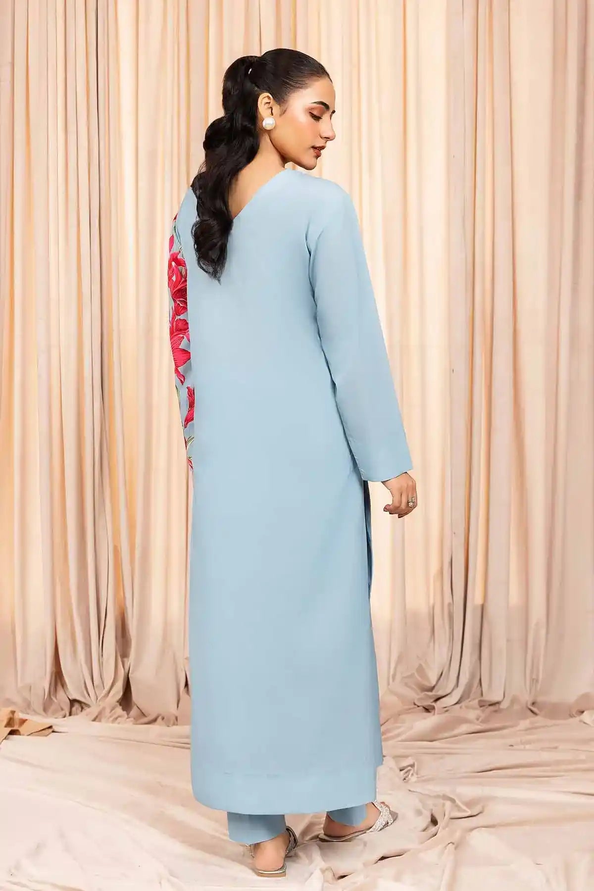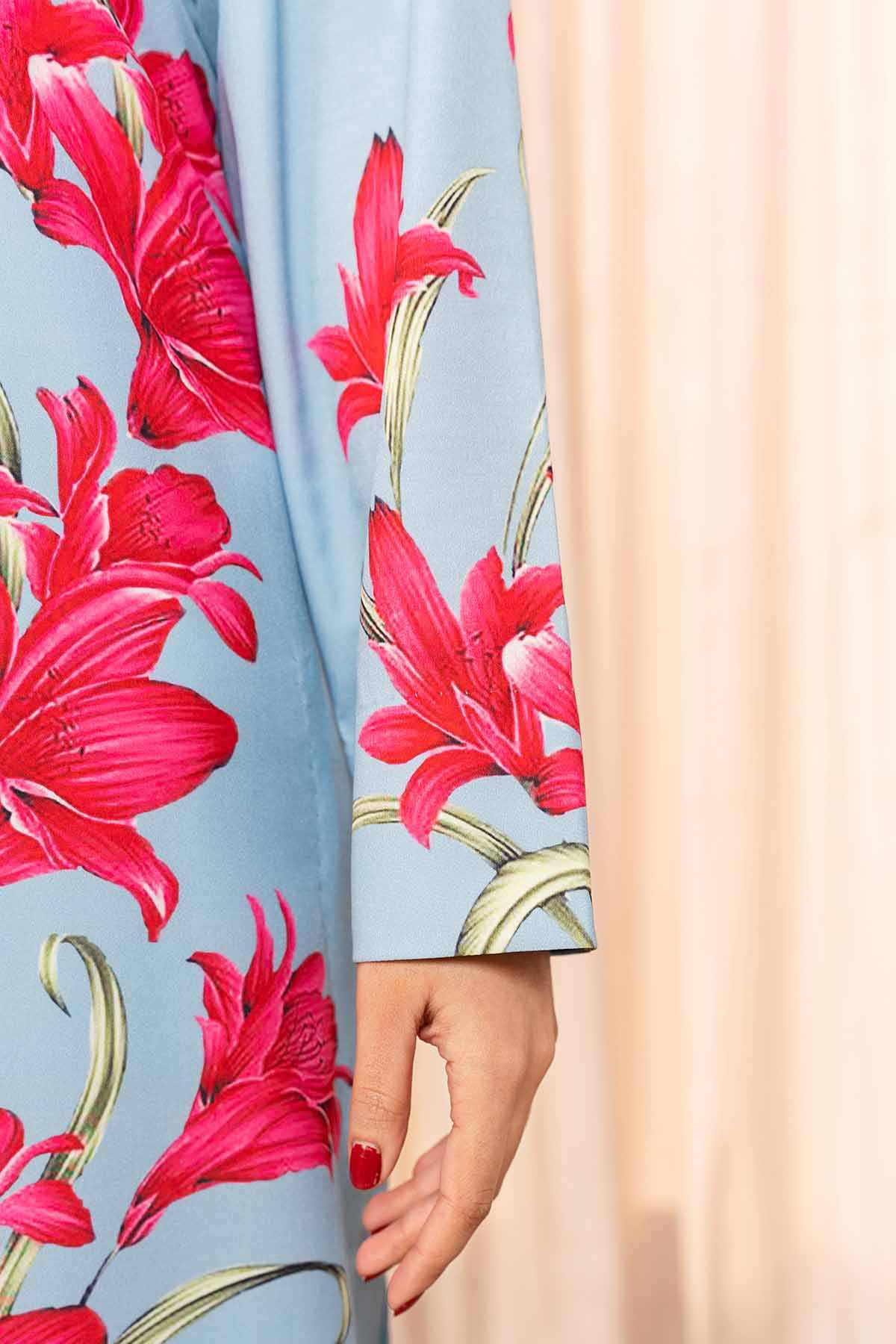 The Frosted Blue dress made with breathable crepe fabric with excellent drape in pink flowers is a delightful combination that exudes a sense of freshness and charm.This design is perfect for spring and summer collections,evoking feelings of joy and renewal.The combination creates a harmonious and visually appealing contrast.