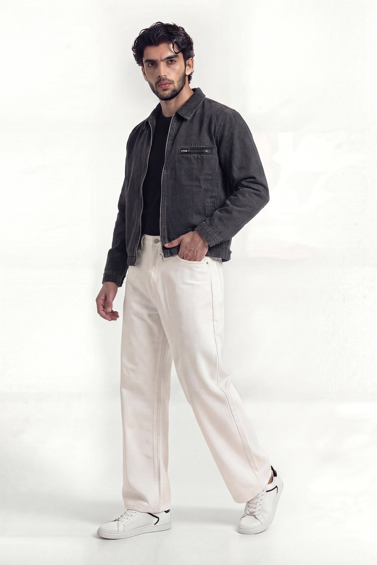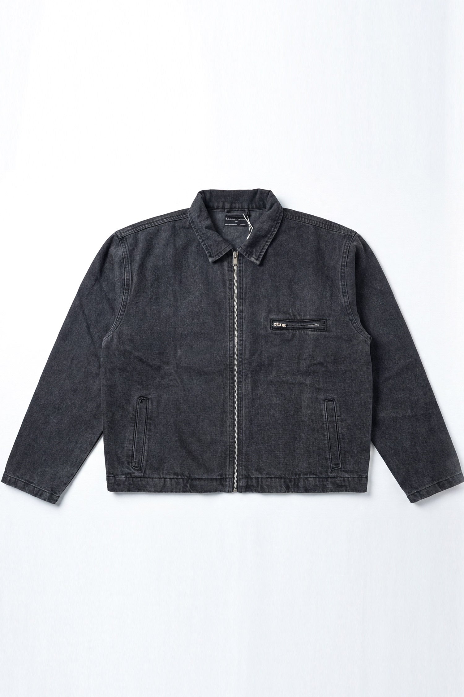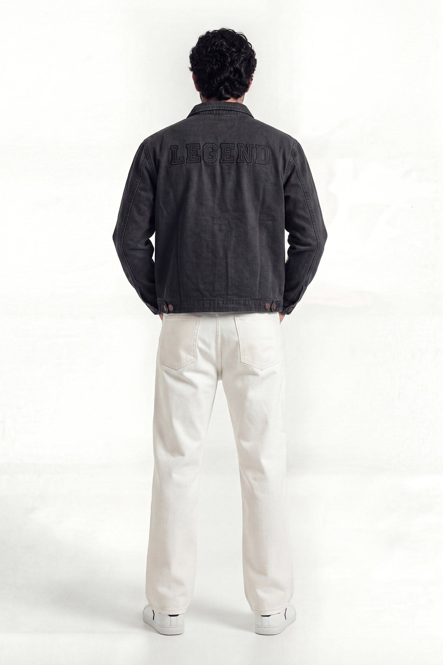 This denim jacket features a sleek zip-up front with a collar features the text "LEGEND" done in patchwork on the back and designed with slanted welt pockets and a zip chest pocket for added utility. A versatile layering piece that blends casual ease with workwear-inspired style.