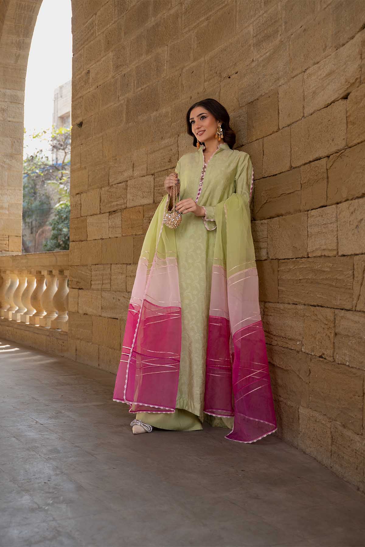 Meethi Yaadein-Eid Festive:This Elegant Ensemble Features A Soft Pistachio-Green Long Kurta Crafted In A Subtly Textured Jacquard Sheesha Silk Fabric, Adorned With Delicate Floral Motifs That Add Depth And Sophistication. The Neckline Is Finished With Scalloped Blush-Pink Lace Detailing, Complemented By Pearl And Gold-Toned Swarovski Crystals Accents That Lend A Refined, Handcrafted Touch.