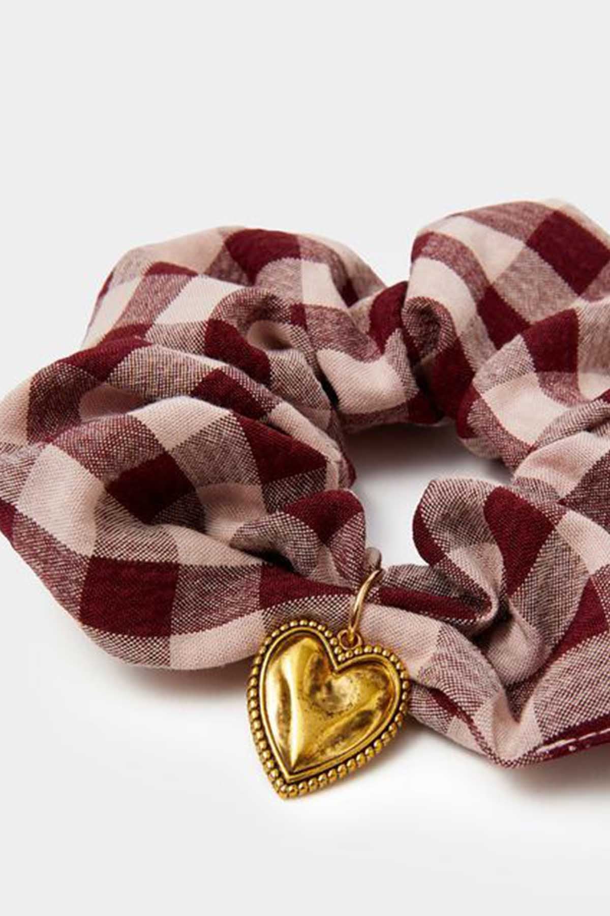 Heart Charm Check Print Hair Scrunchie