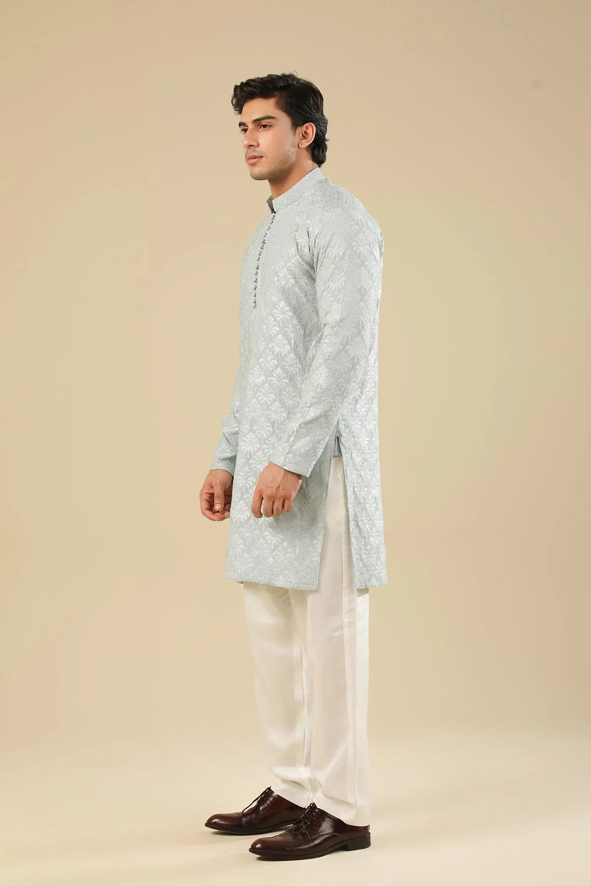 Abroo - Ice Blue Raw Silk Embroidered Kurta Trouser - Men