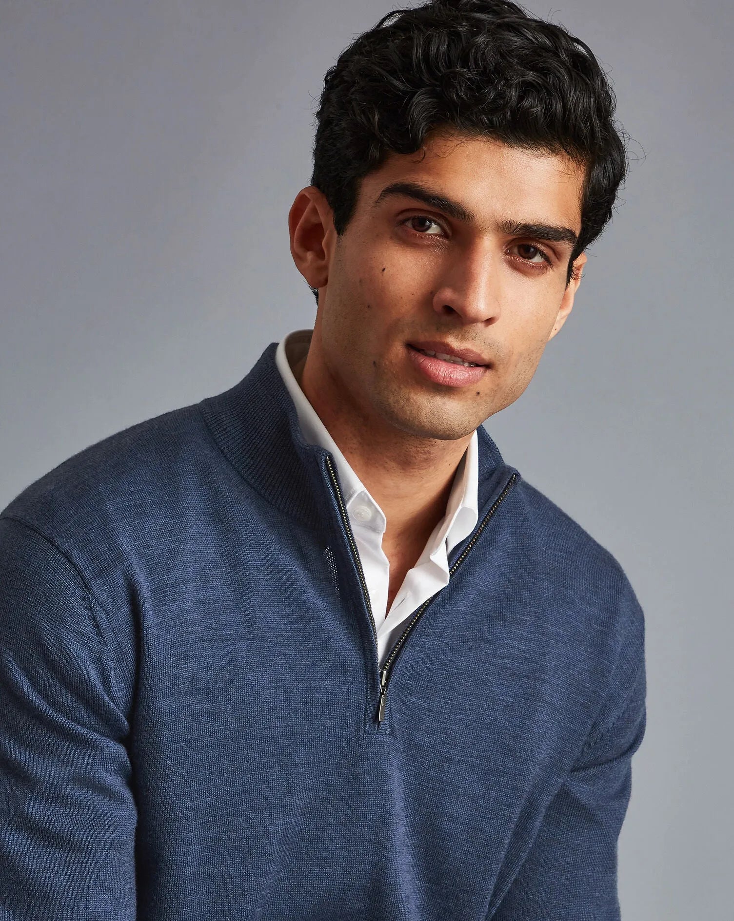 Indigo Blue Melange Pure Merino Zip Neck Jumper