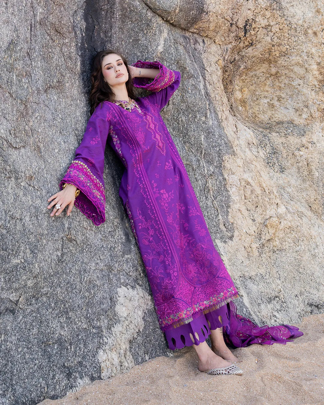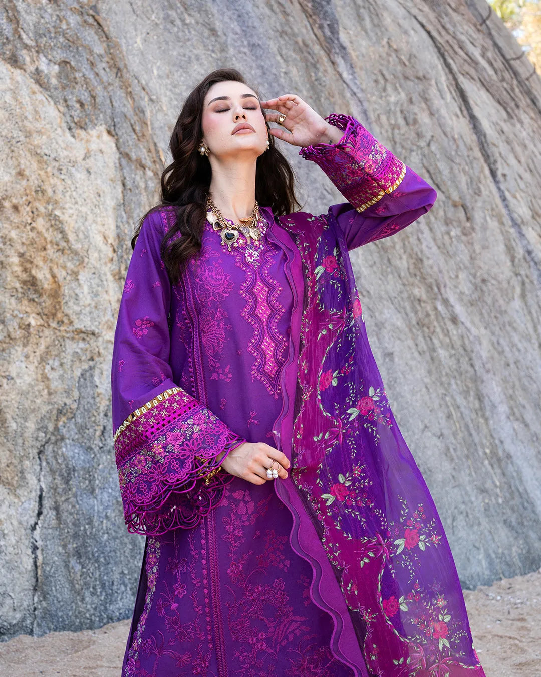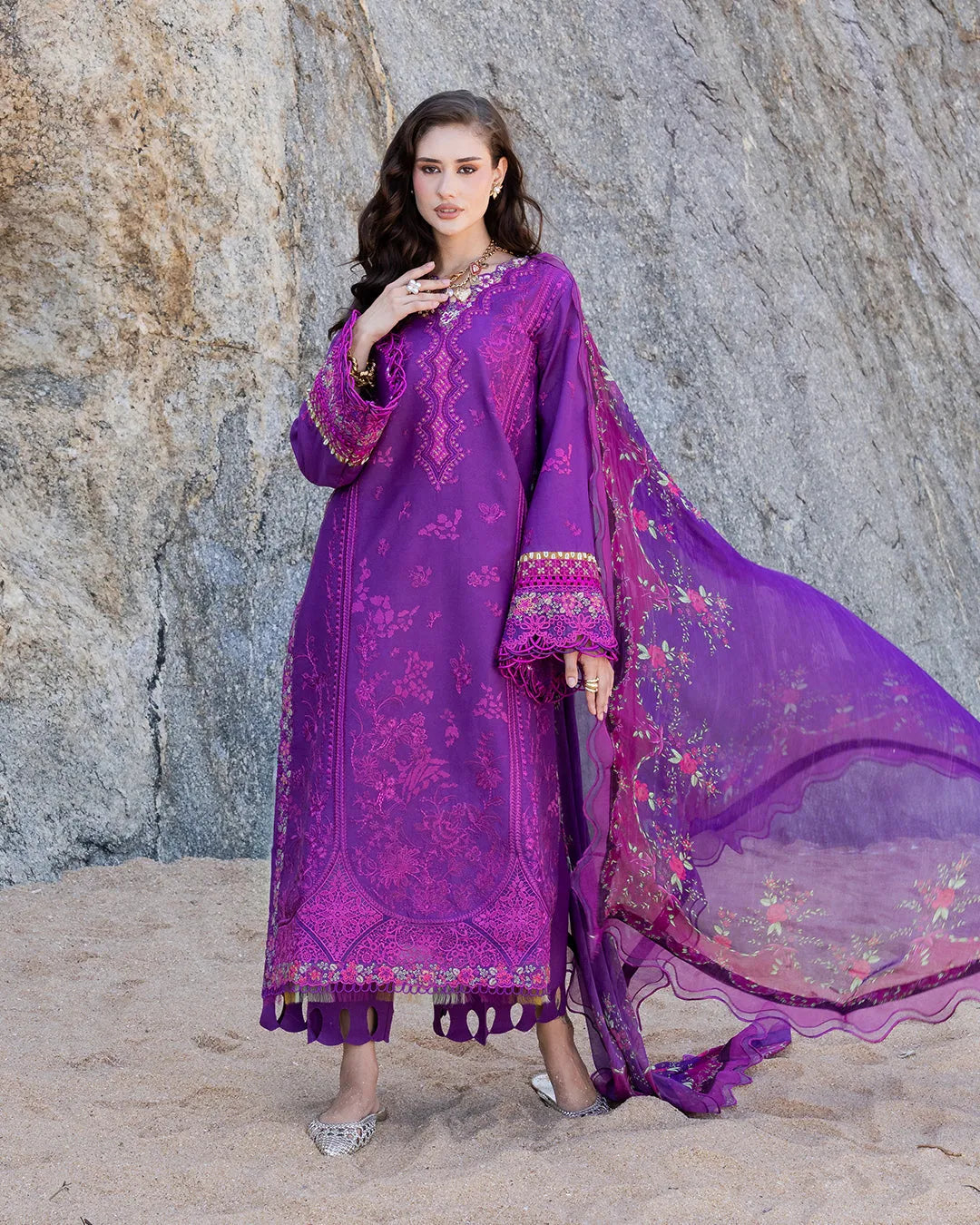 Amethyst presents a stunning three-piece lawn suit in violet, featuring an elegant scalloped border and intricate embroidered detailing along the side seams and sleeves. The ensemble includes tailored dyed cotton trousers and a premium chiffon printed dupatta, delivering understated luxury and refined style.