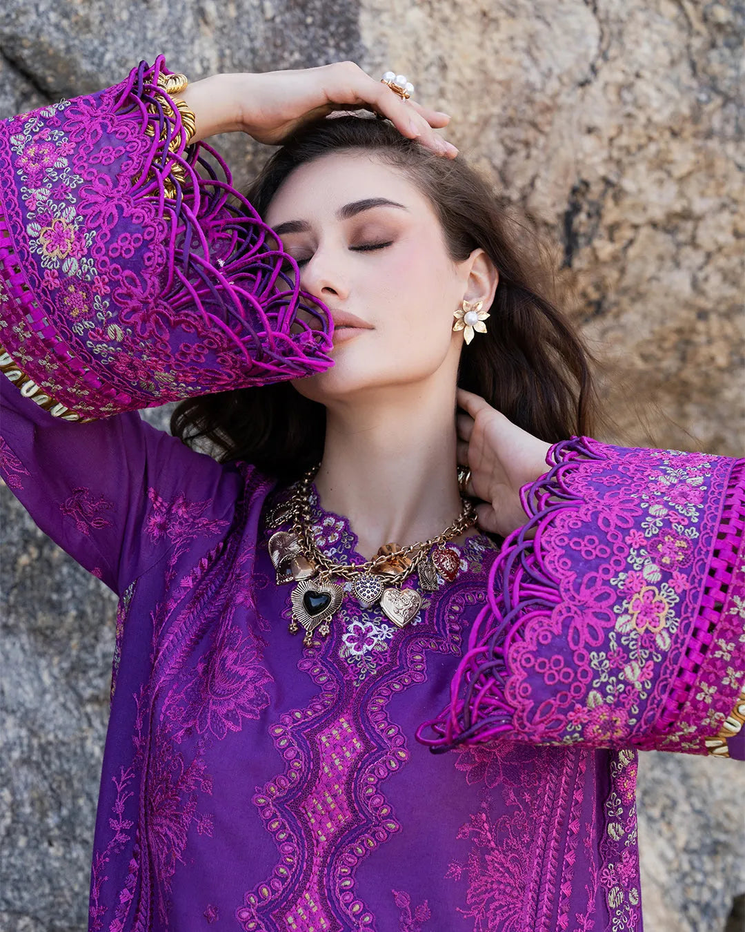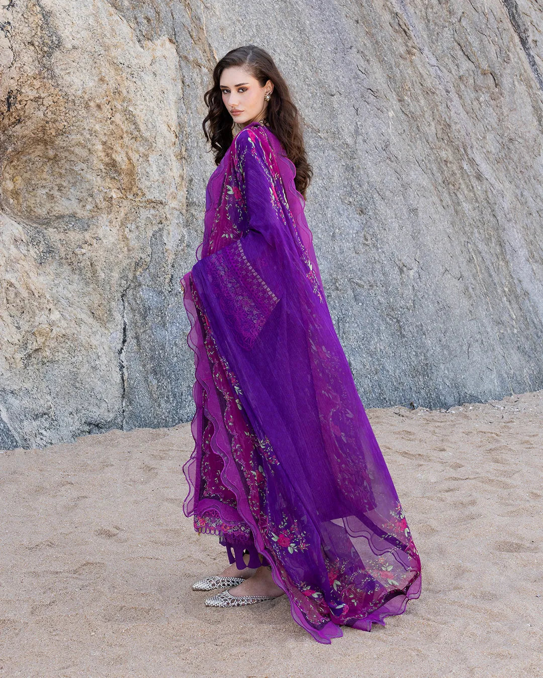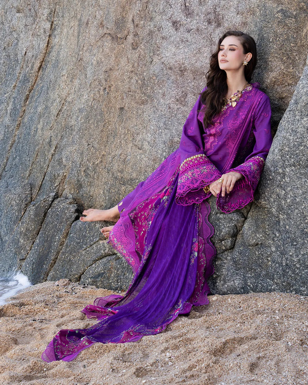 Amethyst presents a stunning three-piece lawn suit in violet, featuring an elegant scalloped border and intricate embroidered detailing along the side seams and sleeves. The ensemble includes tailored dyed cotton trousers and a premium chiffon printed dupatta, delivering understated luxury and refined style.