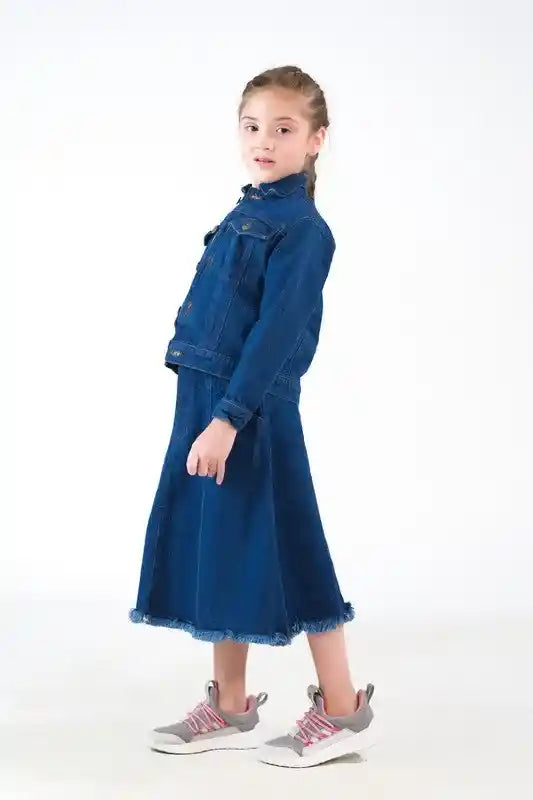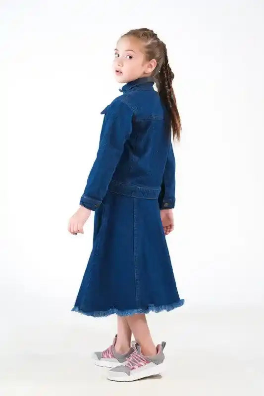 This dark wash denim jacket is perfect for girls looking for a stylish and versatile addition to their wardrobe. Made with durable denim material, this jacket will keep you warm and add a touch of edge to any outfit. The timeless design and comfortable fit make it a must-have for any fashion-forward girl.