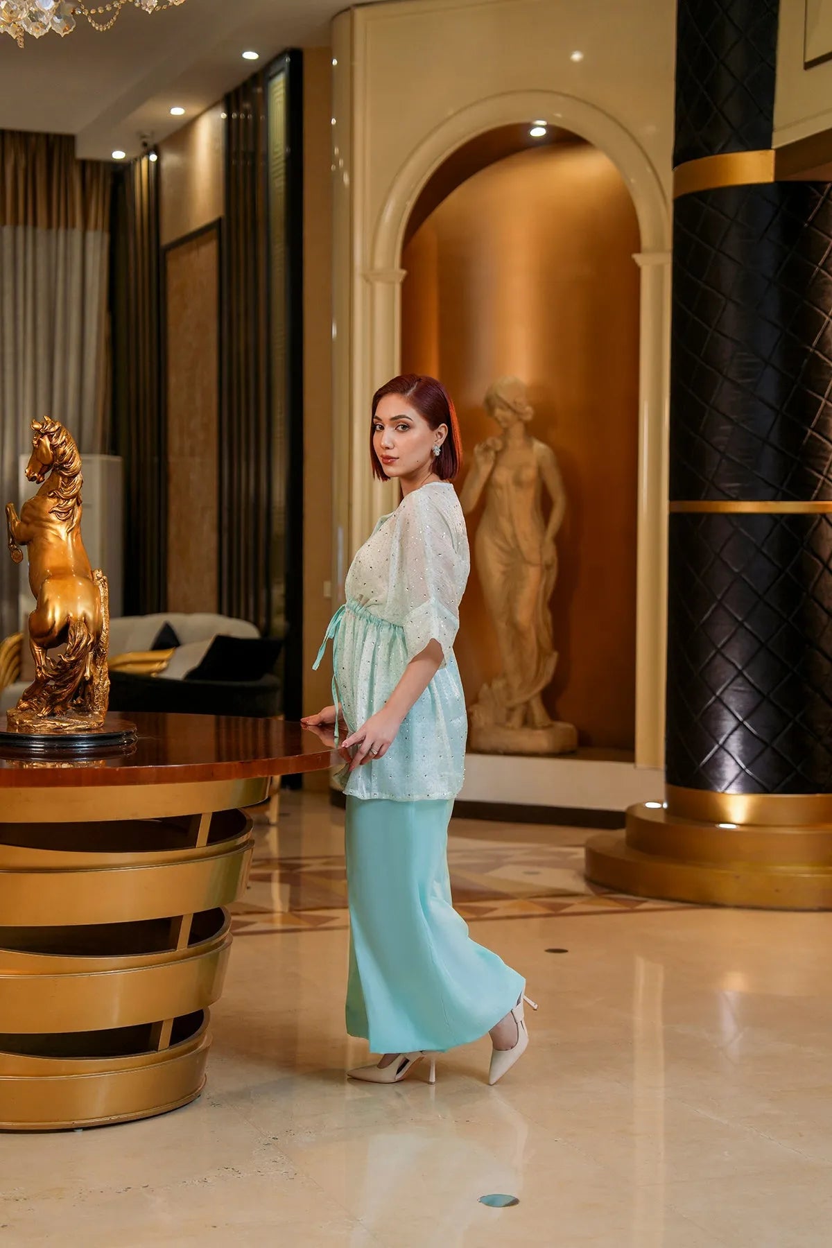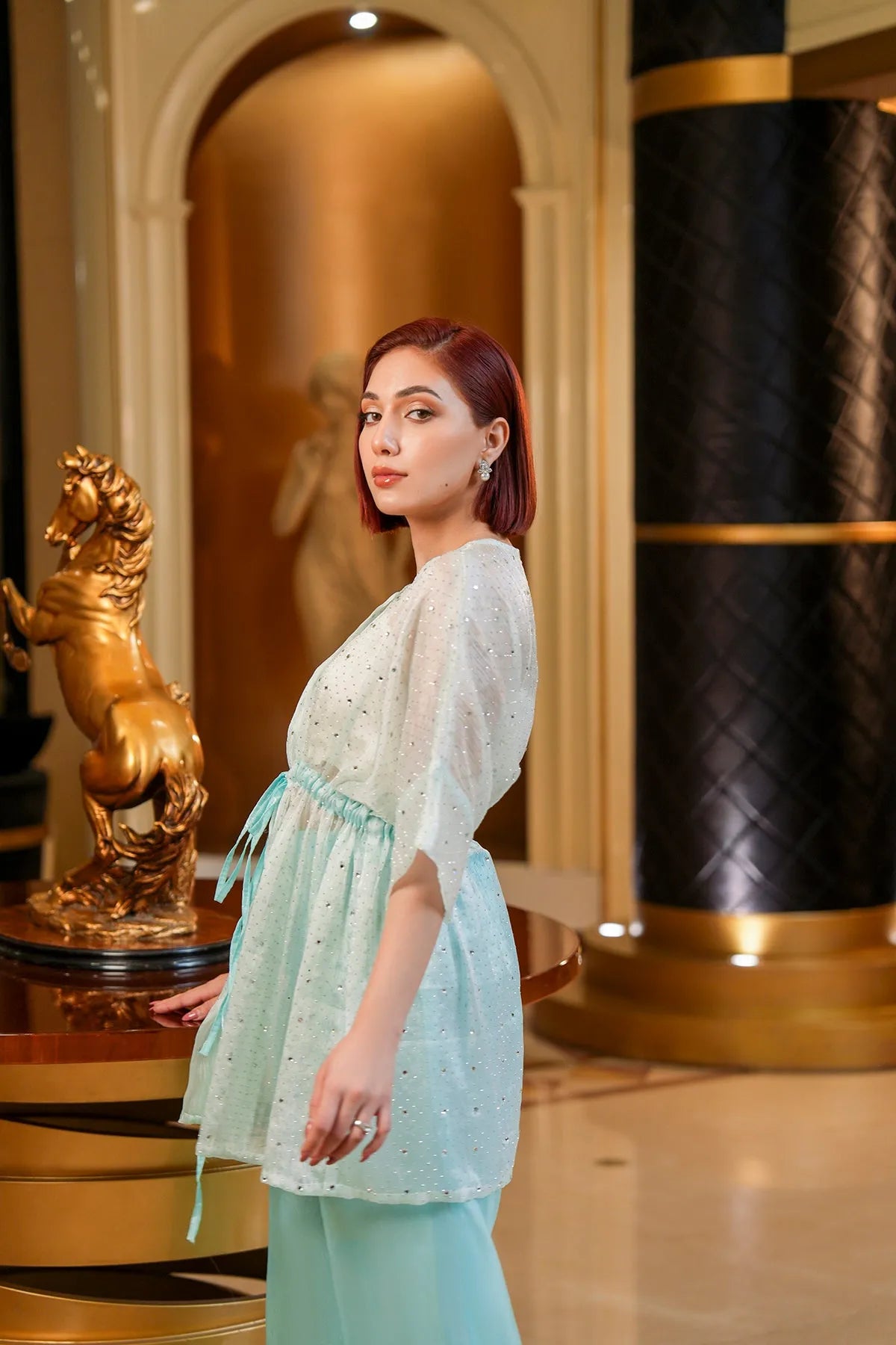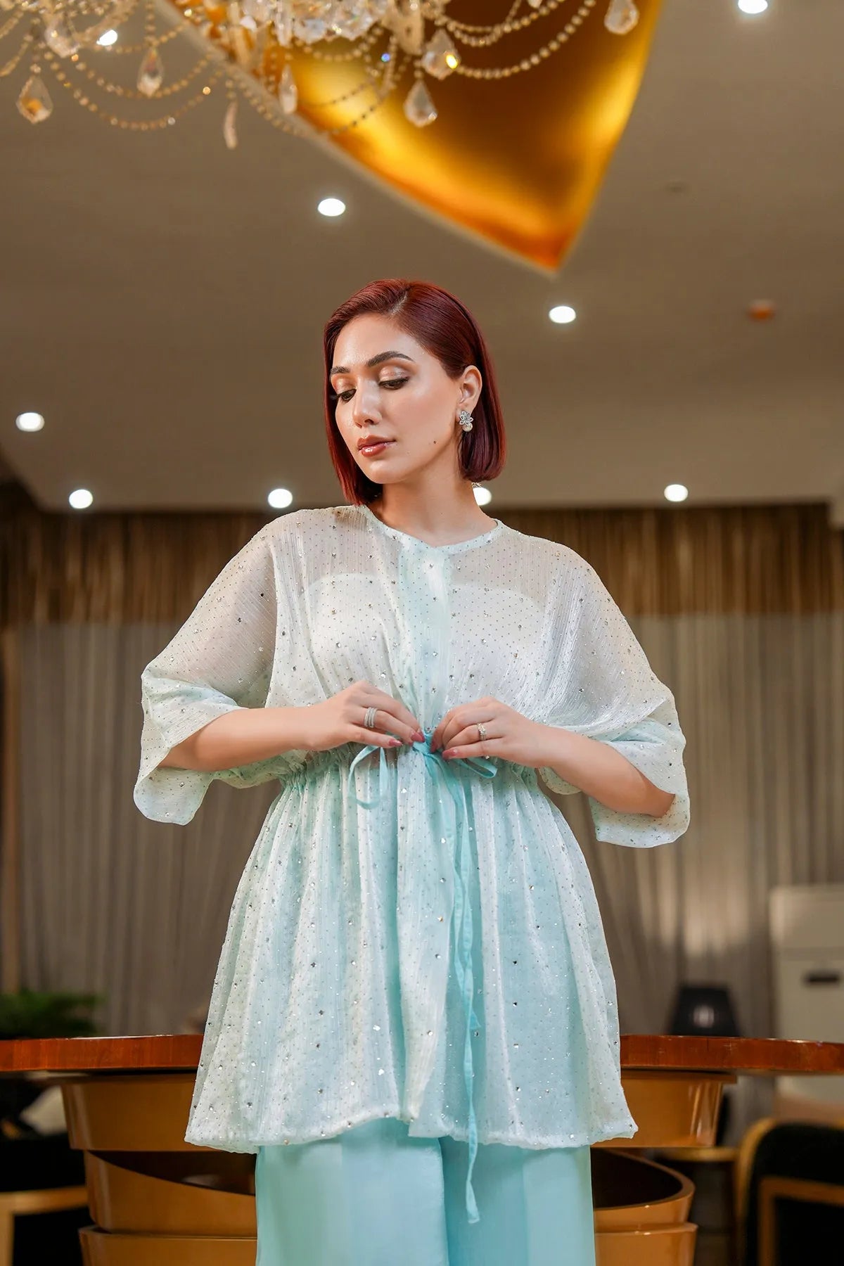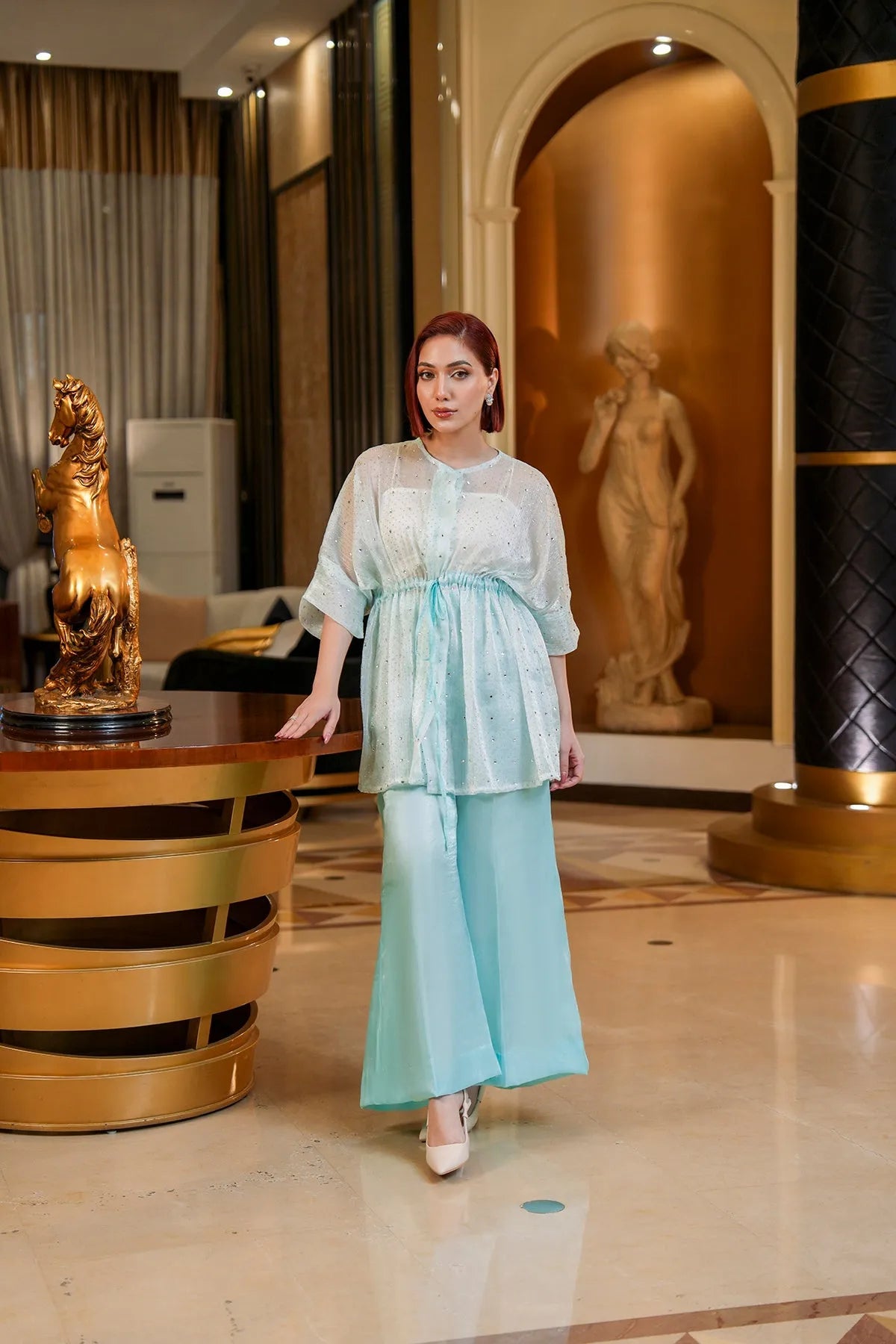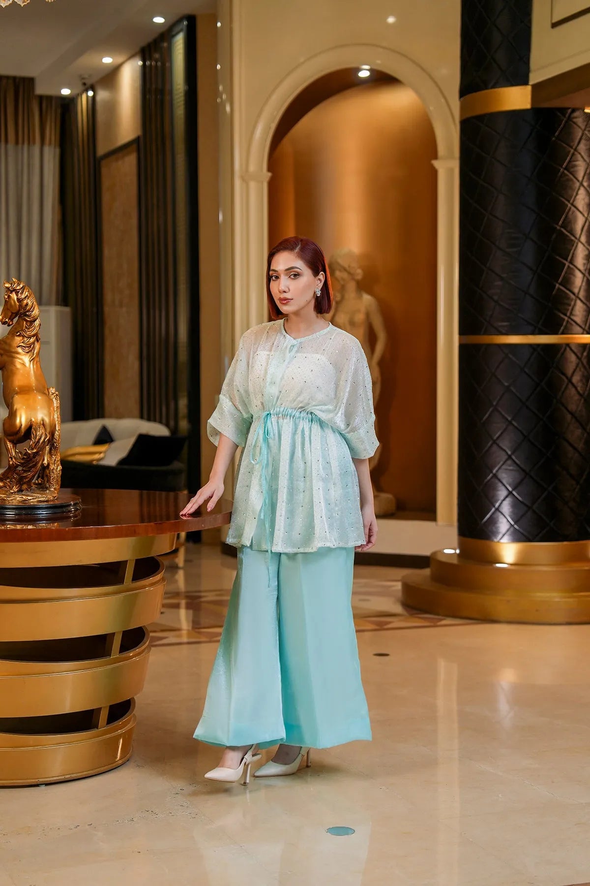 Paired with soft, loose trousers, the set offers effortless movement and modern sophistication. Perfect for semi-formal occasions, festive gatherings, or elevated casual wear, this ensemble balances contemporary style with timeless craftsmanship.