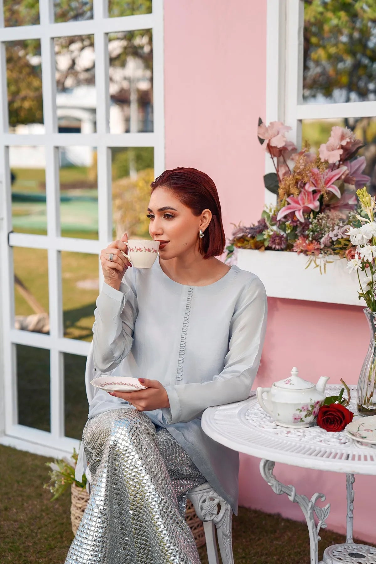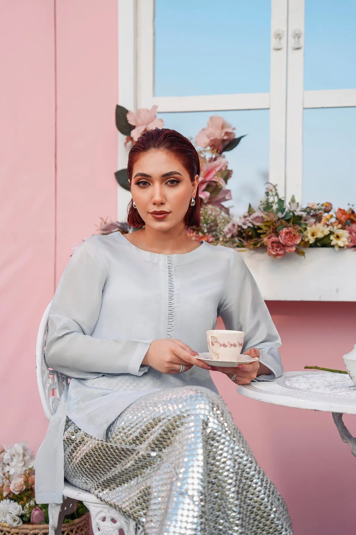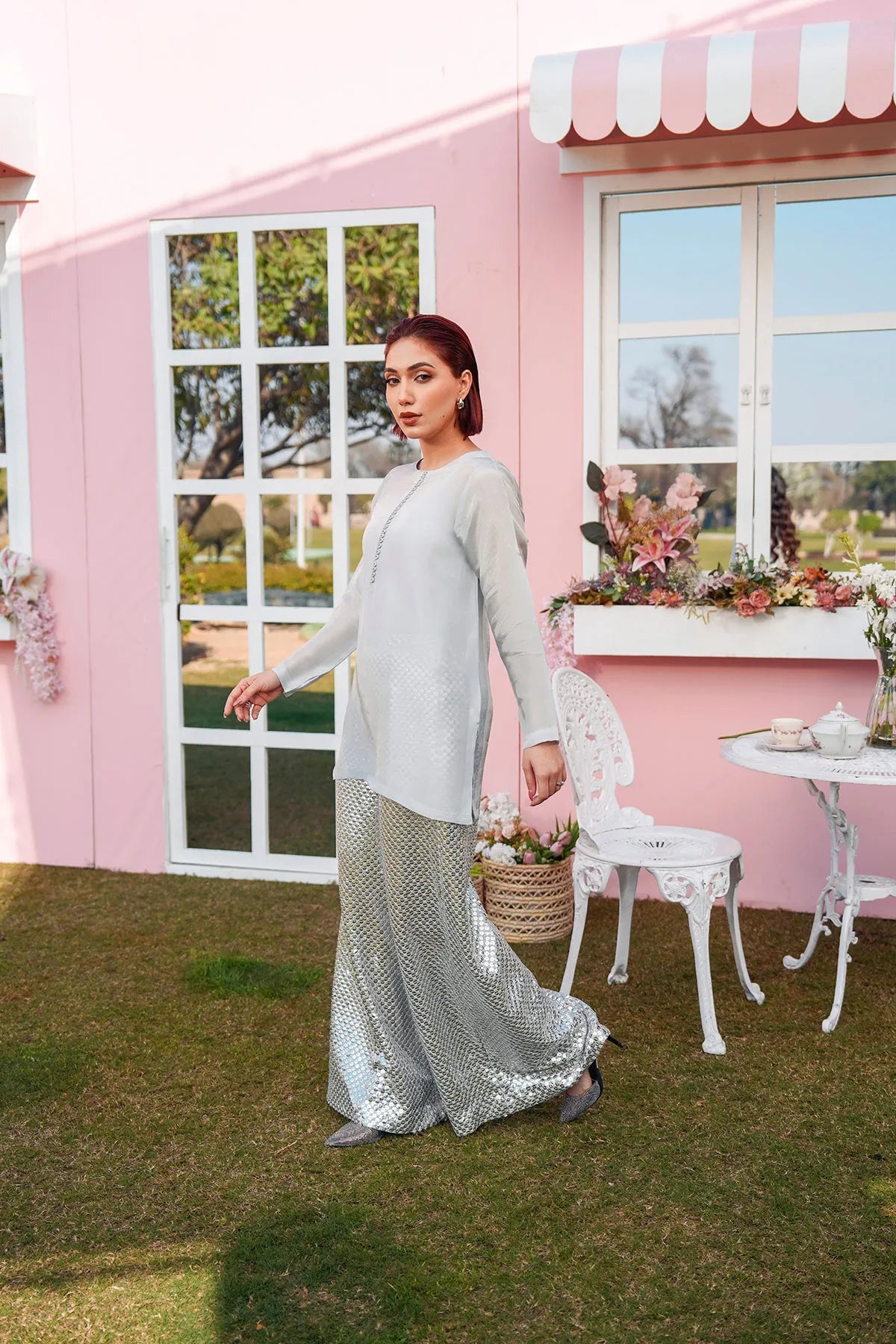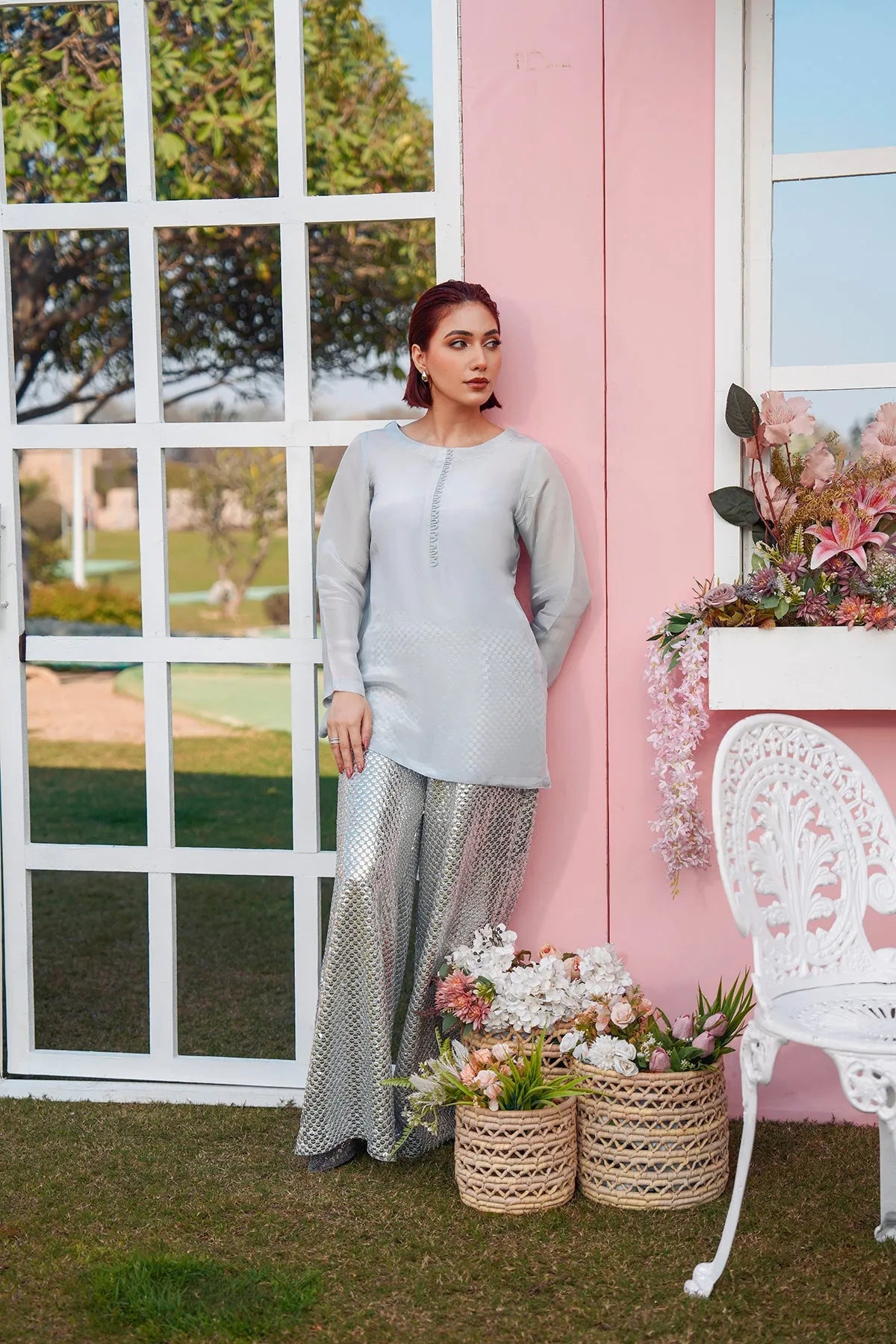 The trousers are adorned with delicate embroidery and shimmering silver sequins, adding a festive and artisanal touch. Lightweight, breathable, and designed for graceful movement, this ensemble is perfect for evening events, festive gatherings, or special celebrations.