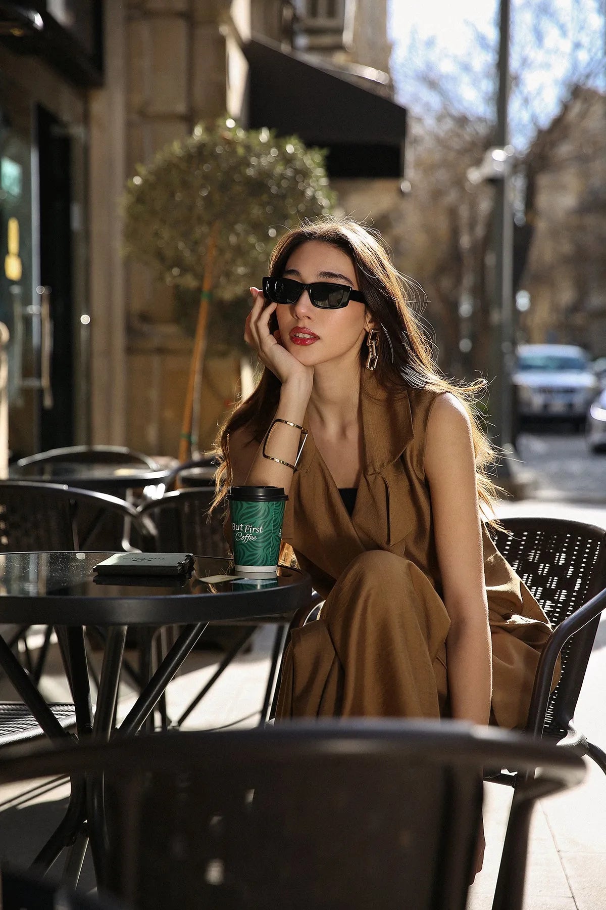 The rich earthy tone makes it a versatile wardrobe essential — perfect for workwear, casual gatherings, or day-to-evening styling. Minimal yet impactful, this ensemble delivers polished simplicity with a modern touch.