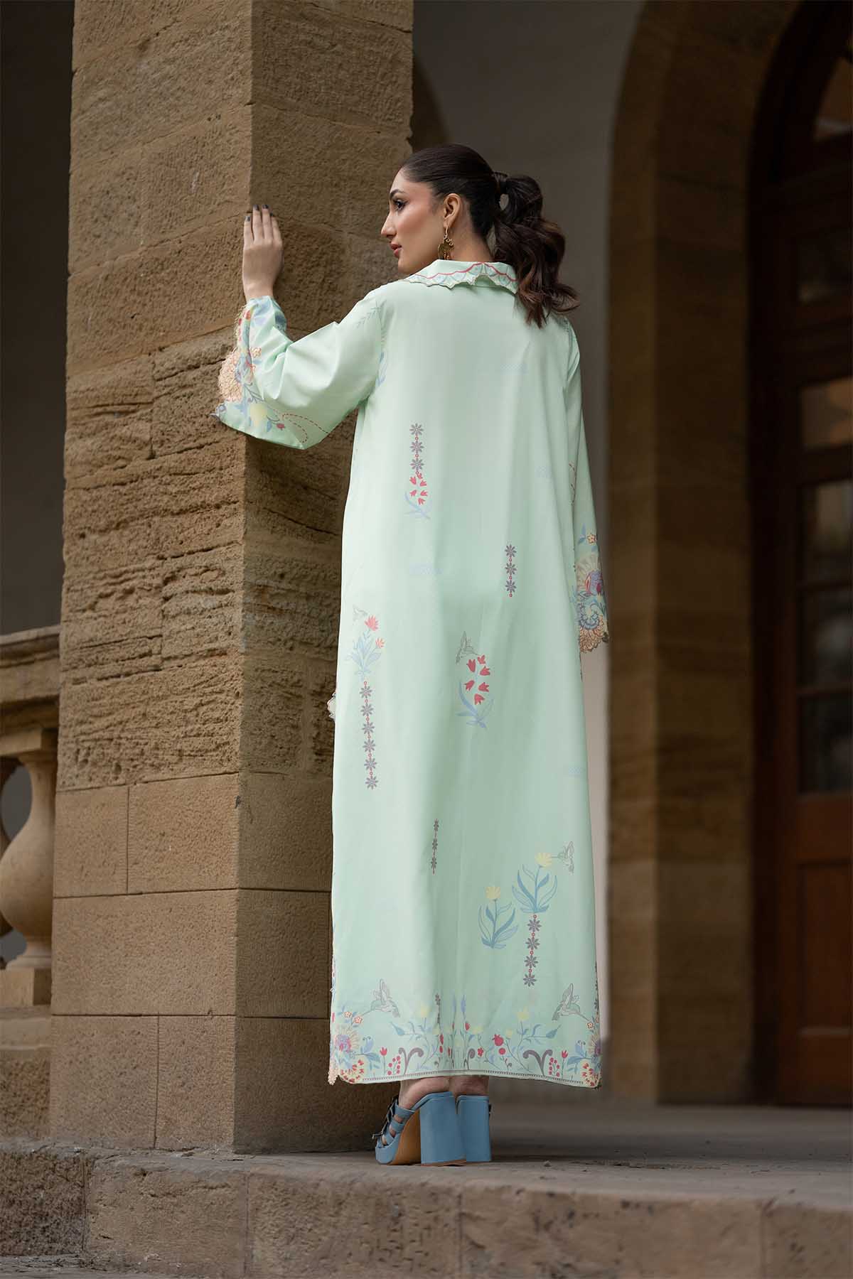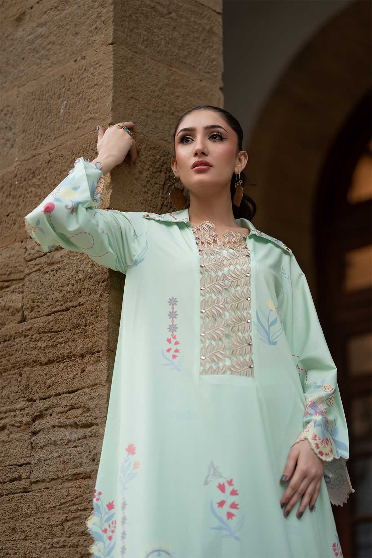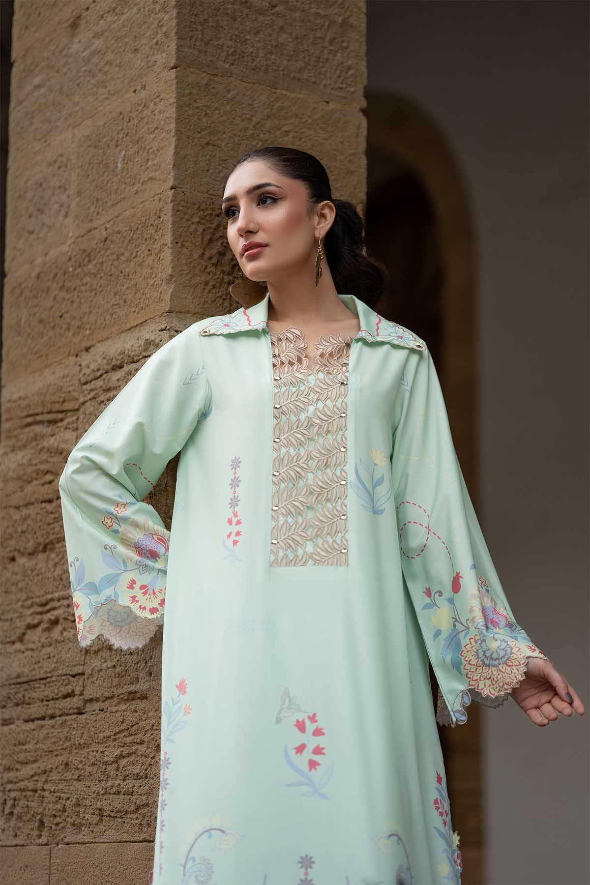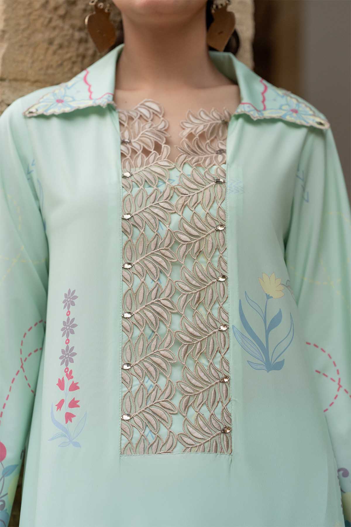 Meethi Yaadein -Eid Festive:This Elegant Crepe Silk Mint Green Ensemble Showcases A Timeless Silhouette Elevated With Delicate Detailing. The Long, A-Cut Kurta Is Adorned With Soft Pastel Floral And Vine-Inspired Prints, Creating A Graceful, Flowing Visual Across The Fabric. A Distinctive Embroidered Front Panel Adds Texture And Refinement, Drawing Focus To The Neckline While Maintaining A Clean, Structured Look.