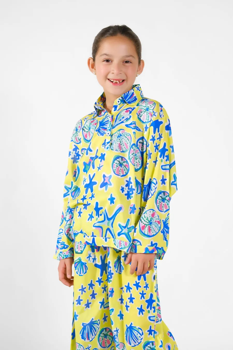 Introducing the delightful "Marina" ensemble, a burst of joy in radiant yellow adorned with enchanting blue and pink shells and starfish. This outfit encapsulates the warmth of the sun and the whimsy of the sea, combining vibrant hues to create a harmonious symphony of color. Each shell and starfish detail dances across the fabric, invoking the tranquility of coastal shores and the allure of underwater wonders. Whether frolicking in the sand or basking in the sun's glow, the "Marina" outfit radiates charm and elegance, promising to infuse every moment with the magic of summertime bliss.
