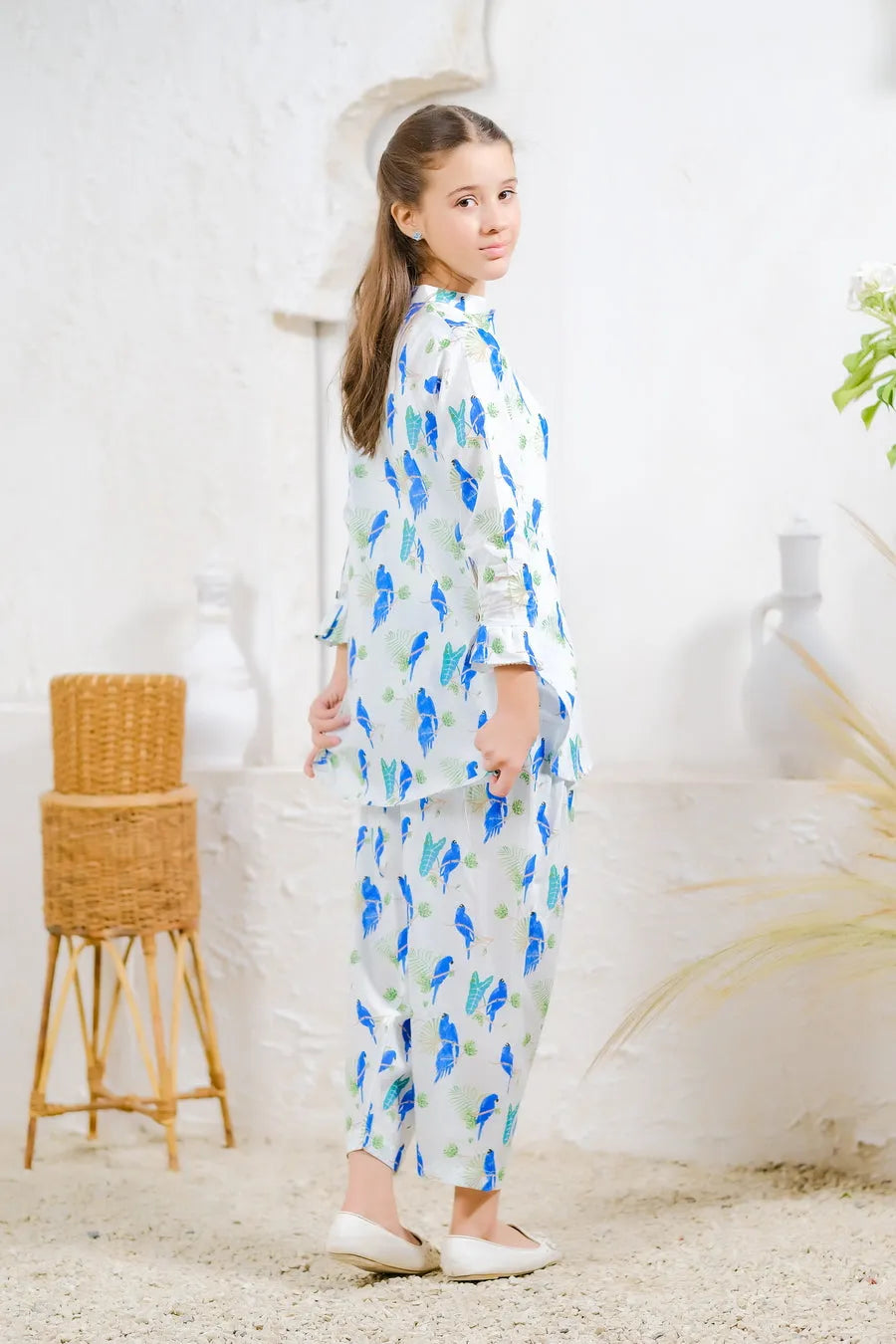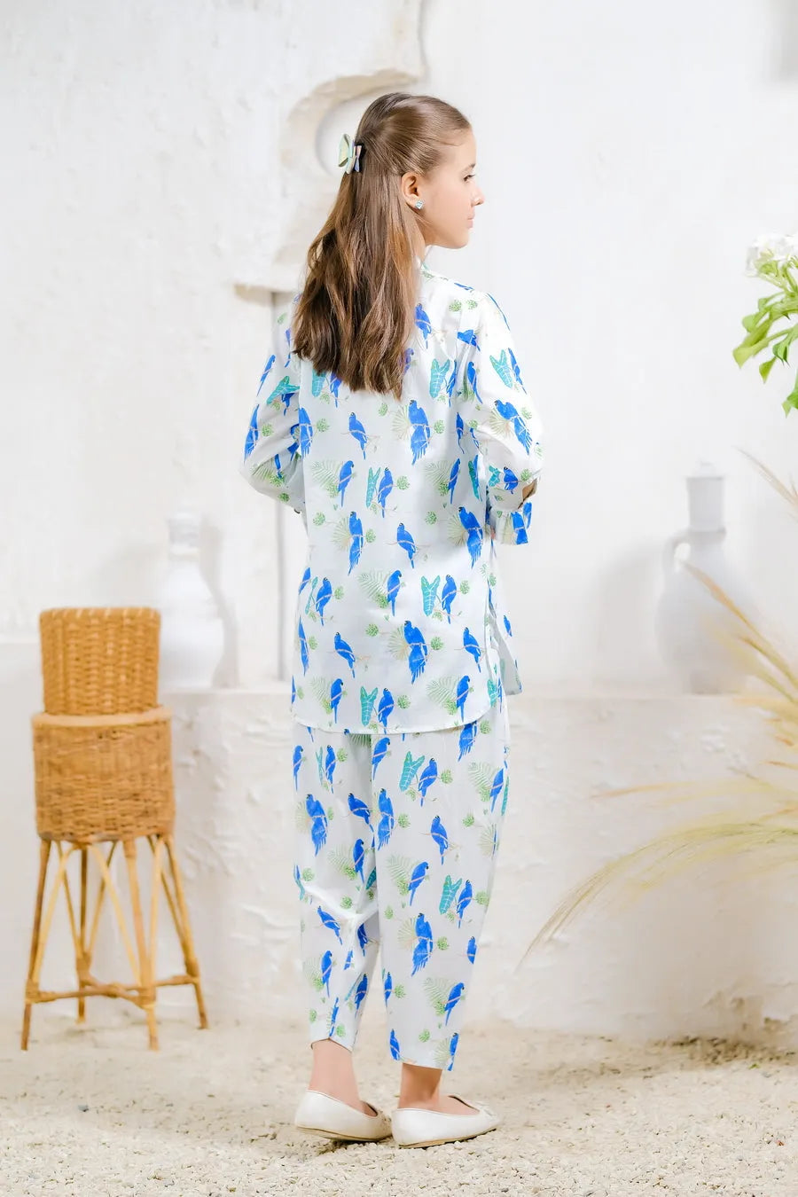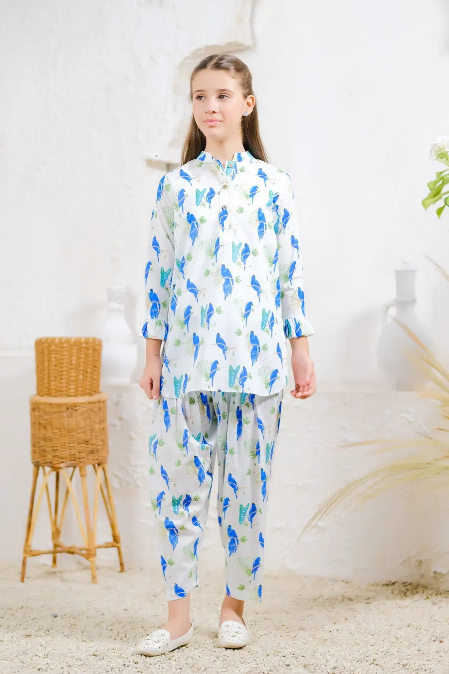 This soft white and blue 2-piece set features a striking bird pattern, perfect for adding a whimsical touch to your child's wardrobe. The lawn material provides a lightweight, breathable fit ideal for any weather.