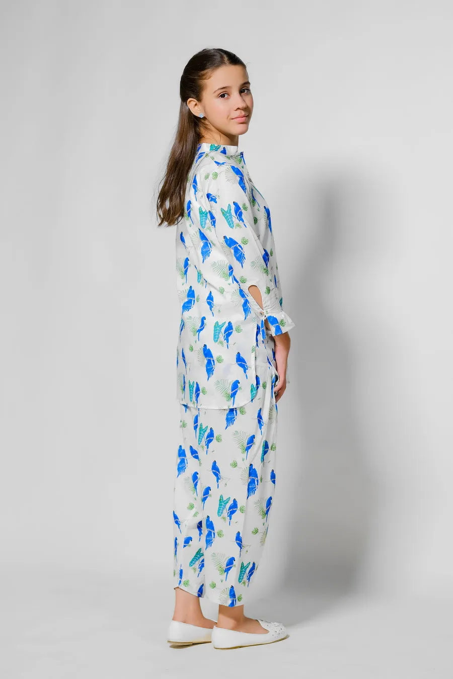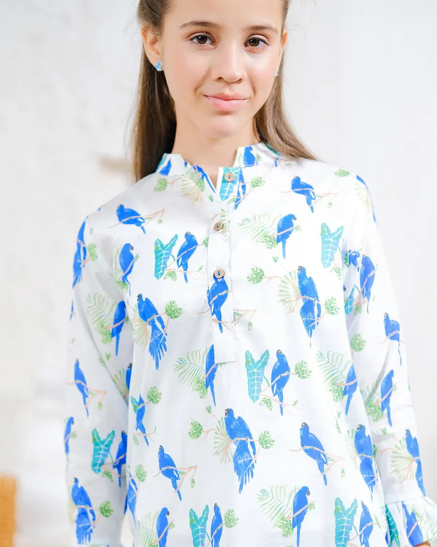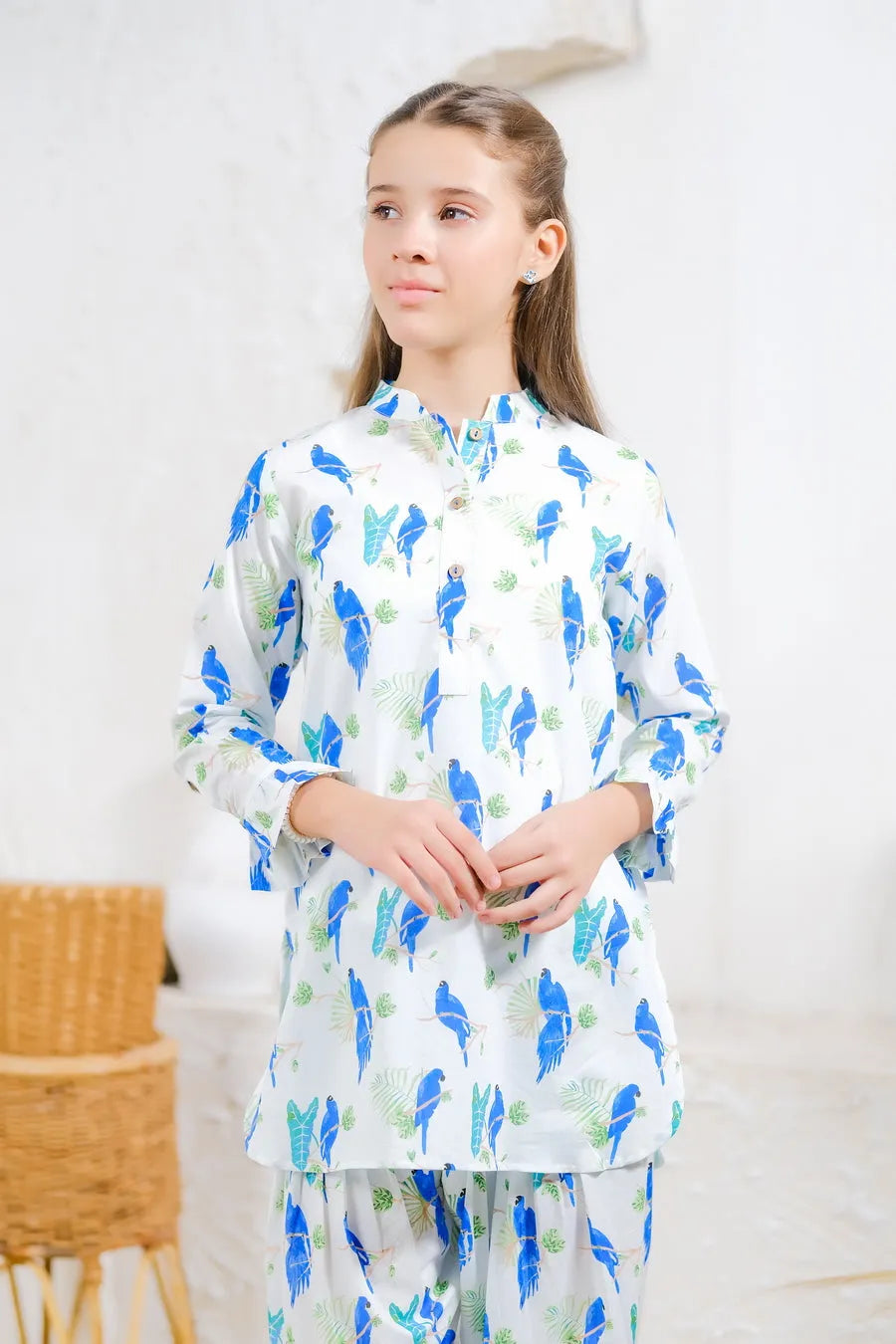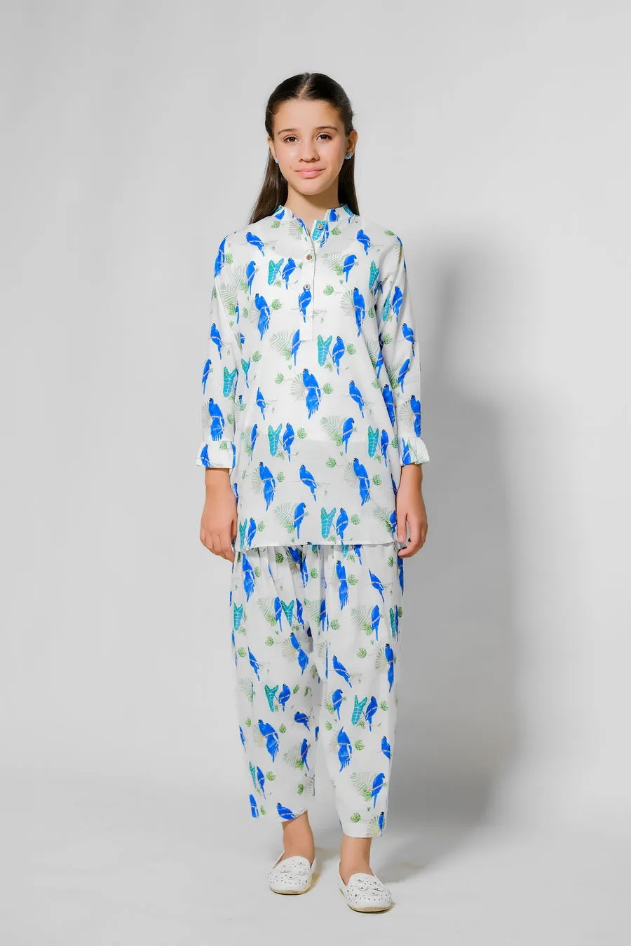 This soft white and blue 2-piece set features a striking bird pattern, perfect for adding a whimsical touch to your child's wardrobe. The lawn material provides a lightweight, breathable fit ideal for any weather.