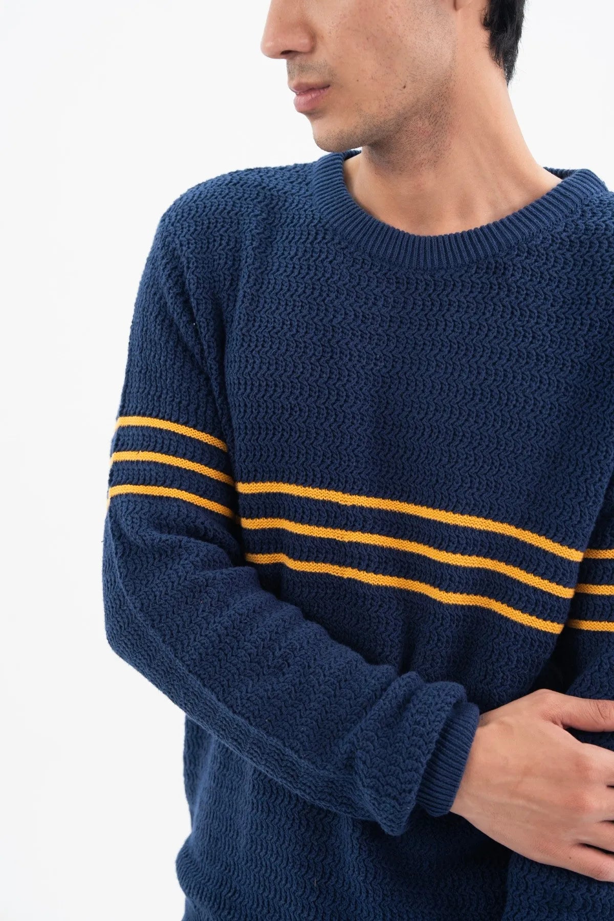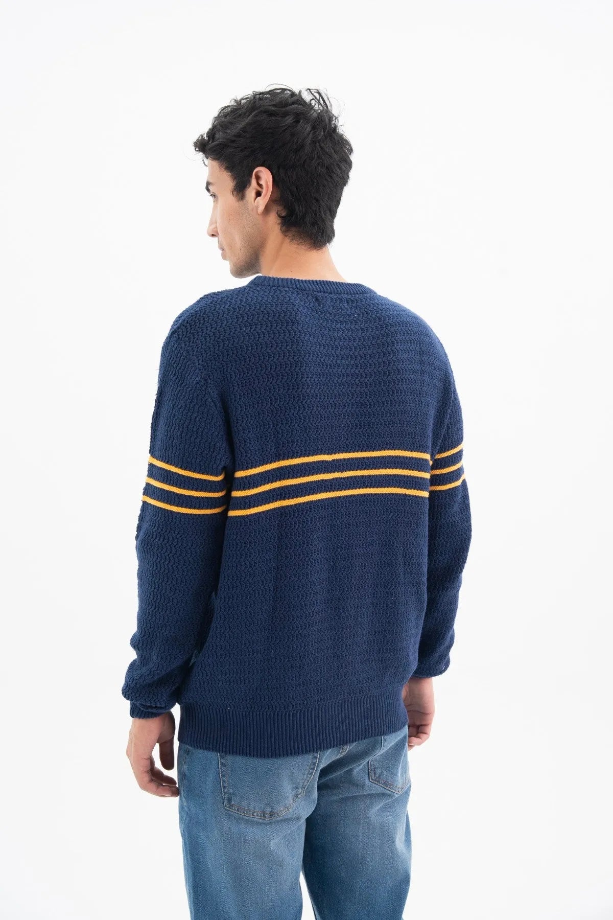 This knitted sweatshirt with stripes is made from 100% cotton using a jersey knit across 4 panels, ensuring a smooth, premium feel. The vibrant imperial blue base is contrasted by horizontal classic yellow lines that wrap around the front, back, and sleeves, creating a striking visual form. Cut in a comfortable regular fit with full sleeves and a classic crew neck, the shape is secured by ribbed neck, cuffs, and hem details.