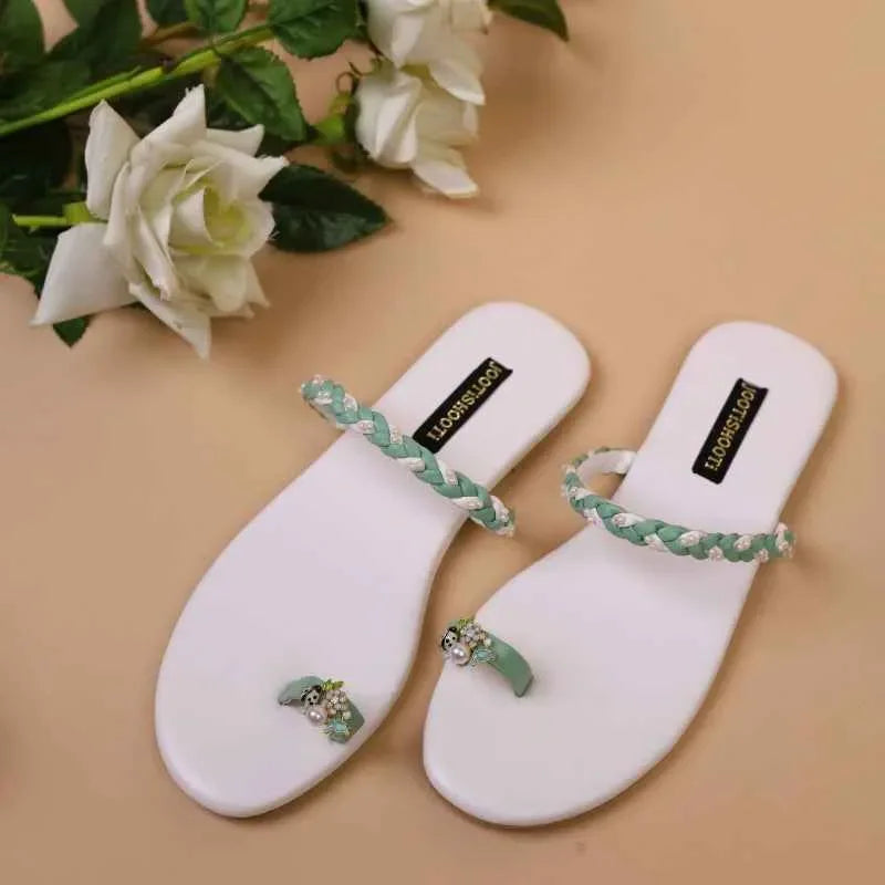 A fresh breath of style—these slip-ons blend mint and ivory in a braided embrace, crowned with a delicate toe embellishment. Earthy yet ethereal, they’re made for those who walk with grace and a hint of wanderlust.